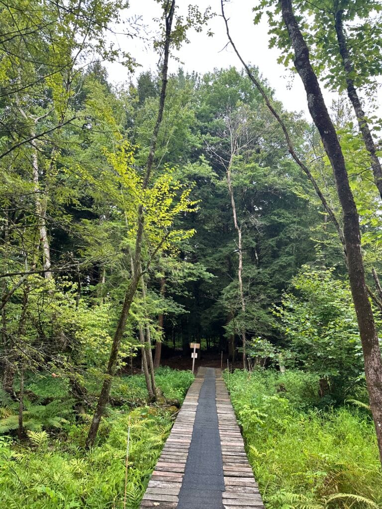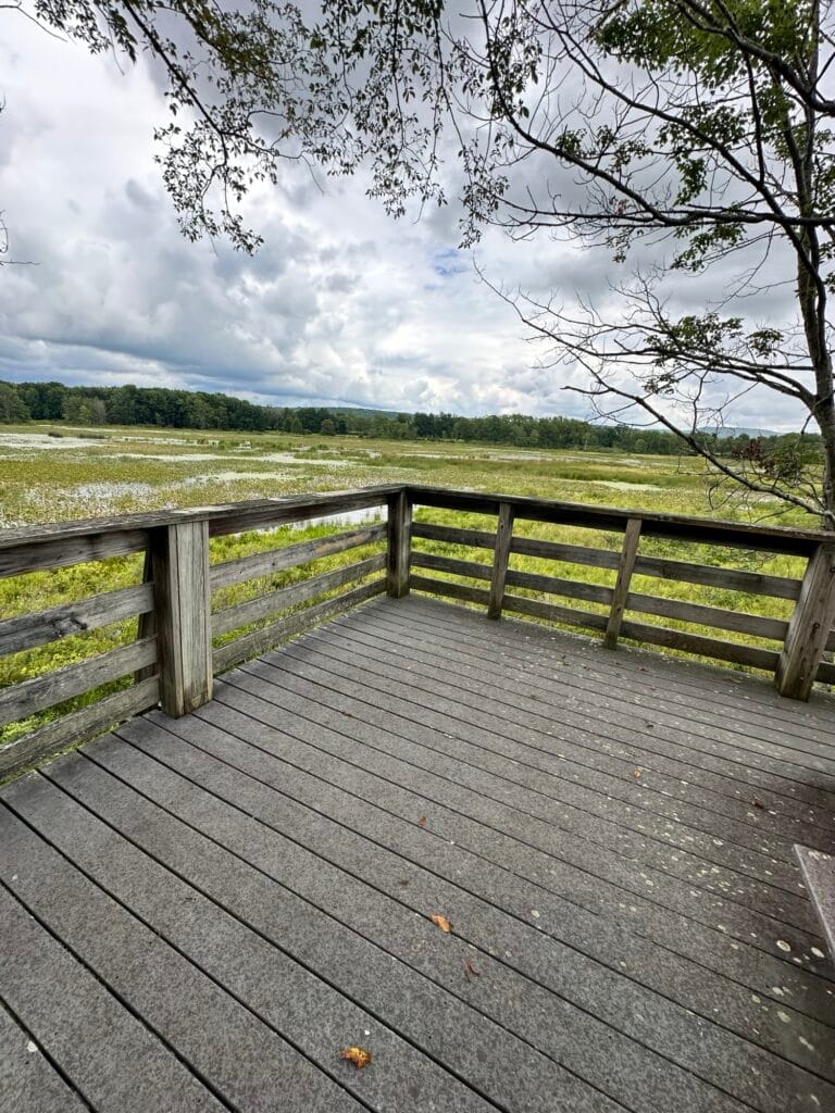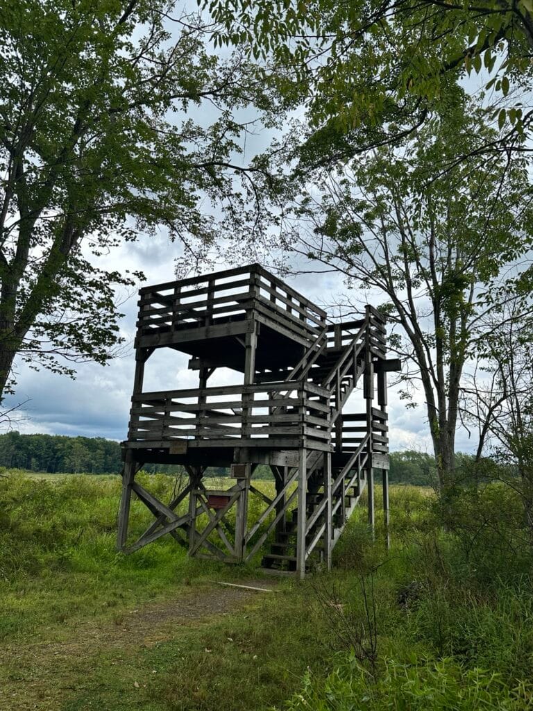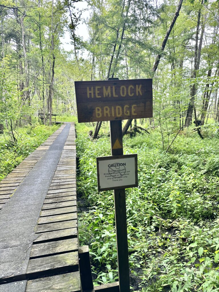 This nature center is located 2.5 hours southwest of Rochester, NY and 1.5 hours south of Buffalo, NY. The Big Pond Trail is a 2 mile long loop trail blazed with yellow triangles and takes you through fields, forests and wetlands. This trail shares sections with the Overlook Trail and the Spatterdock Trail. There are side trails to lookout towers. There are boardwalks, benches, and more! Dogs are NOT allowed at the nature center.