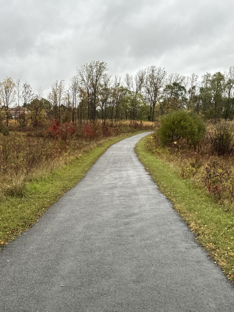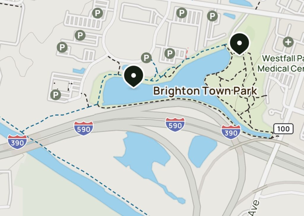 AllTrails: Brighton Town Park Trail (this 1.8 mile loop includes the paved path, the dirt trail, and circles the pond)