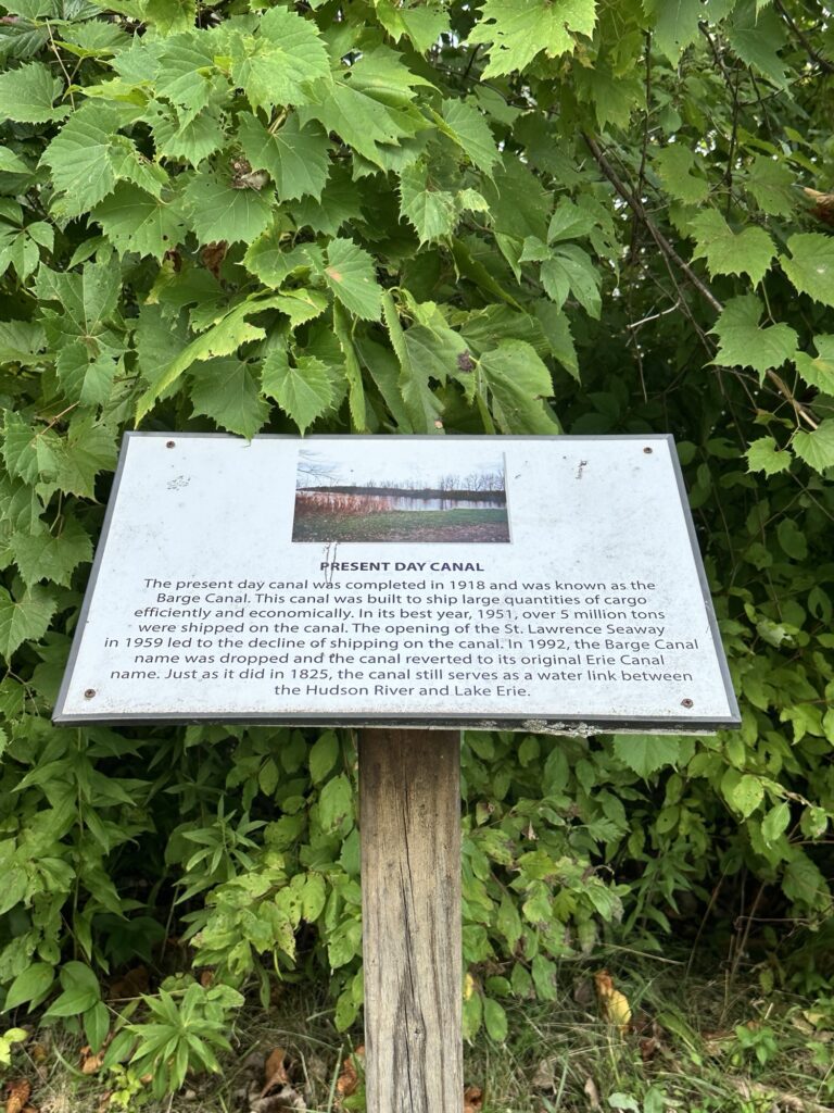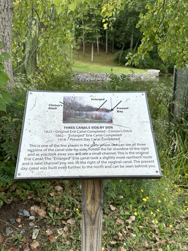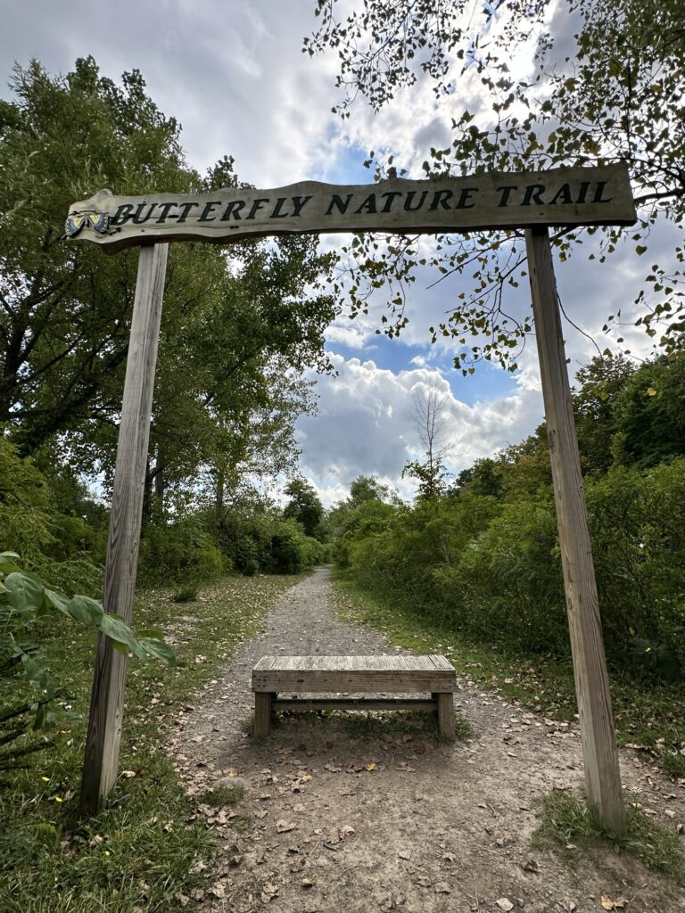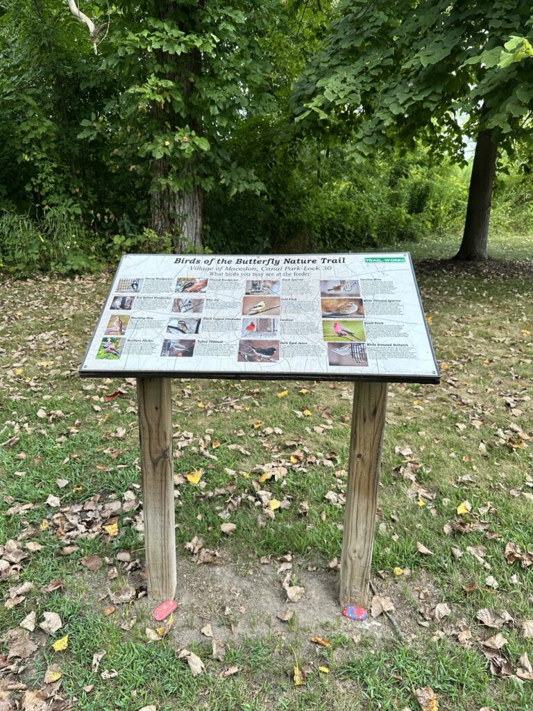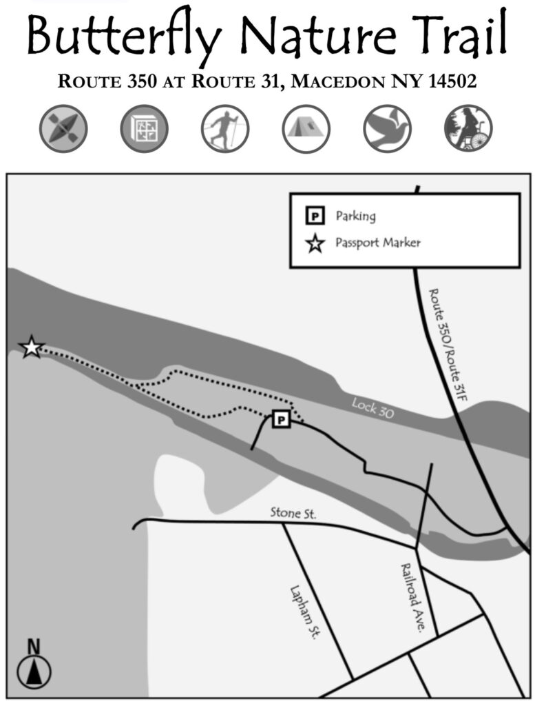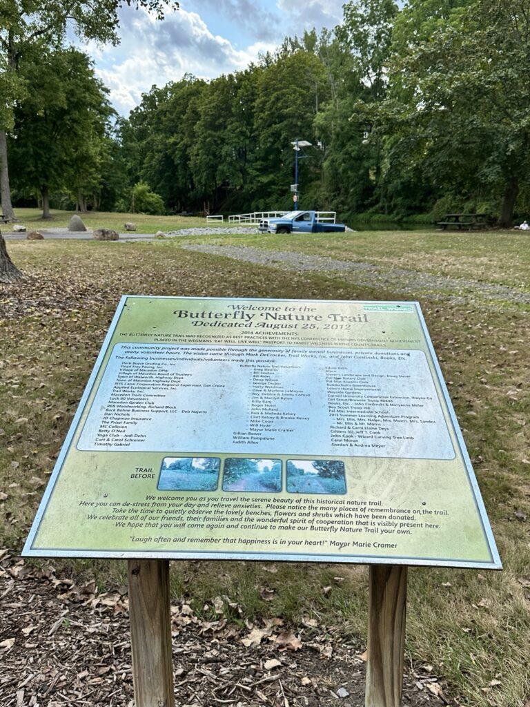 This unique trail located 25 minutes southeast of Rochester is considered a “Forever Wild for Everyone Trail”. Along this accessible, stone dust trail there are numerous things to look at including informational signs about birds and butterflies, gardens, fairy houses, benches, painted rocks, and some old relics and info about the history of the Erie Canal. There is also a short storybook walk. The entire trail including the loop and going out to the point is about a half mile. In the summer, there are numerous flowers and we saw 6 species of butterfly during our visit! A neat feature about this park is that you can see all three versions of the Erie Canal side by side: the original canal (called Clinton’s Ditch), the enlarged Erie Canal, and the present-day Erie Canal. Leashed dogs are allowed. There was a porta potty when we visited, as well as a simple swing set, balance beam, and spinning seat. You can also walk over and see Lock 30 with some informational signs.