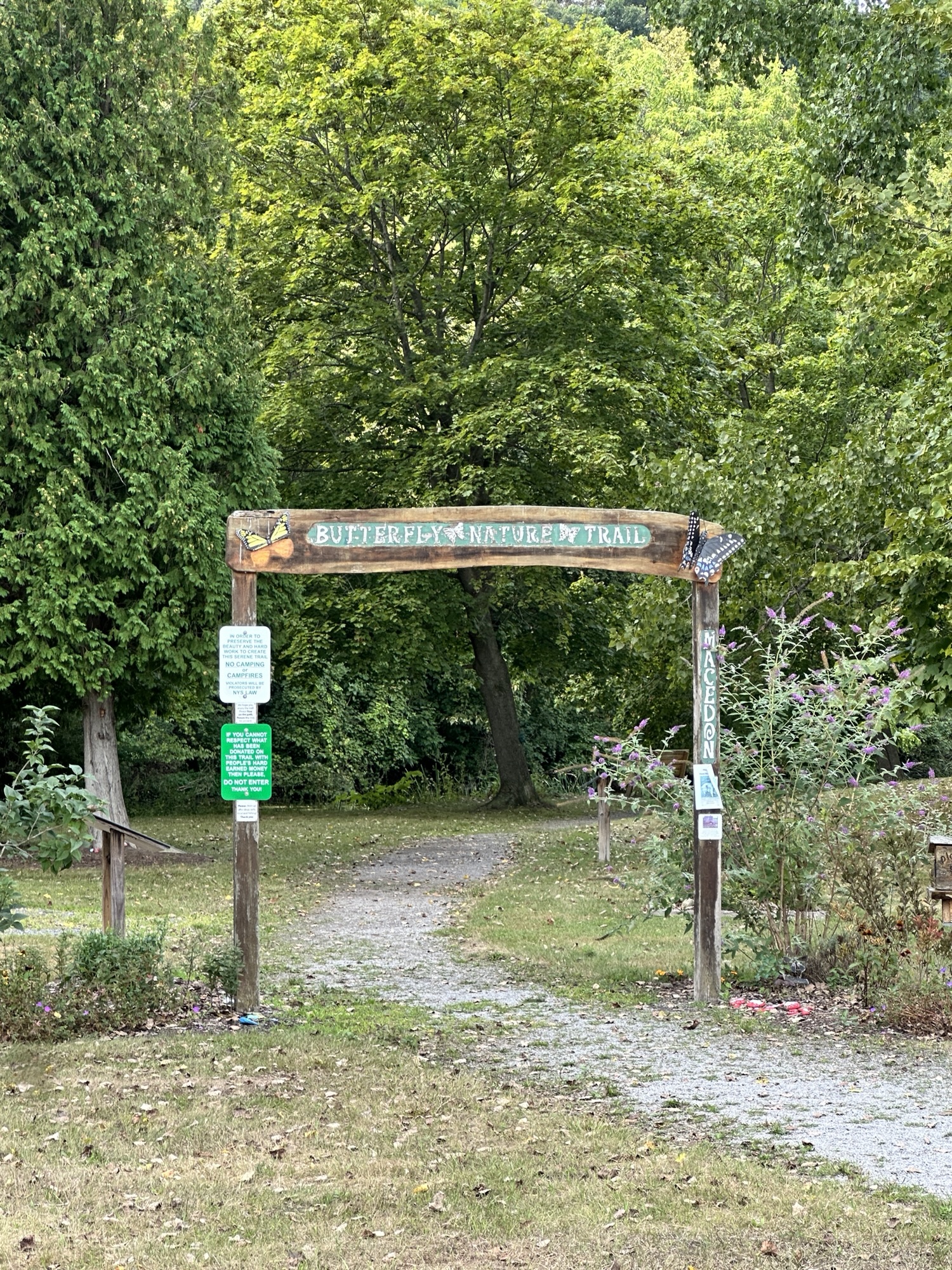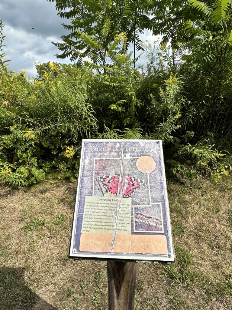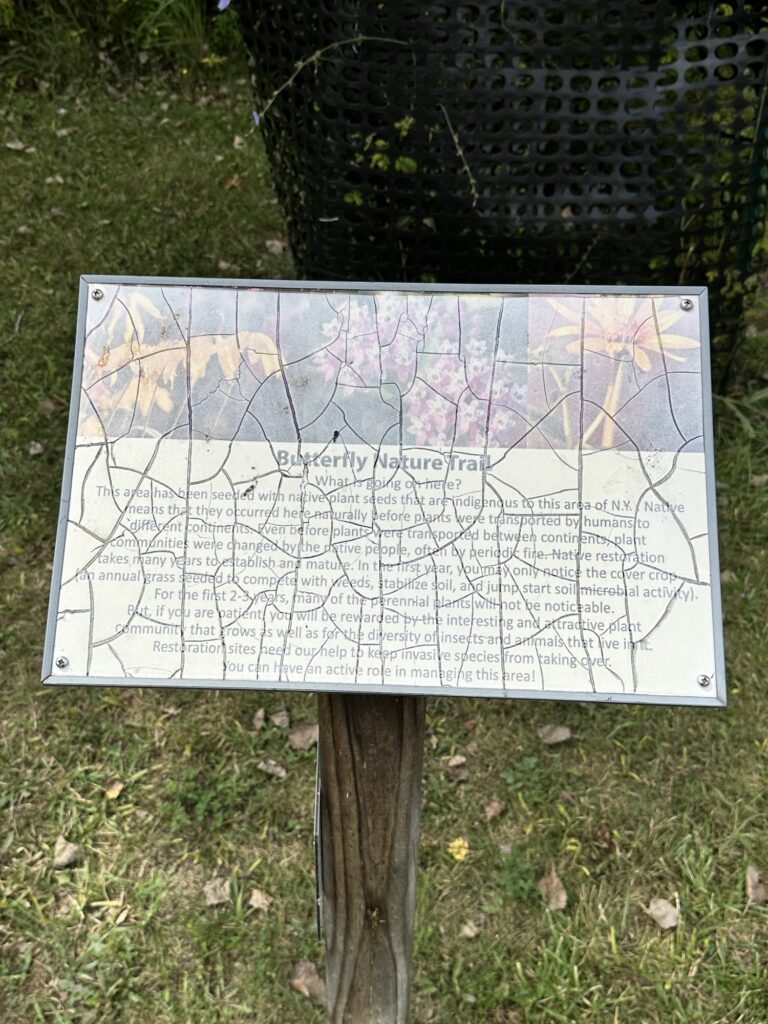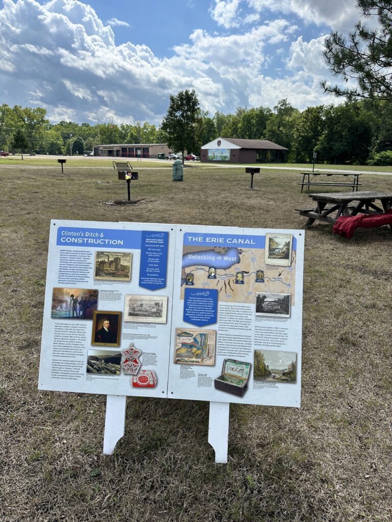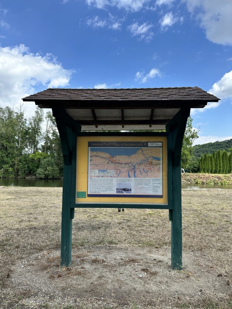 This unique trail located 25 minutes southeast of Rochester is considered a “Forever Wild for Everyone Trail”. Along this accessible, stone dust trail there are numerous things to look at including informational signs about birds and butterflies, gardens, fairy houses, benches, painted rocks, and some old relics and info about the history of the Erie Canal. There is also a short storybook walk. The entire trail including the loop and going out to the point is about a half mile. In the summer, there are numerous flowers and we saw 6 species of butterfly during our visit! A neat feature about this park is that you can see all three versions of the Erie Canal side by side: the original canal (called Clinton’s Ditch), the enlarged Erie Canal, and the present-day Erie Canal. Leashed dogs are allowed. There was a porta potty when we visited, as well as a simple swing set, balance beam, and spinning seat. You can also walk over and see Lock 30 with some informational signs.