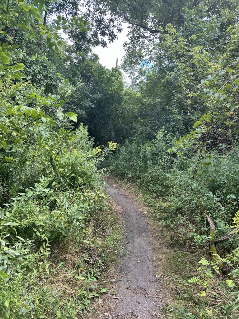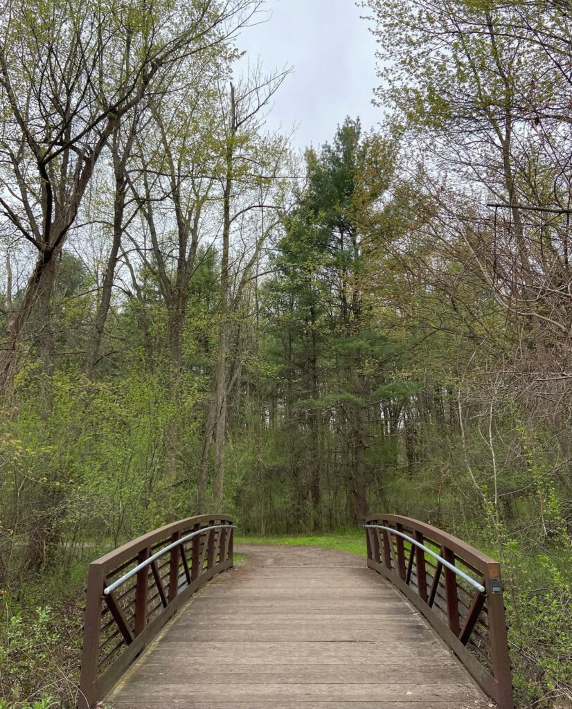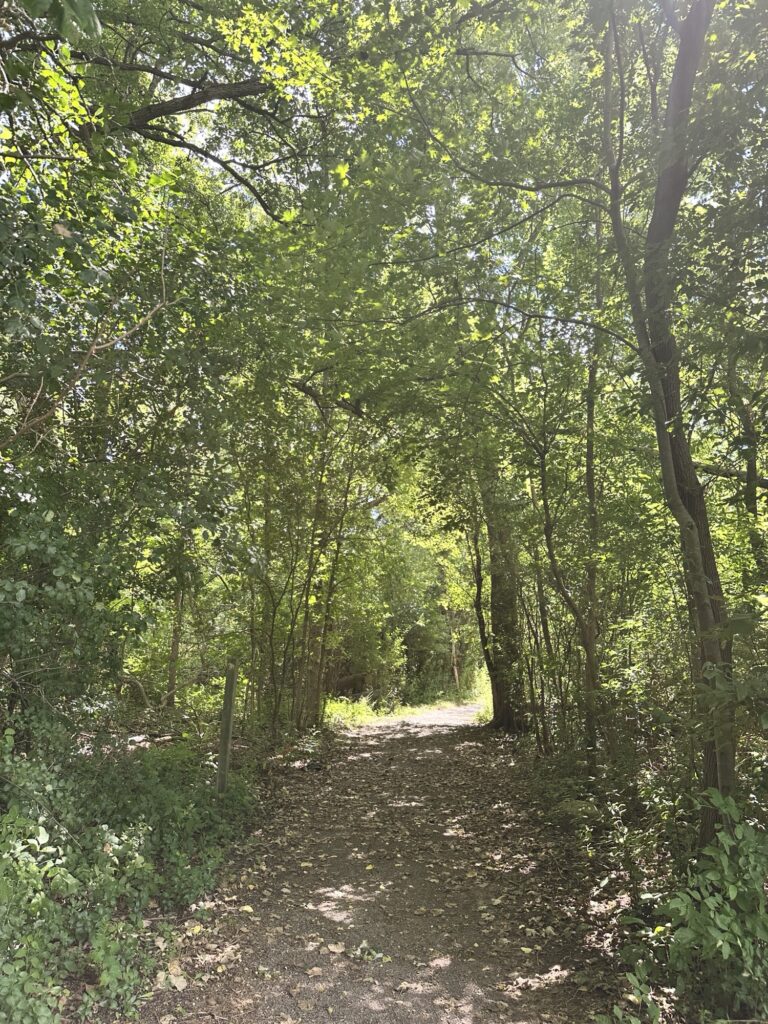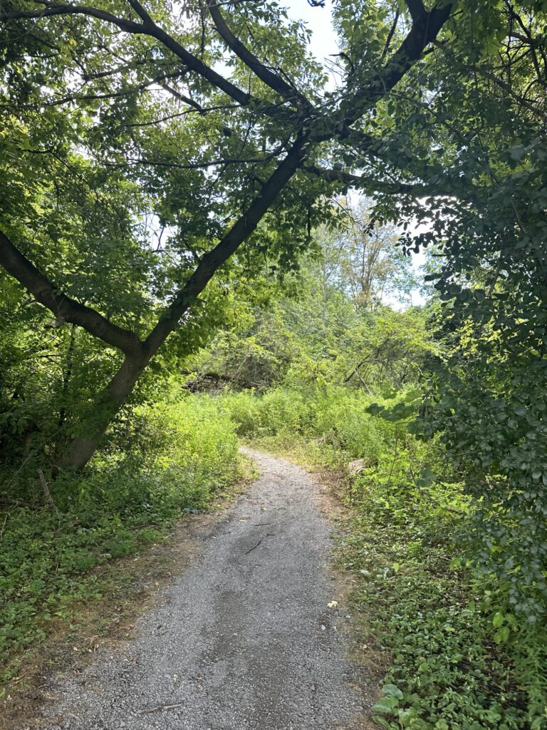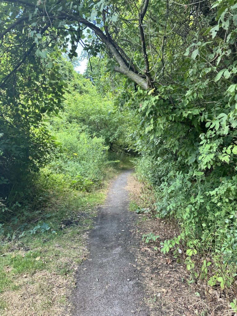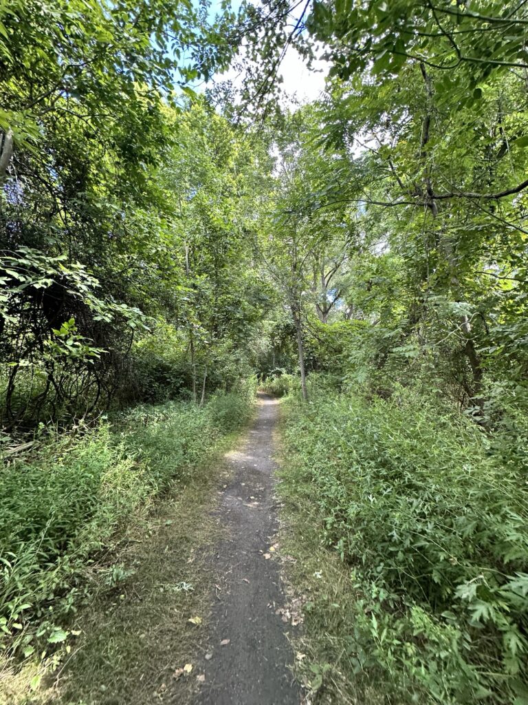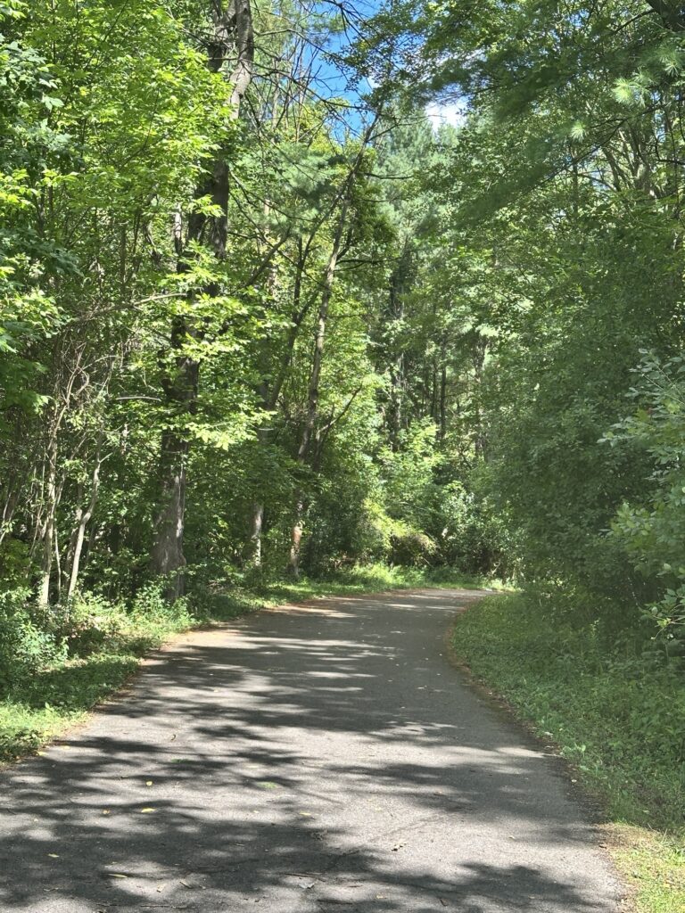 • If you continue walking past the amphitheater and soccer fields, the path heads into the trees there is a nice little bridge over a stream and then the path meets up with the Rochester, Syracuse, and Eastern Trail (RS&E). This pretty tree-lined path has some power lines but still feels like you’ve escaped into the woods for a bit! (This is shown in yellow on the map below). If you turn right, you can take the path all the way to Ayrault Road where you can turn right and make a loop back to the parking lot (blue line on the map below).You could also reverse your path to avoid walking along a busy road. I didn’t walk north along the RS&E trail, but it looks like it goes all the way to the Erie Canal!