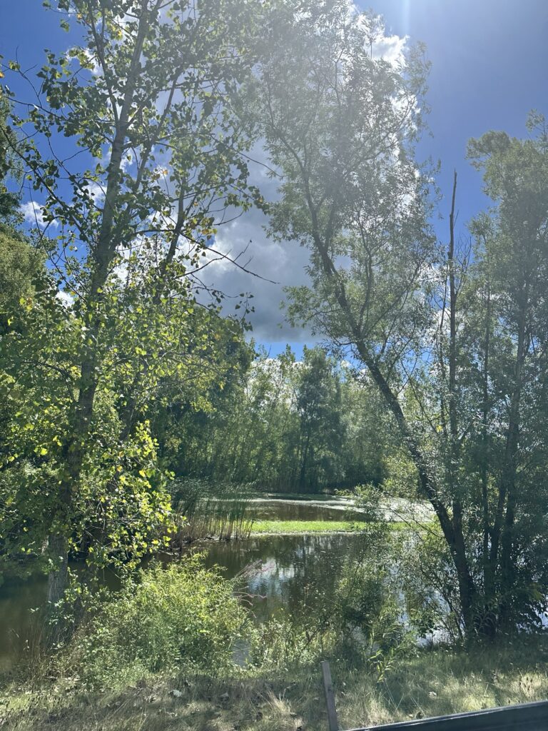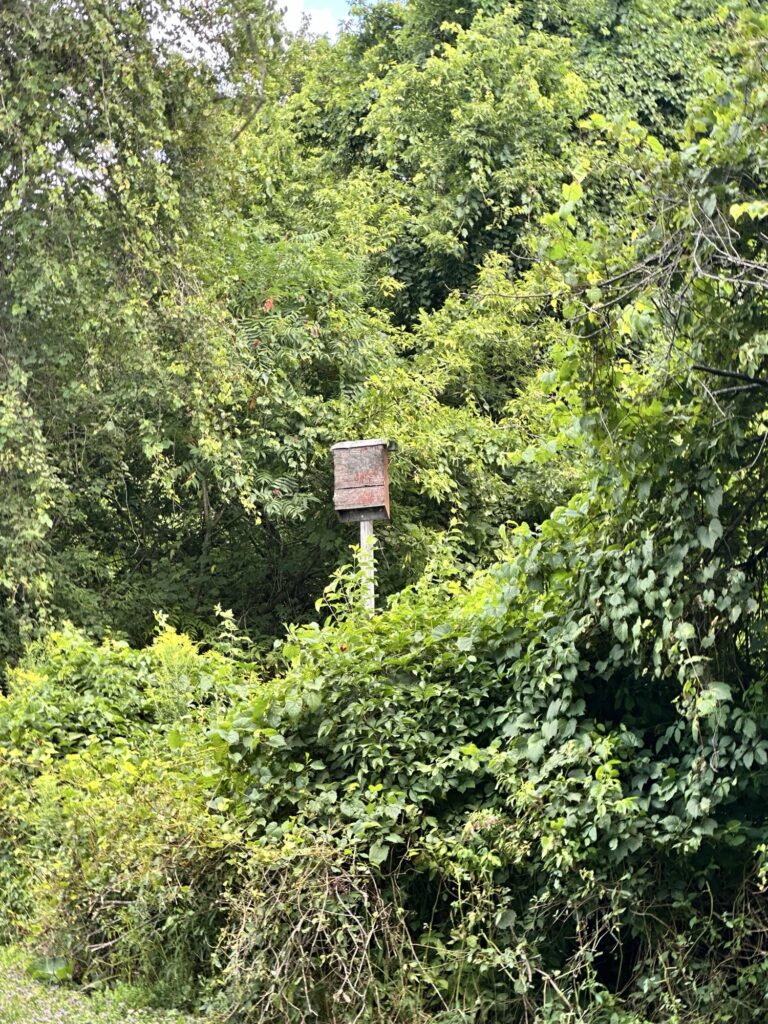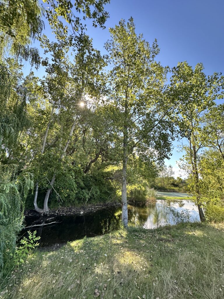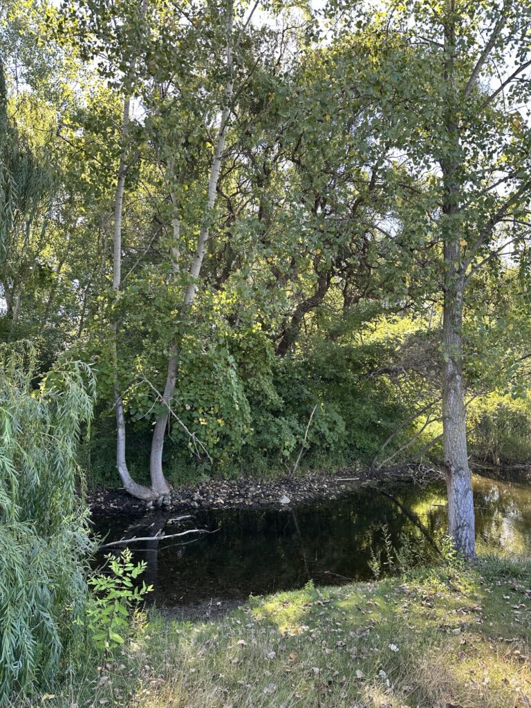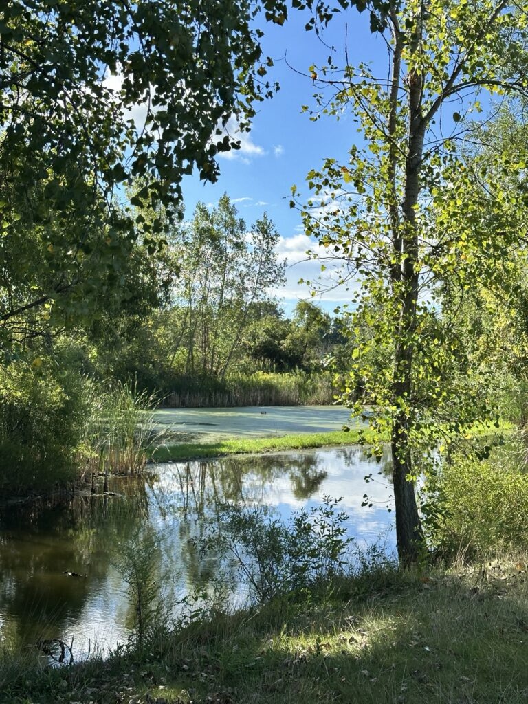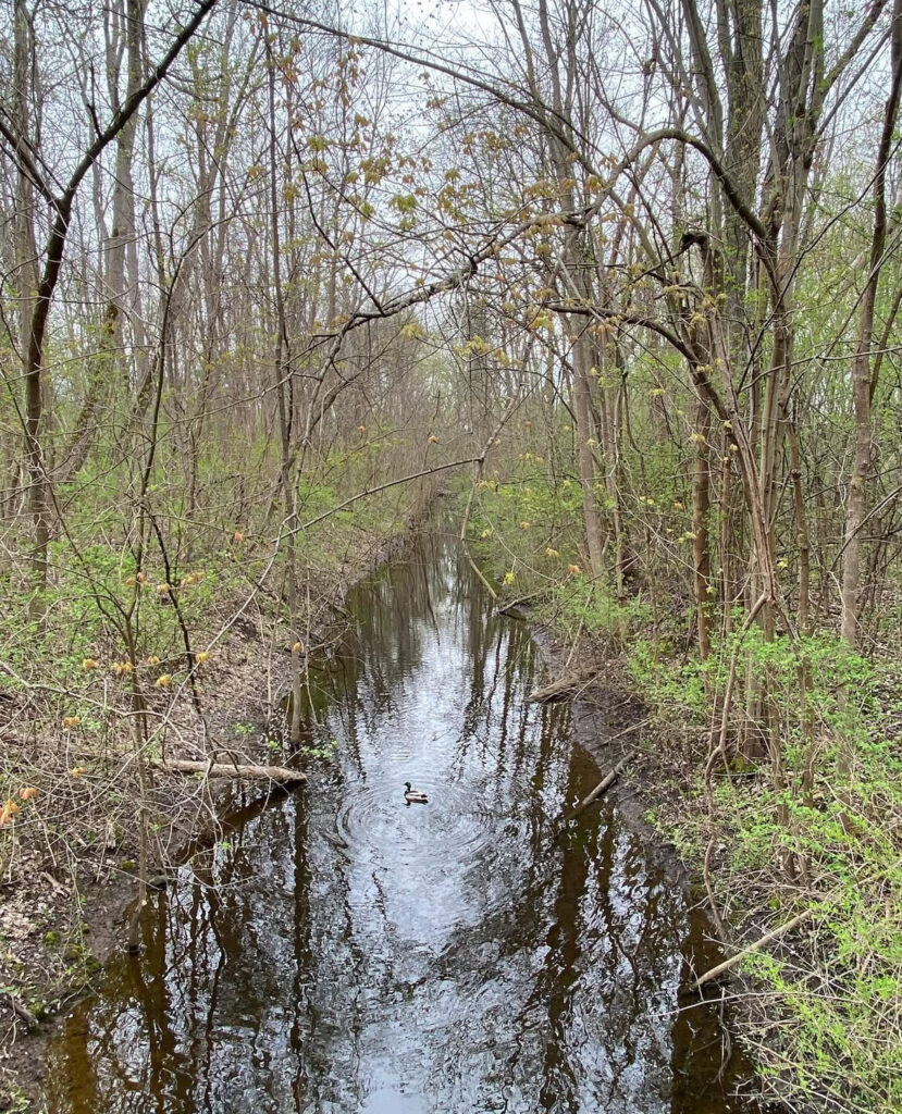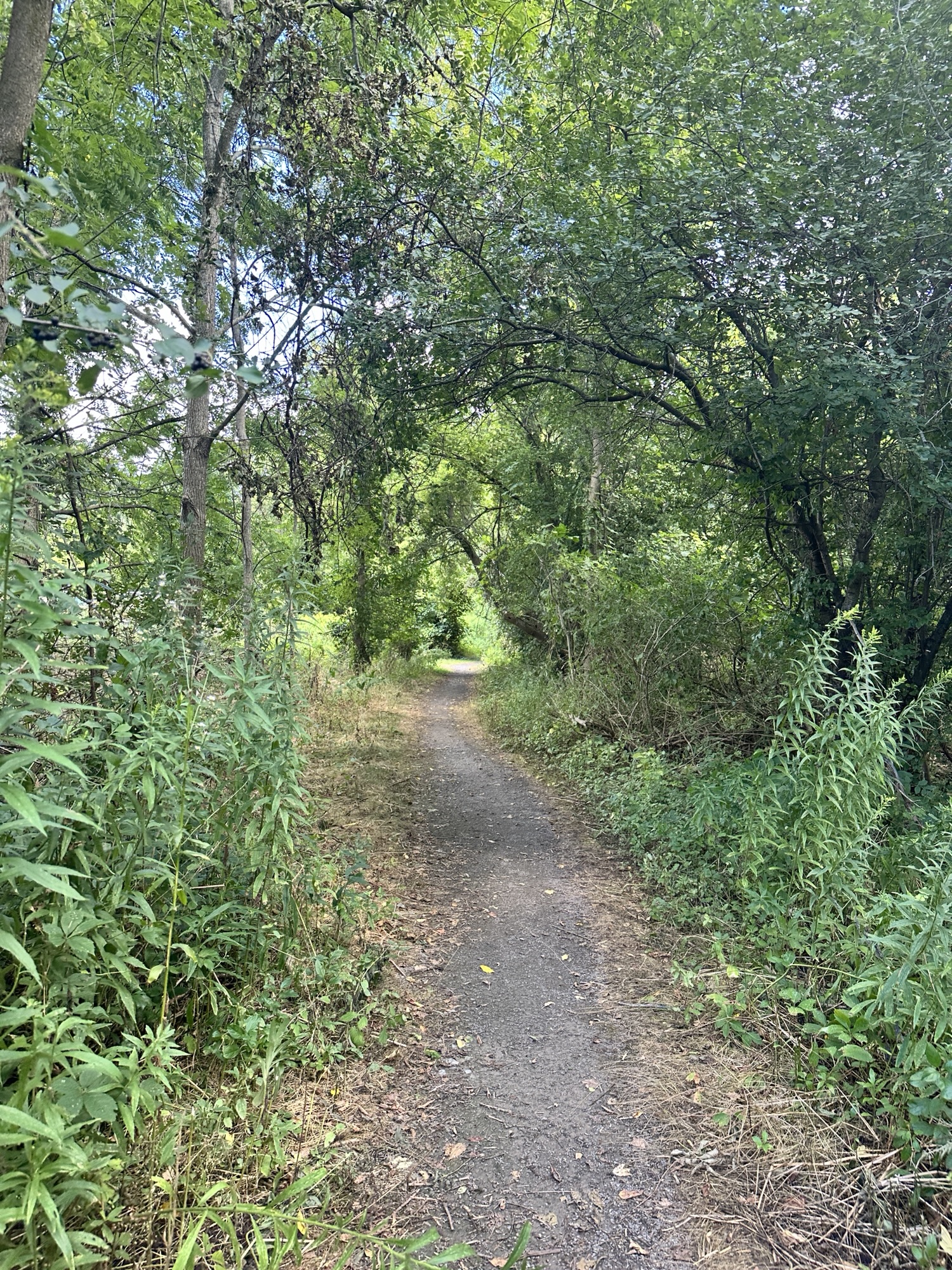 • If you continue walking past the amphitheater and soccer fields, the path heads into the trees there is a nice little bridge over a stream and then the path meets up with the Rochester, Syracuse, and Eastern Trail (RS&E). This pretty tree-lined path has some power lines but still feels like you’ve escaped into the woods for a bit! (This is shown in yellow on the map below). If you turn right, you can take the path all the way to Ayrault Road where you can turn right and make a loop back to the parking lot (blue line on the map below).You could also reverse your path to avoid walking along a busy road. I didn’t walk north along the RS&E trail, but it looks like it goes all the way to the Erie Canal!