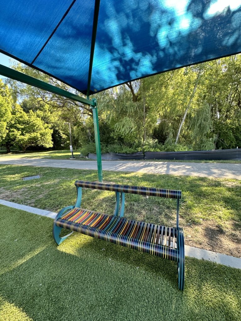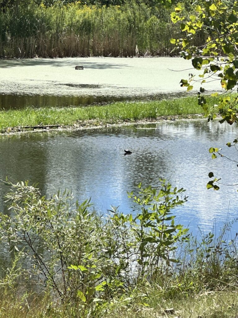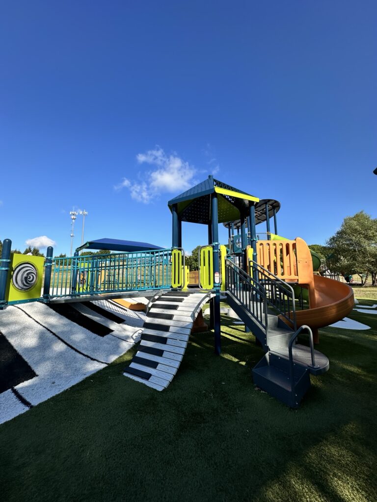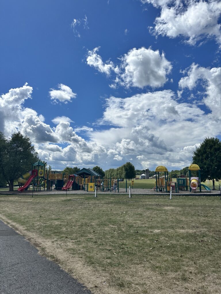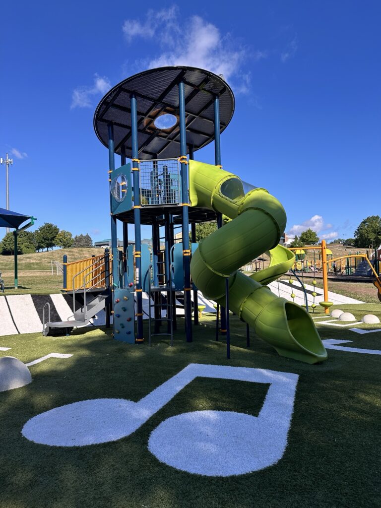 This park is located 25 minutes east of Rochester, NY. This park is located behind the Fairport Rec Center and is home of the amphitheater where performances occur. There is a brand new playground as of summer 2025 that is musical themed and has inclusive features. When we visited in August 2025, the older playground was also still there. There was also a temporary storywalk setup when we visited in August. There is a pond next to the playground where we saw a turtle! There are sports fields, public restrooms as well as porta potties near the ampitheater. Leashed dogs are allowed. The trails are stroller friendly.