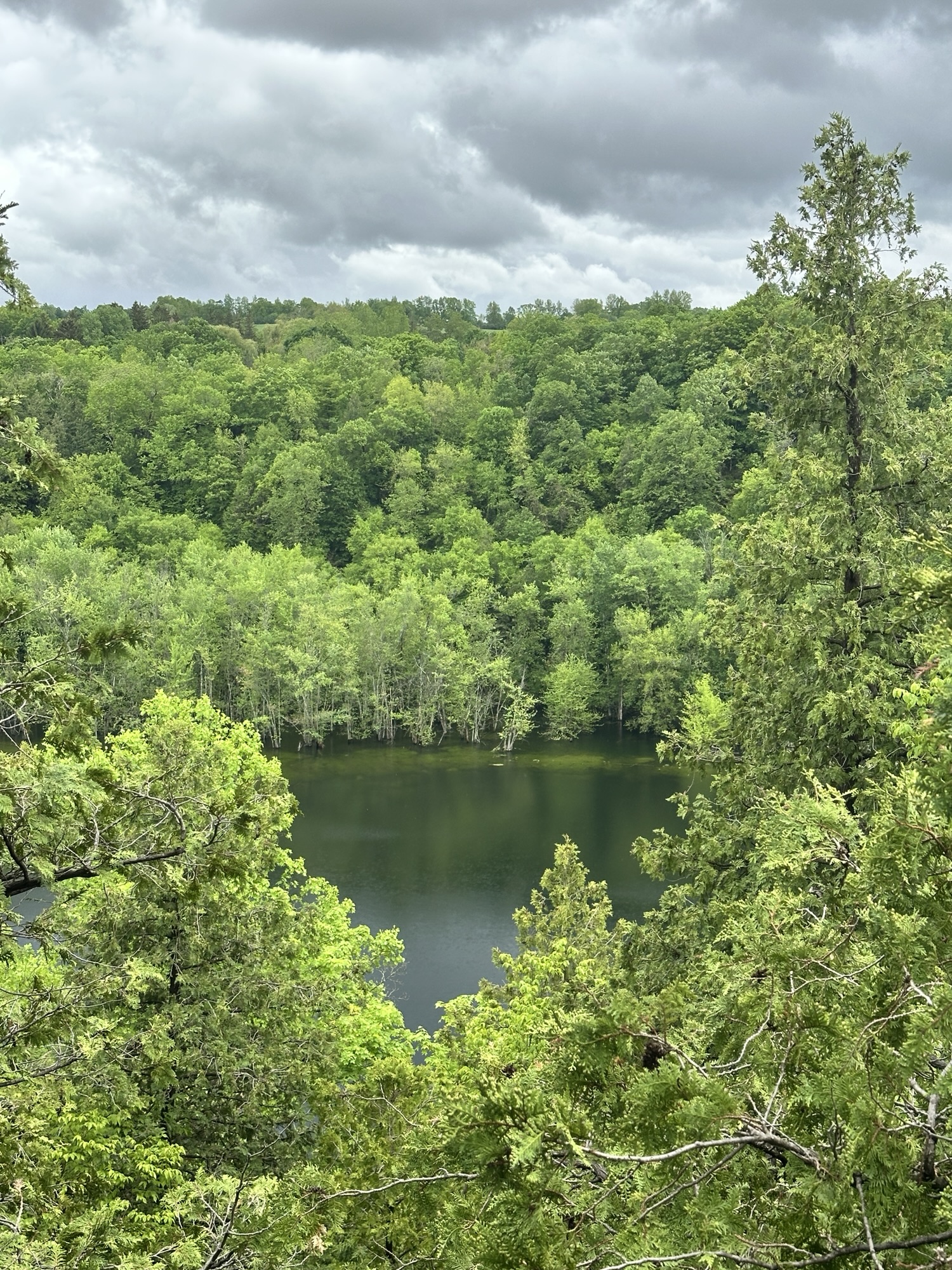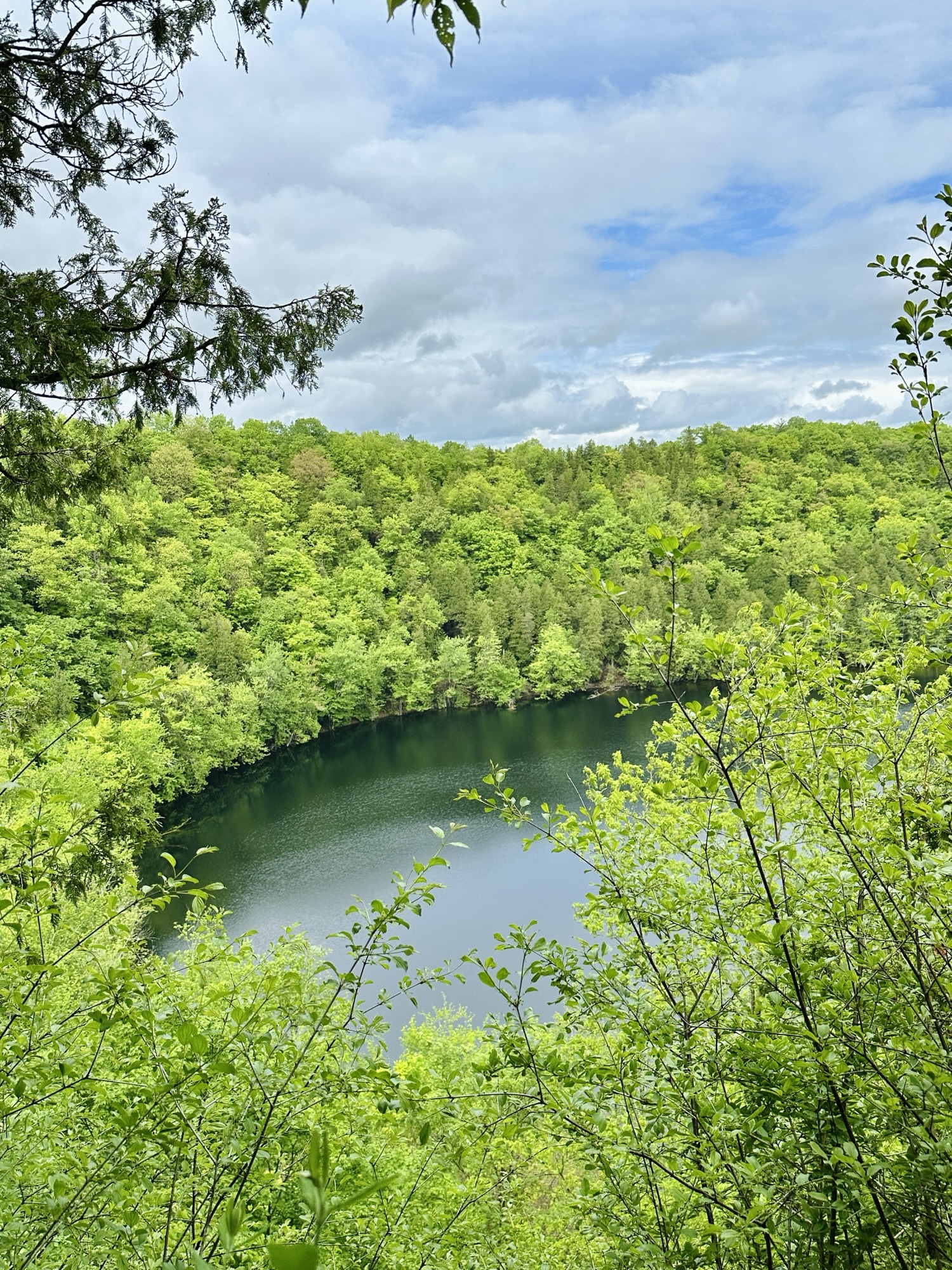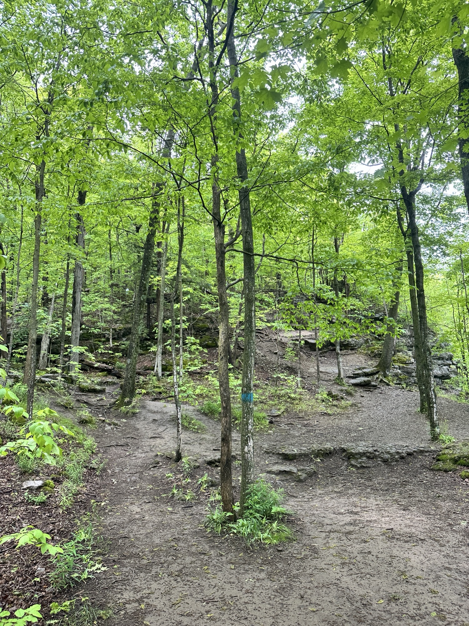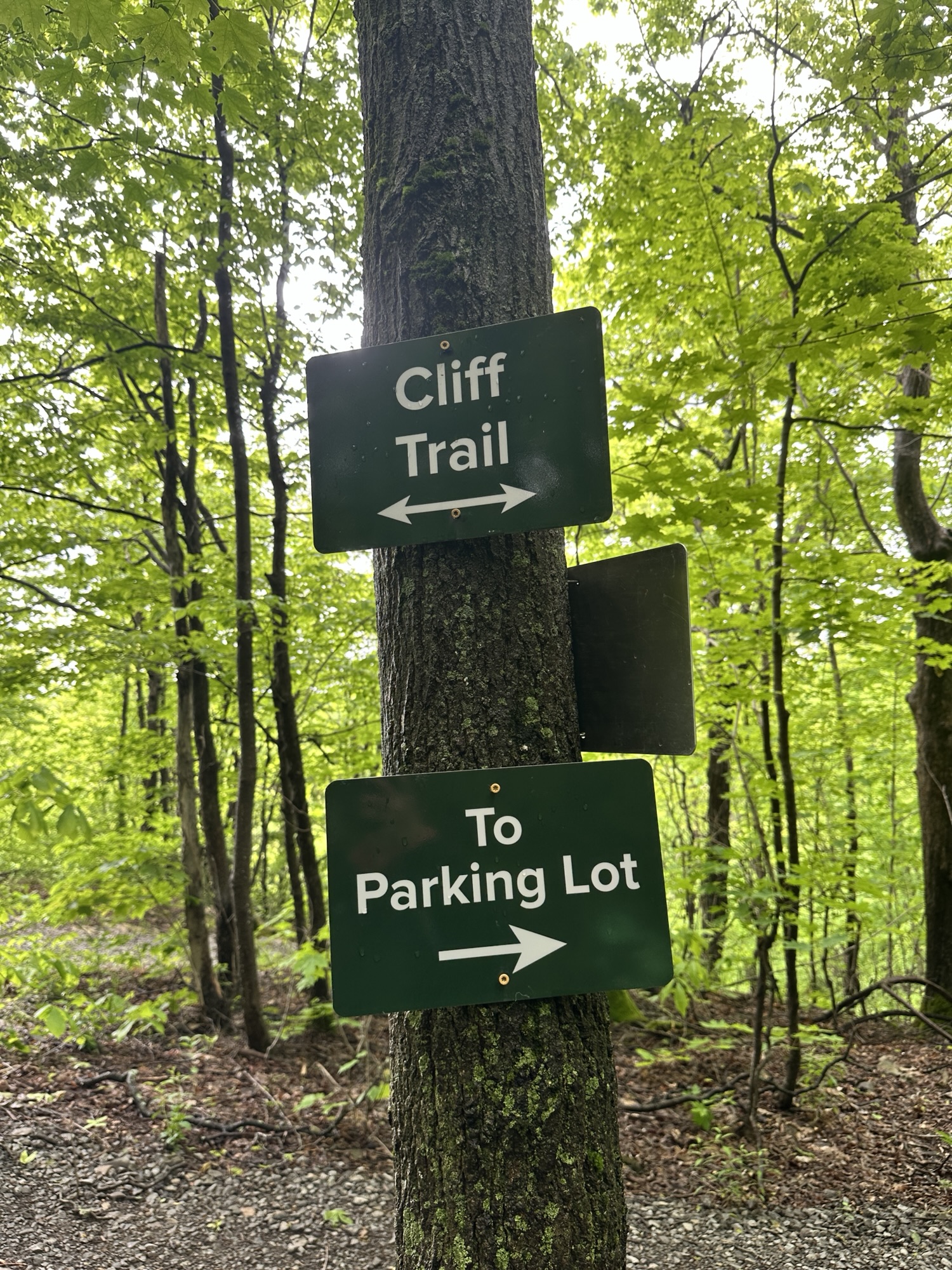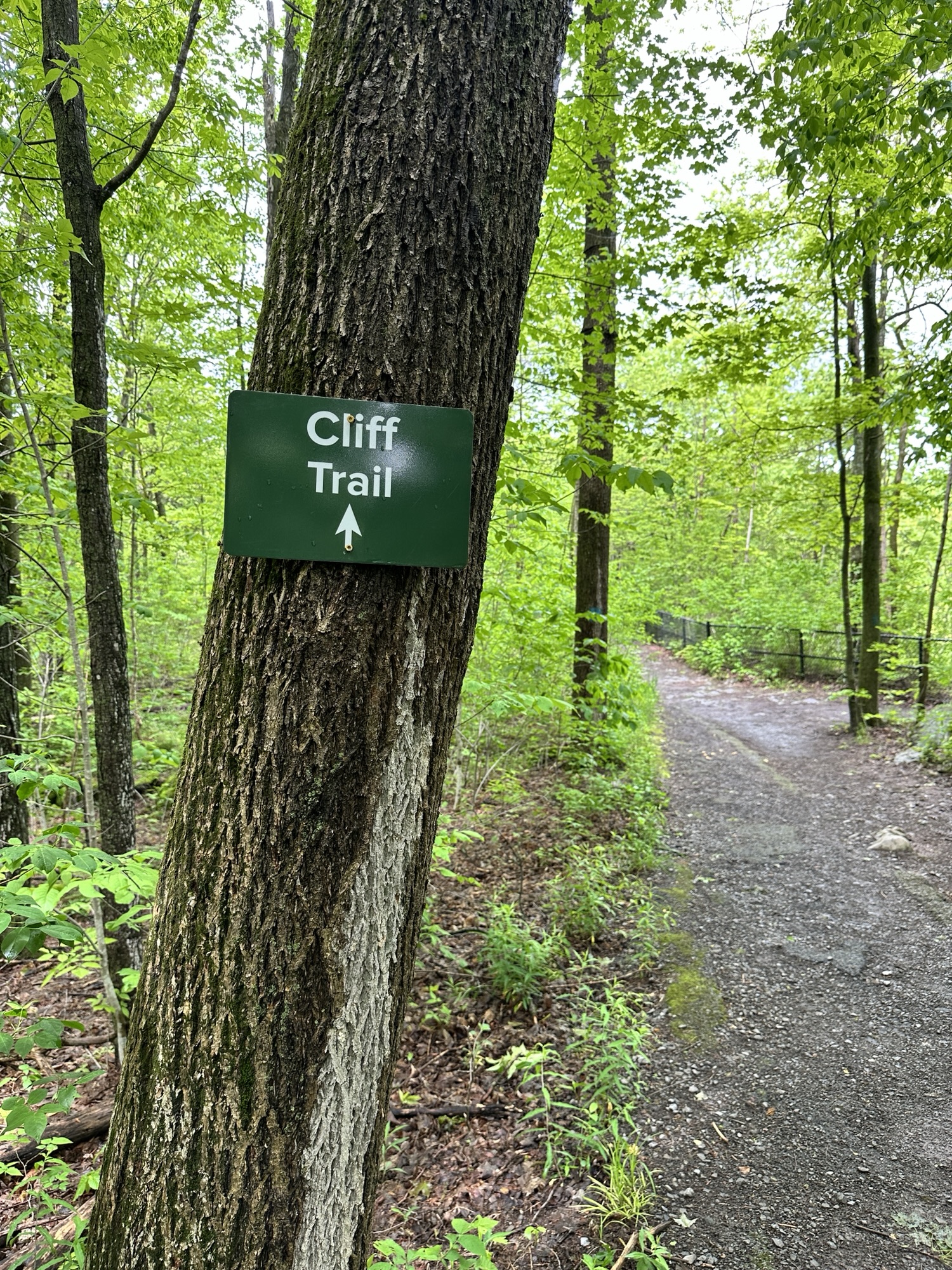 The Cliff Trail is a 0.62 mile trail that starts near the main parking area by the interpretive center. It can be made into a loop with other trails or can be done as an out-and-back hike. The trail goes through the woods along the cliff above Glacier Lake. There are some beautiful views of the lake and distant hills from a few viewpoints along the trail. In my opinion, the best view was from the picnic area right near the interpretive center. The path is dirt and gravel with some rocky steps and roots – the trail is NOT stroller friendly. Leashed dogs are allowed. Be careful near cliff edges – there are steep drops.