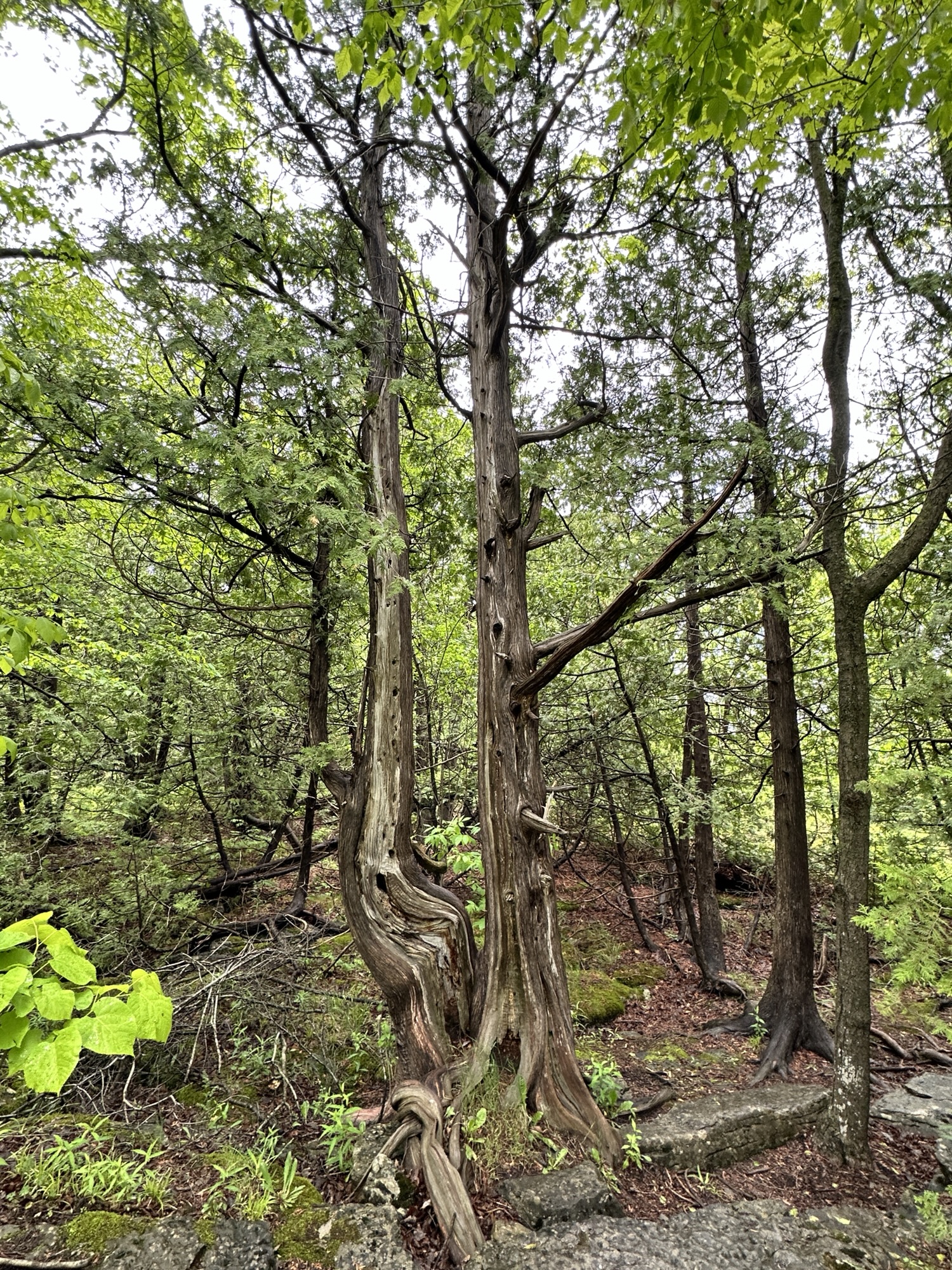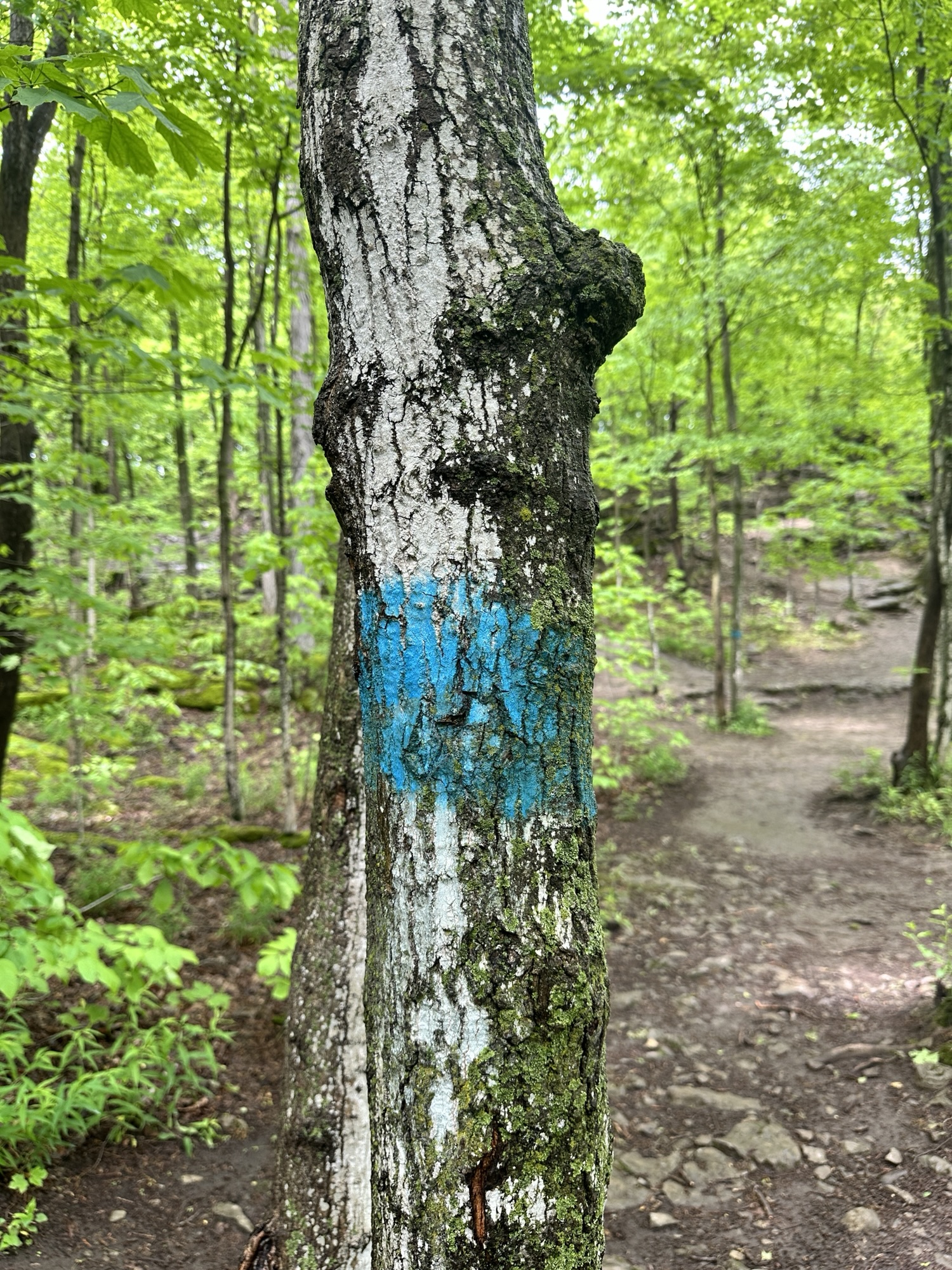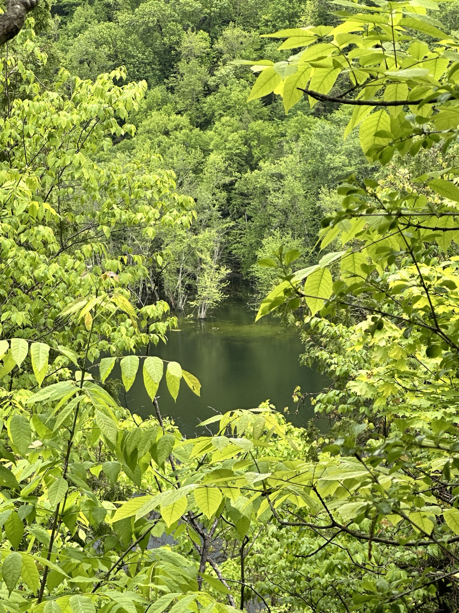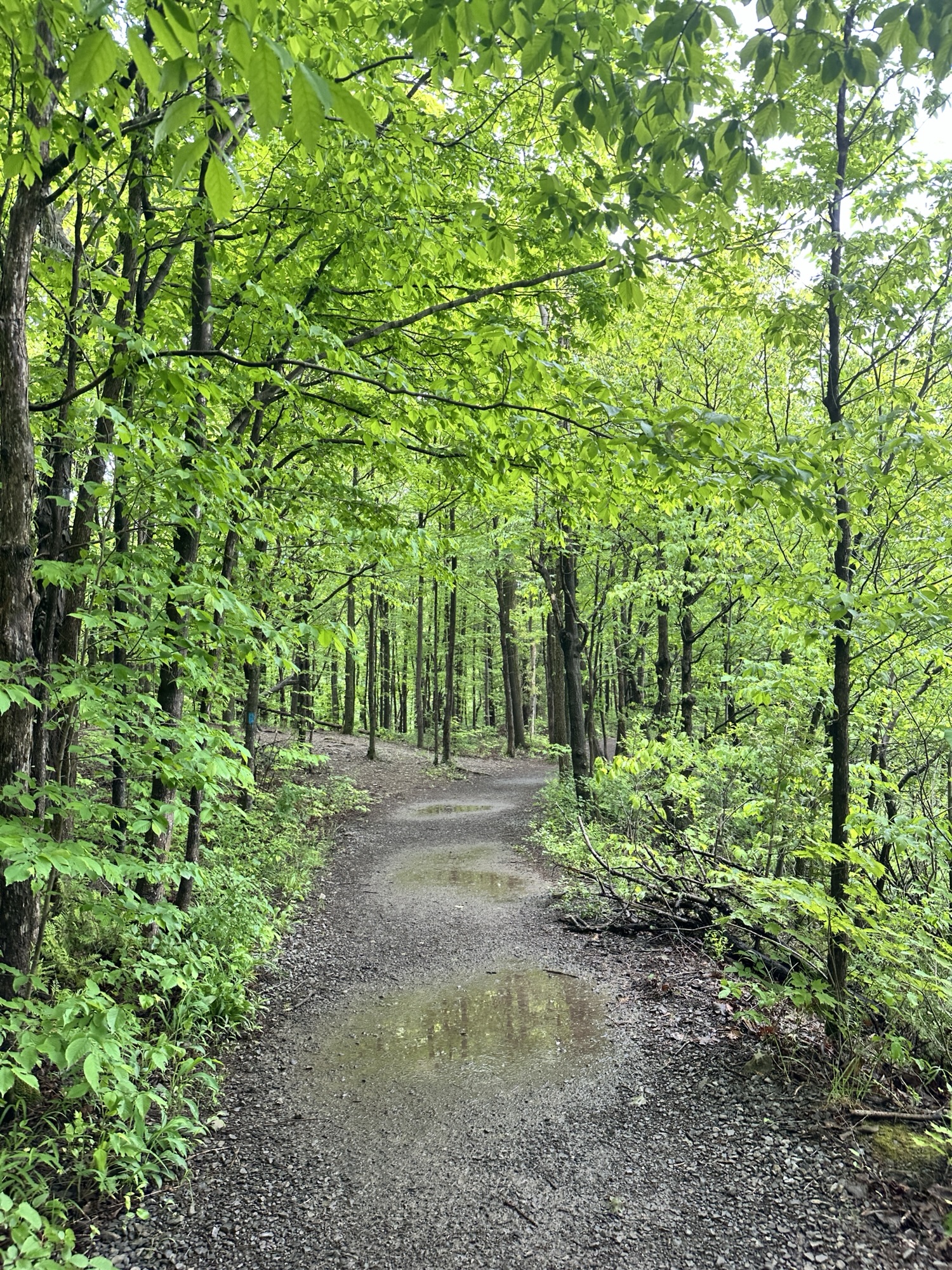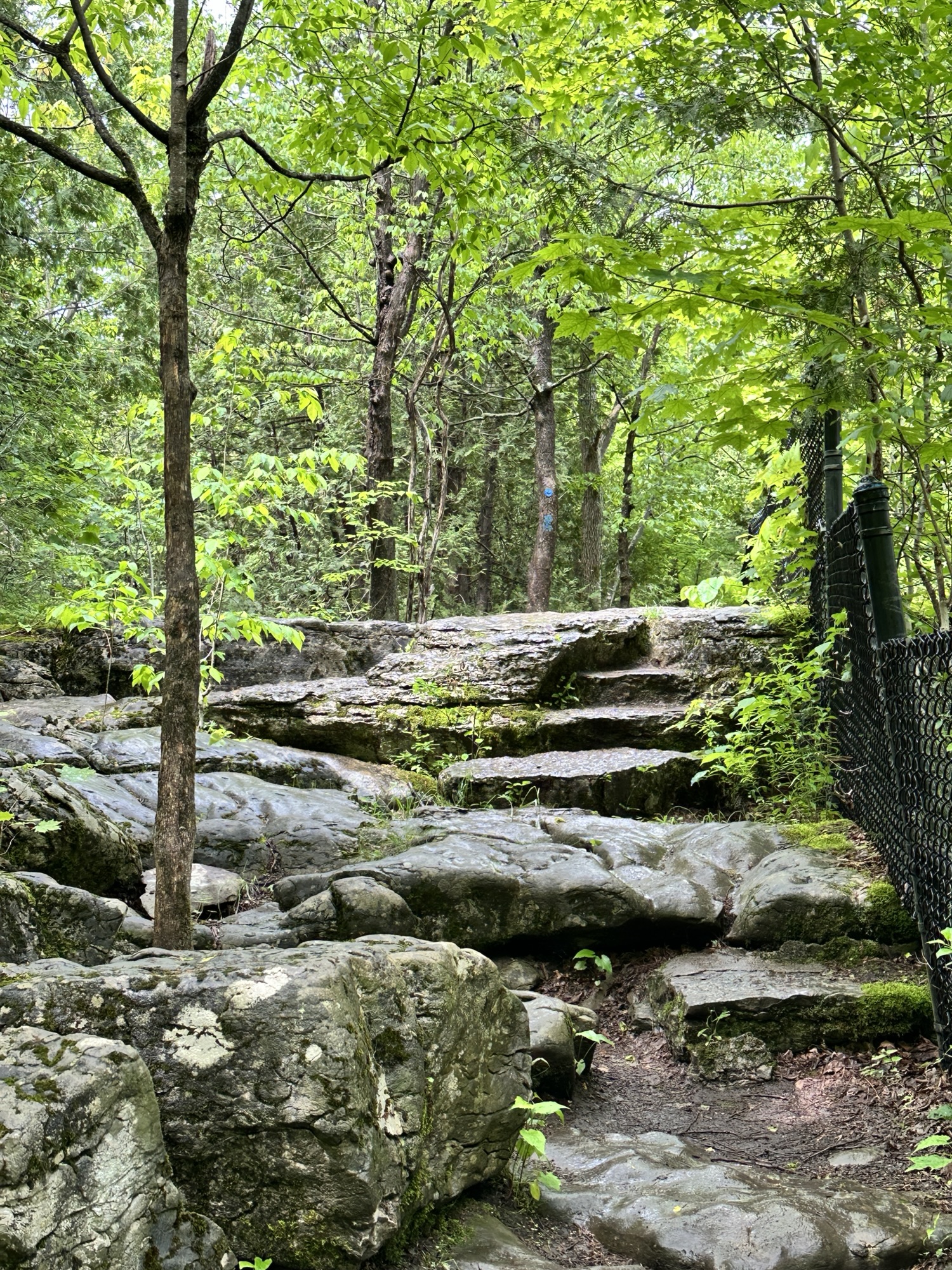 The Cliff Trail is a 0.62 mile trail that starts near the main parking area by the interpretive center. It can be made into a loop with other trails or can be done as an out-and-back hike. The trail goes through the woods along the cliff above Glacier Lake. There are some beautiful views of the lake and distant hills from a few viewpoints along the trail. In my opinion, the best view was from the picnic area right near the interpretive center. The path is dirt and gravel with some rocky steps and roots – the trail is NOT stroller friendly. Leashed dogs are allowed. Be careful near cliff edges – there are steep drops.