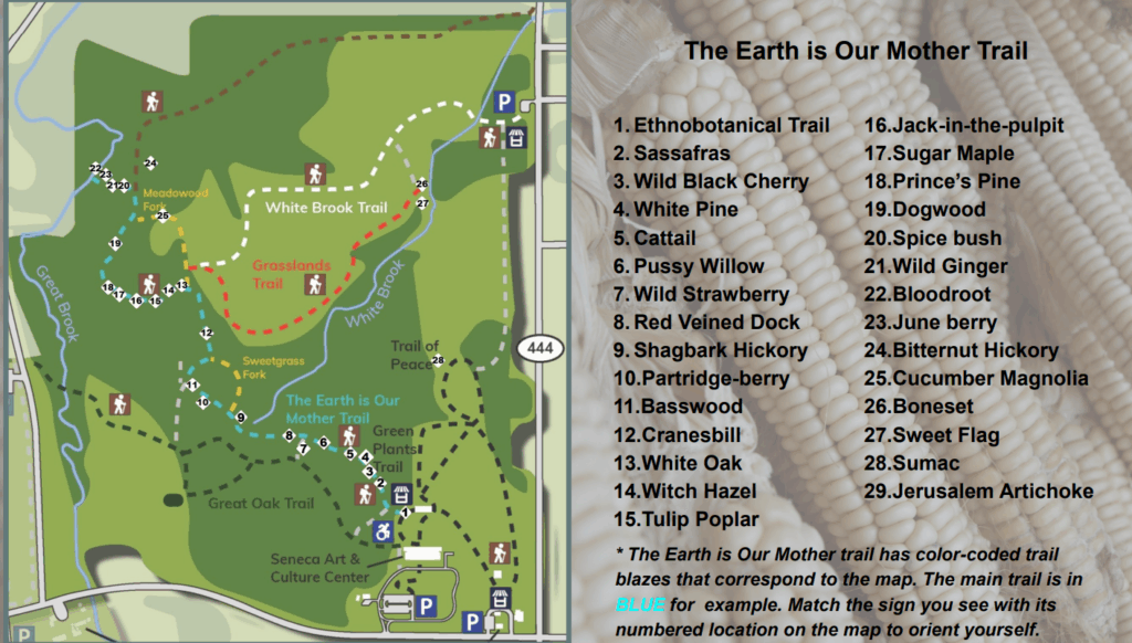 The Earth is our Mother Trail starts behind the Seneca Art & Culture Center. We usually stop to check out the Seneca Bark Longhouse before hiking (tours are needed to go inside, open seasonally). Along this trail are informational signs showing the many plants that are important to the Seneca People. This trail is NOT a loop trail – it is 0.89 miles 1 way (round trip is 1.78 miles). There are also a few cut through trails to make a loop with the Great Oak Trail. The trail is dirt with some hills and lots of roots – it is not considered stroller friendly.
