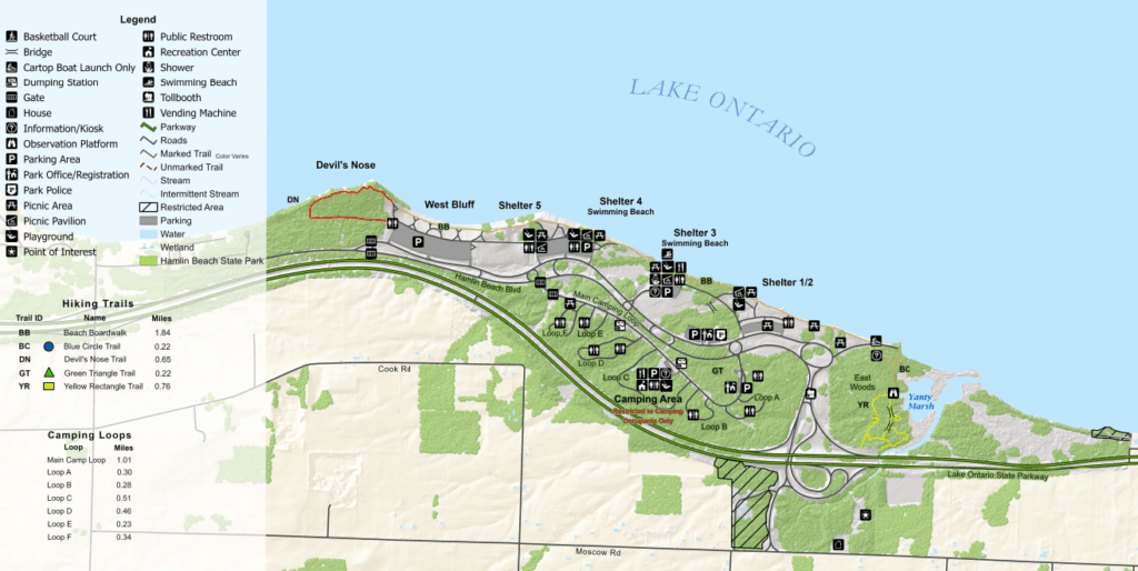 This state park is located 30 minutes northwest of Rochester, NY along the shore of Lake Ontario. The Beach Boardwalk is a 1.84 mile path along the lakeshore between Devil’s Nose and the Yanty Marsh. The stroller friendly path is paved and passes playgrounds, picnic areas, restrooms, and swimming beaches. There are also a campground in the park. Leashed dogs are allowed.