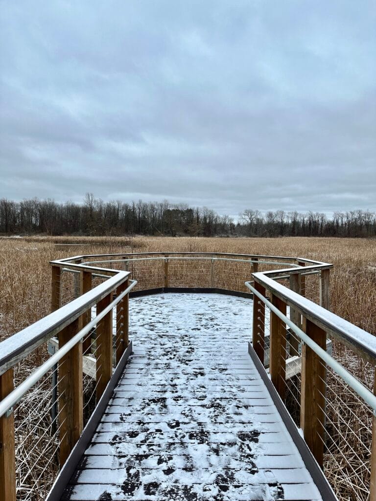 This state park is located 30 minutes northwest of Rochester, NY along the shore of Lake Ontario. On the east end of the park is the Yanty Marsh with a beautiful nature trail. About 0.2 miles into the hike is a beautiful boardwalk to a viewing platform over the marsh. The trail continues and makes a 0.5 mile loop through the forest, including some evergreen trees. The entire trail is a 1 mile total trip. The path to the boardwalk is packed dirt and is stroller friendly. I am not sure about the rest of the trail. Leashed dogs are allowed.