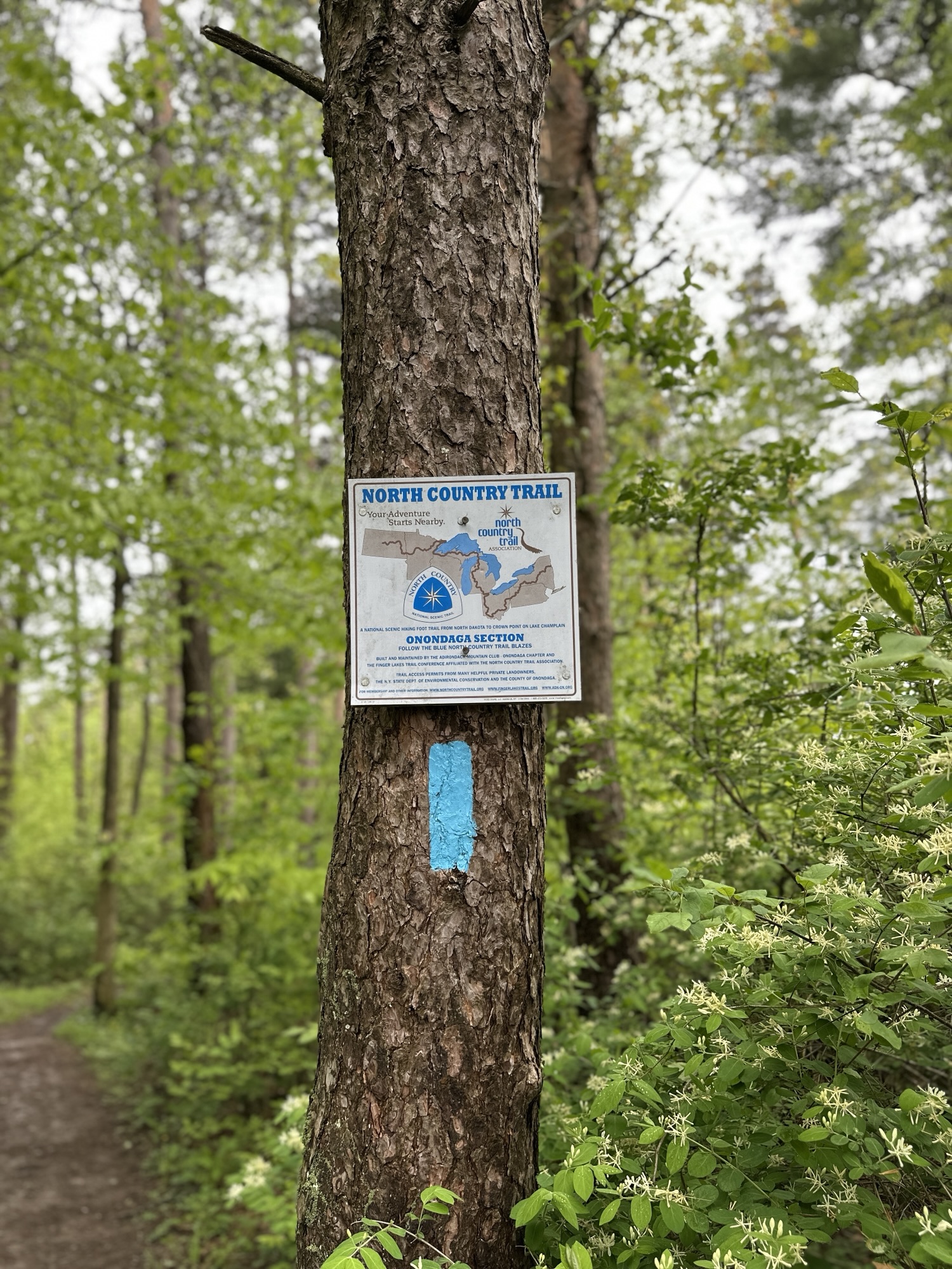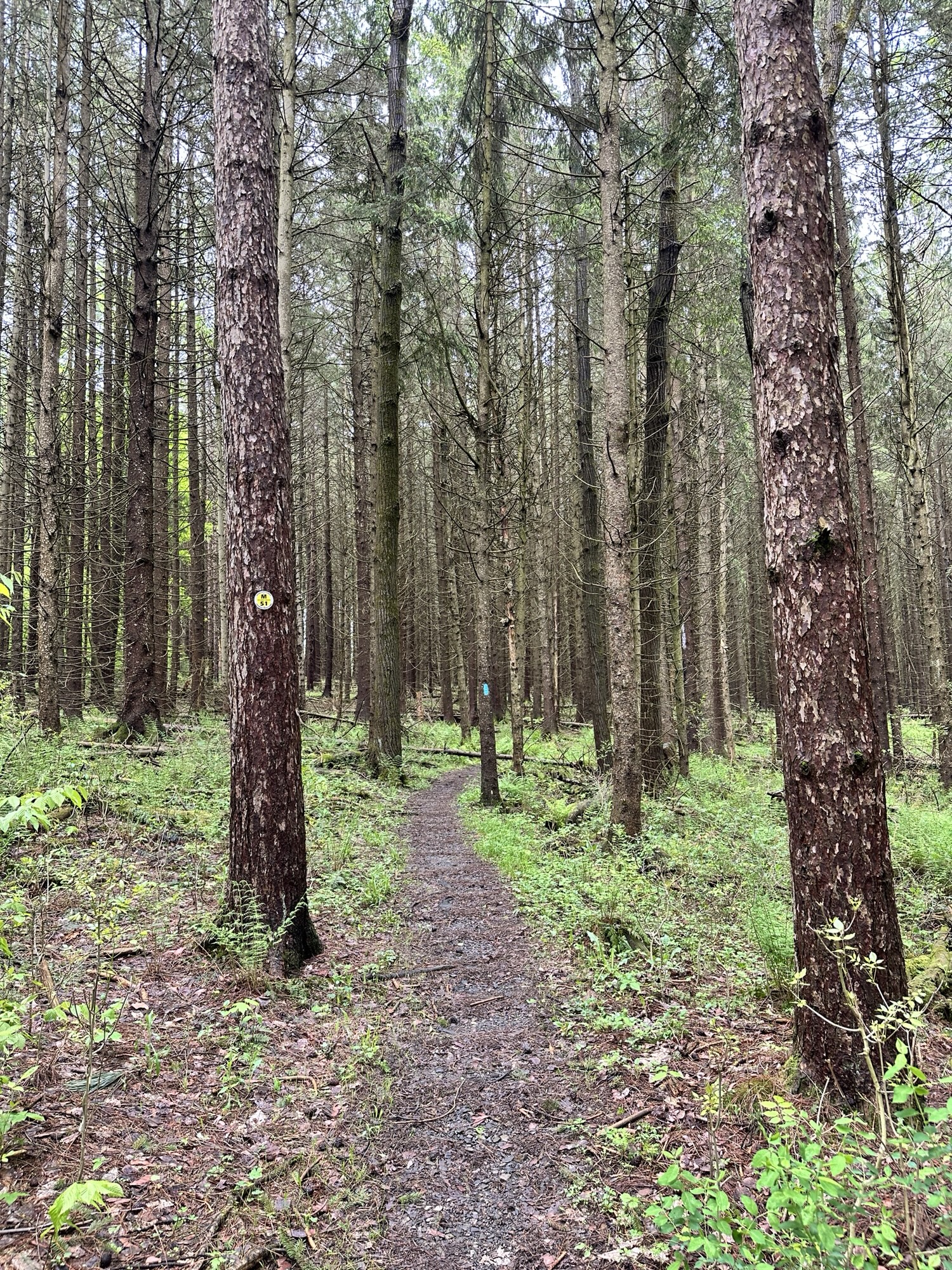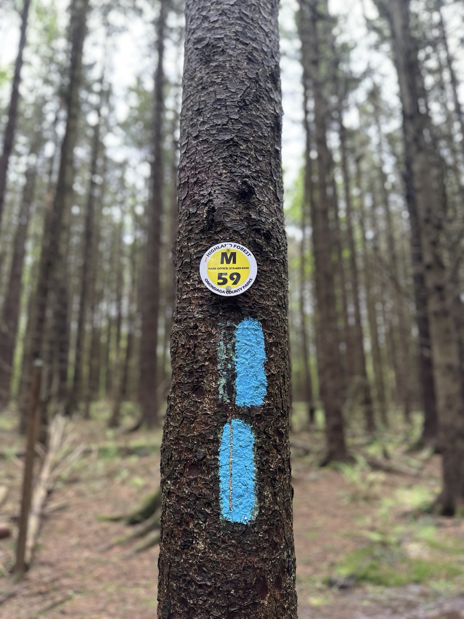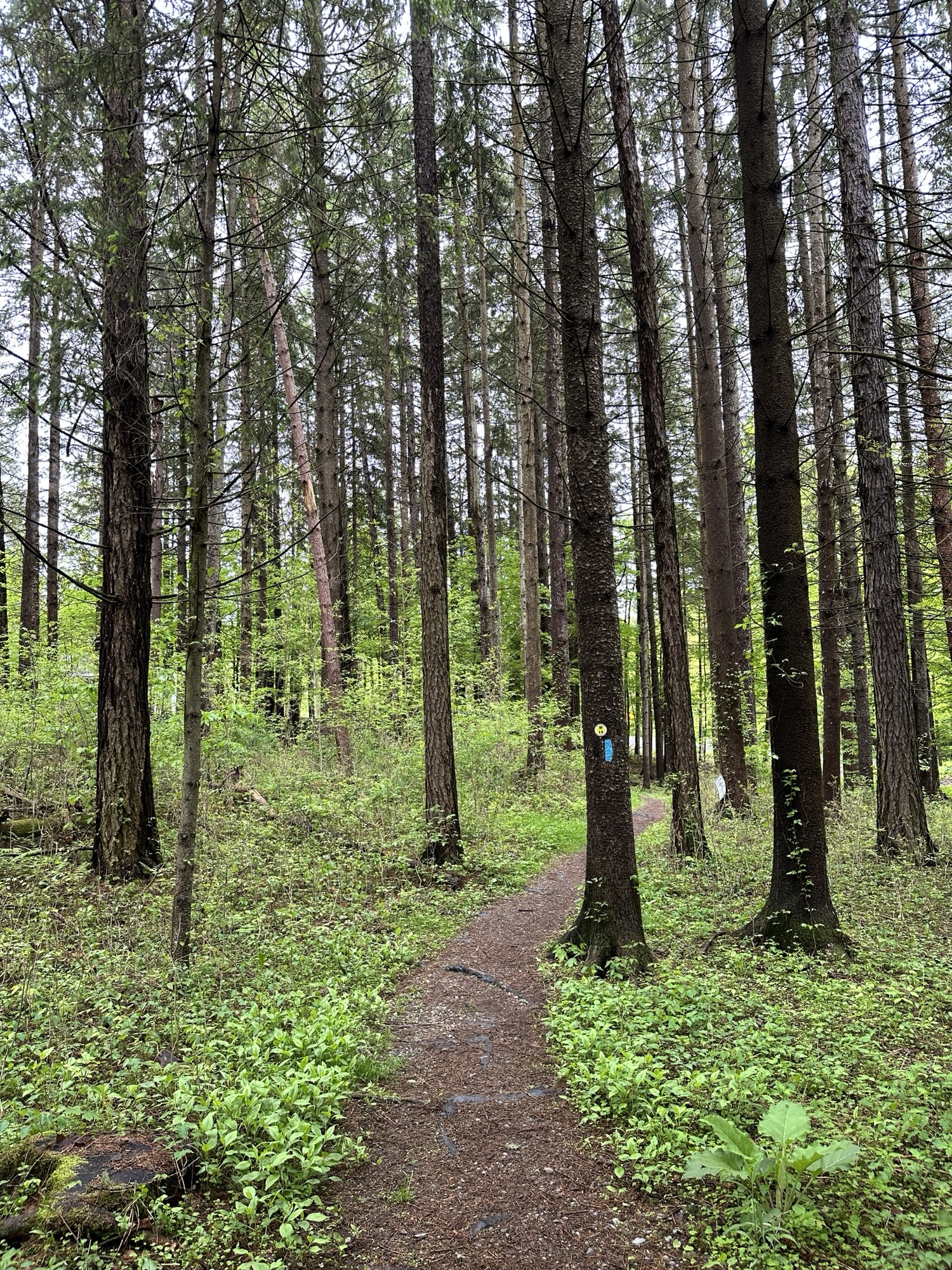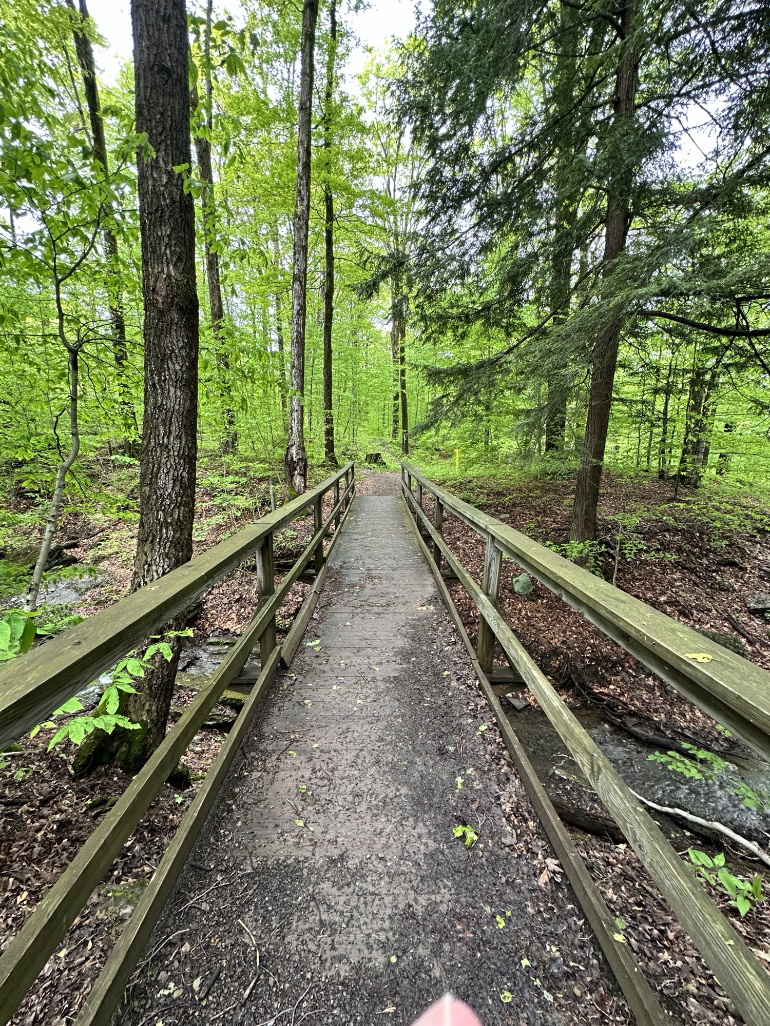 This beautiful park is located south of Syracuse, NY and 2 hours east of Rochester, NY. Highland Forest County Park contains over 20 miles of year-round trails and is known as the “Adirondacks of Central New York.” Near the Skyline Lodge is the start of several types of trails: hiking/snowshoeing trails, skiing/mountain biking trails, and skate skiing trails. We hiked a roughly 2-mile loop that included the M trail, K trail, and T trail (labeled as the green “Nature Trail” on this map). This loop included part of the North Country Trail and brought us past a lean to and to a magical evergreen forest with beautiful wildflowers along the way. It was not stroller friendly.