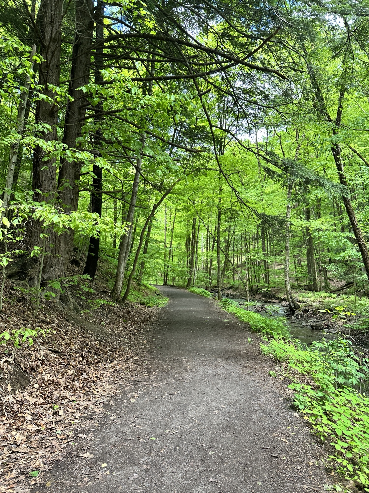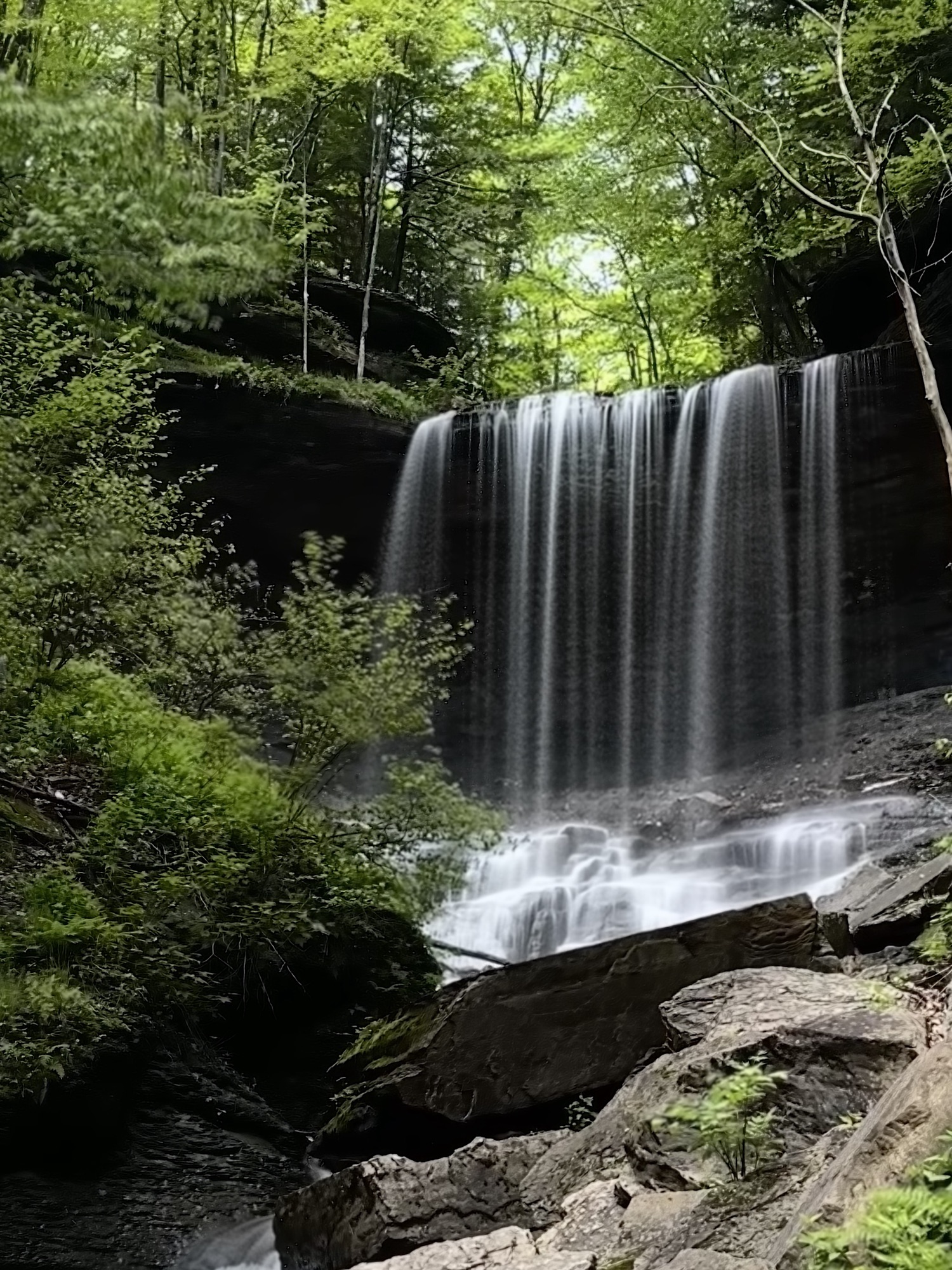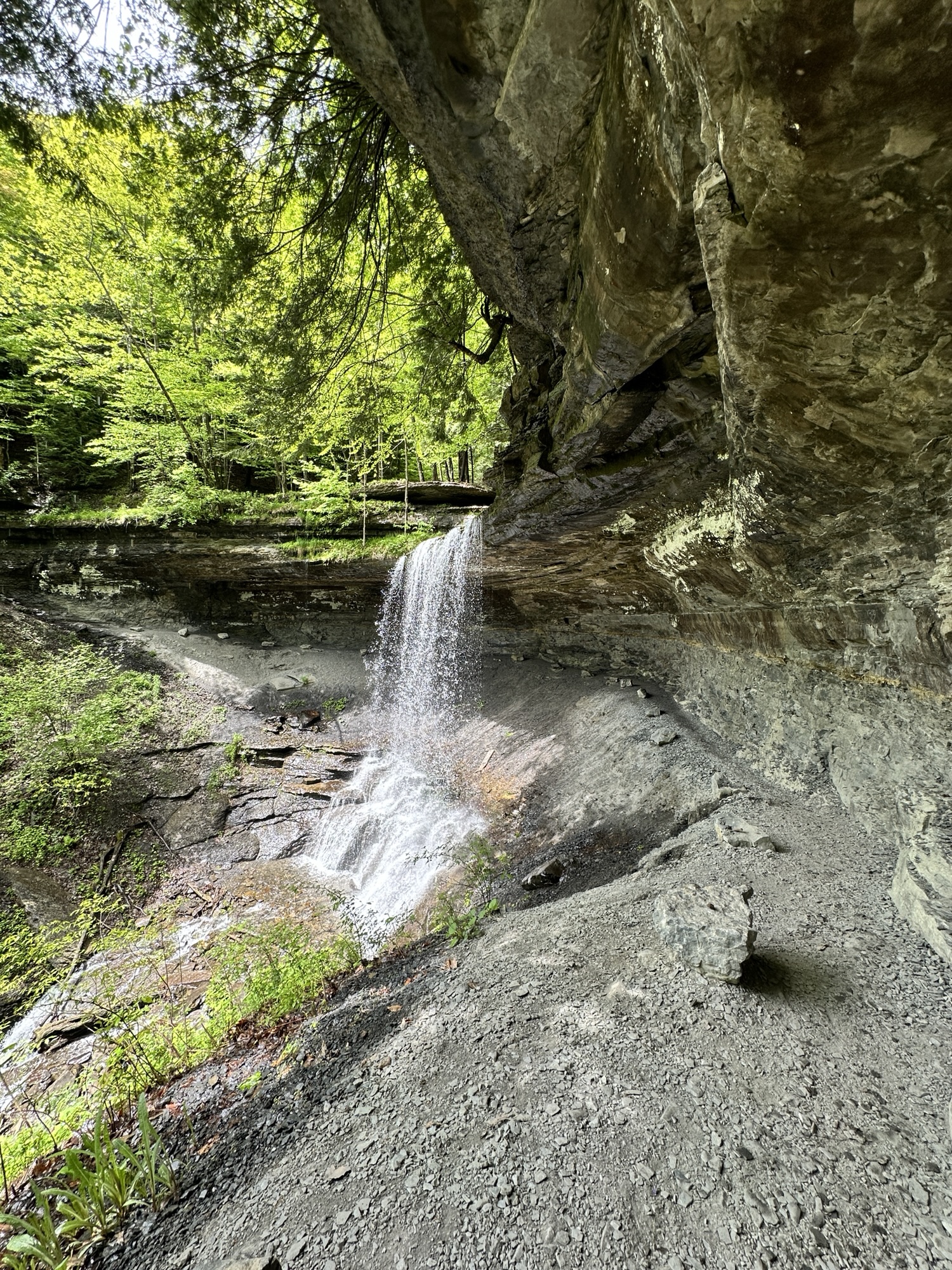 This trail is located south of Syracuse – just about 2 hour east of Rochester, NY. This nature area is located in the middle of a valley that was dug out by glacial movement around ten thousand years ago. We hiked the accessible part of the trail (0.25 miles each way) to the beautiful view of the 50 foot waterfall “hanging” over a natural rock amphitheater. We then continued over some rocky terrain (NOT accessible or stroller friendly) and through the creek to the base of the falls where we climbed the stone steps to walk behind the falls. Walking behind the waterfall was truly magical. This trail can be connected to the Boardwalk Trail via the Skyline Trail.