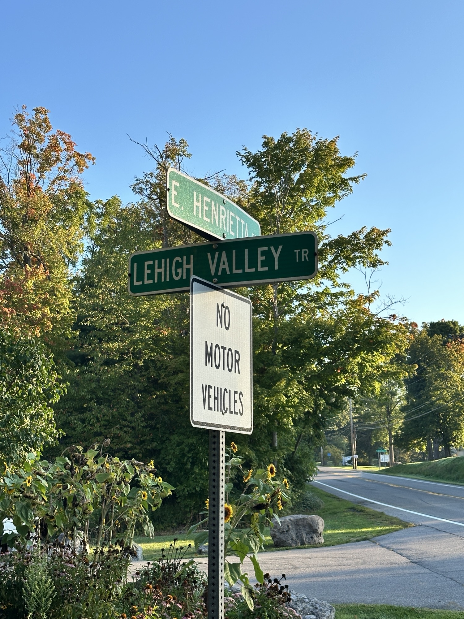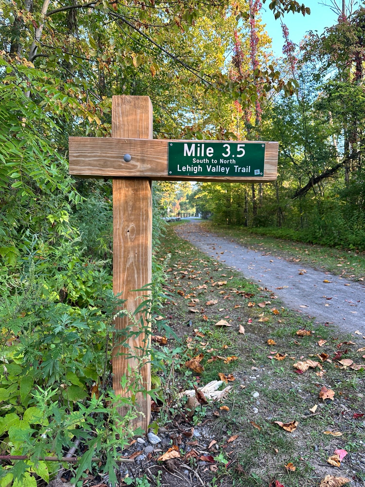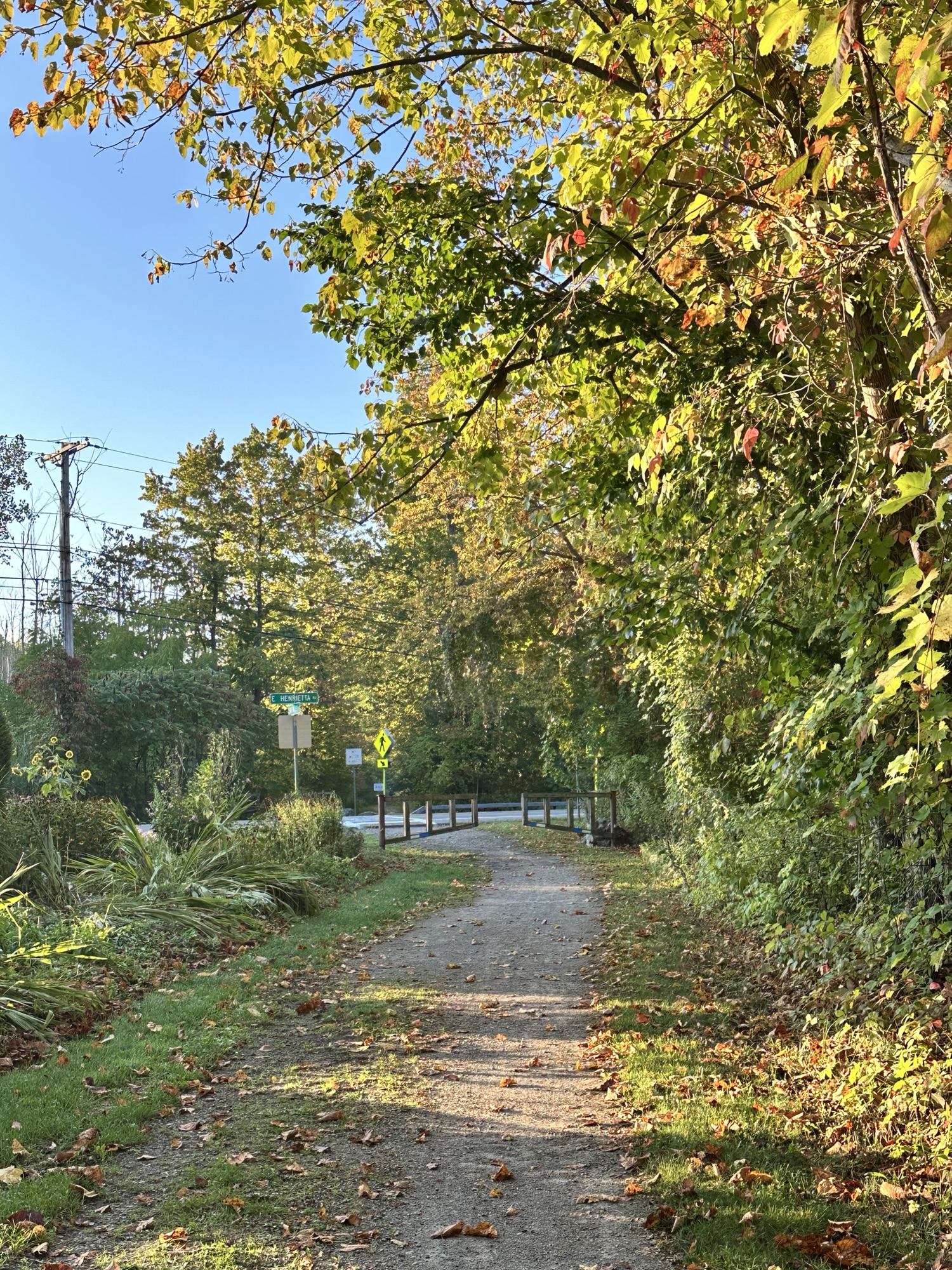 The Lehigh Valley Trail is a 15 mile converted rail-trail that once served as the Lehigh Valley Railroad. The North Branch of the Lehigh Valley Trail runs from the main trail northward. I parked in the parking lot on East Henrietta Rd (15A) just south of Ward Hill Road. There was an information board, picnic tables, and a beautiful garden at the parking area. The trail goes both directions, with a crosswalk across 15A. The trail is flat and stroller friendly. Leashed dogs are allowed.