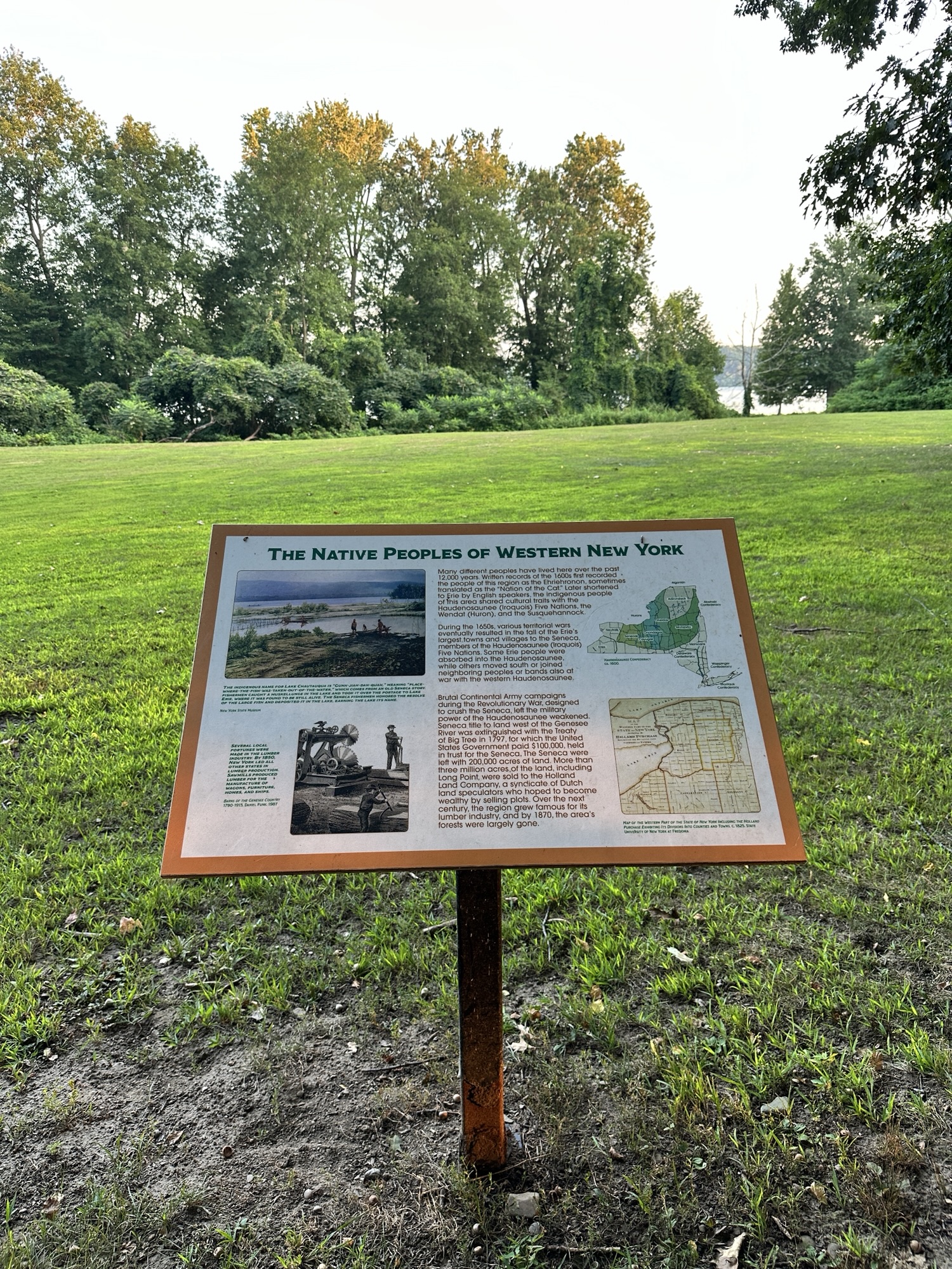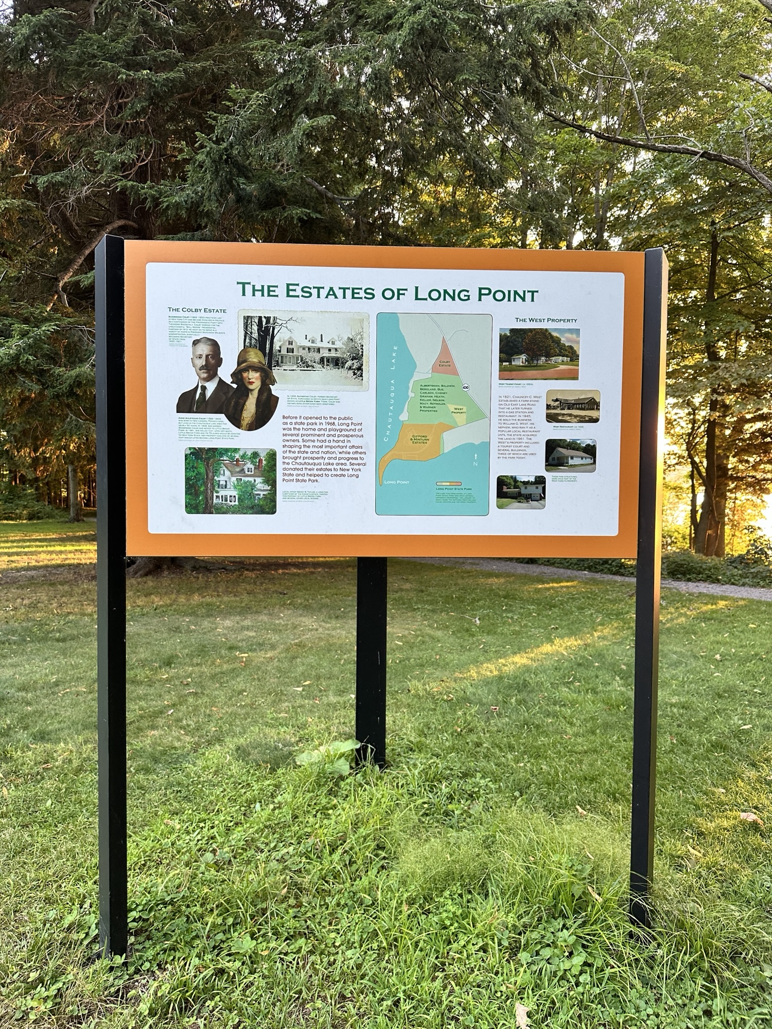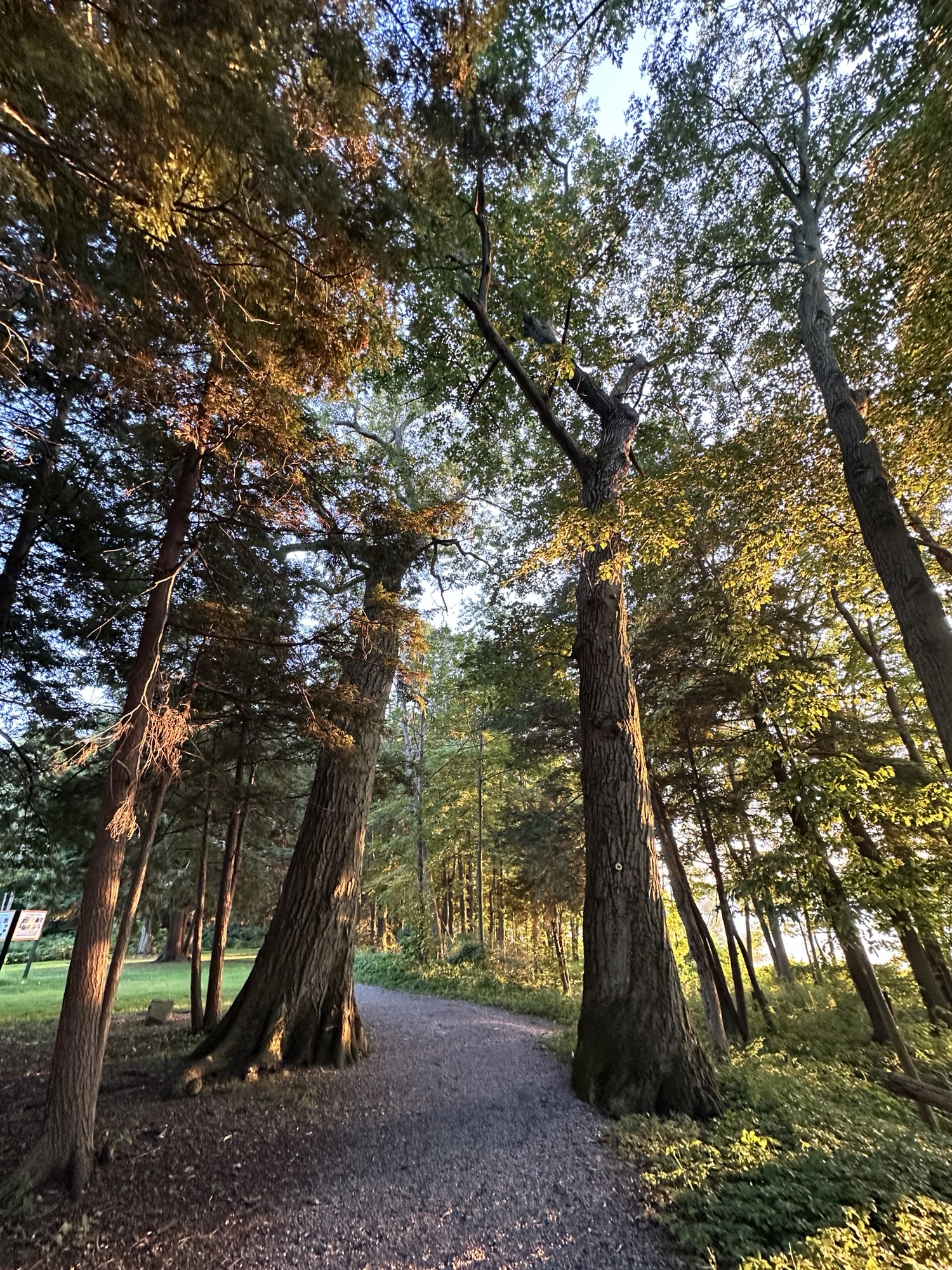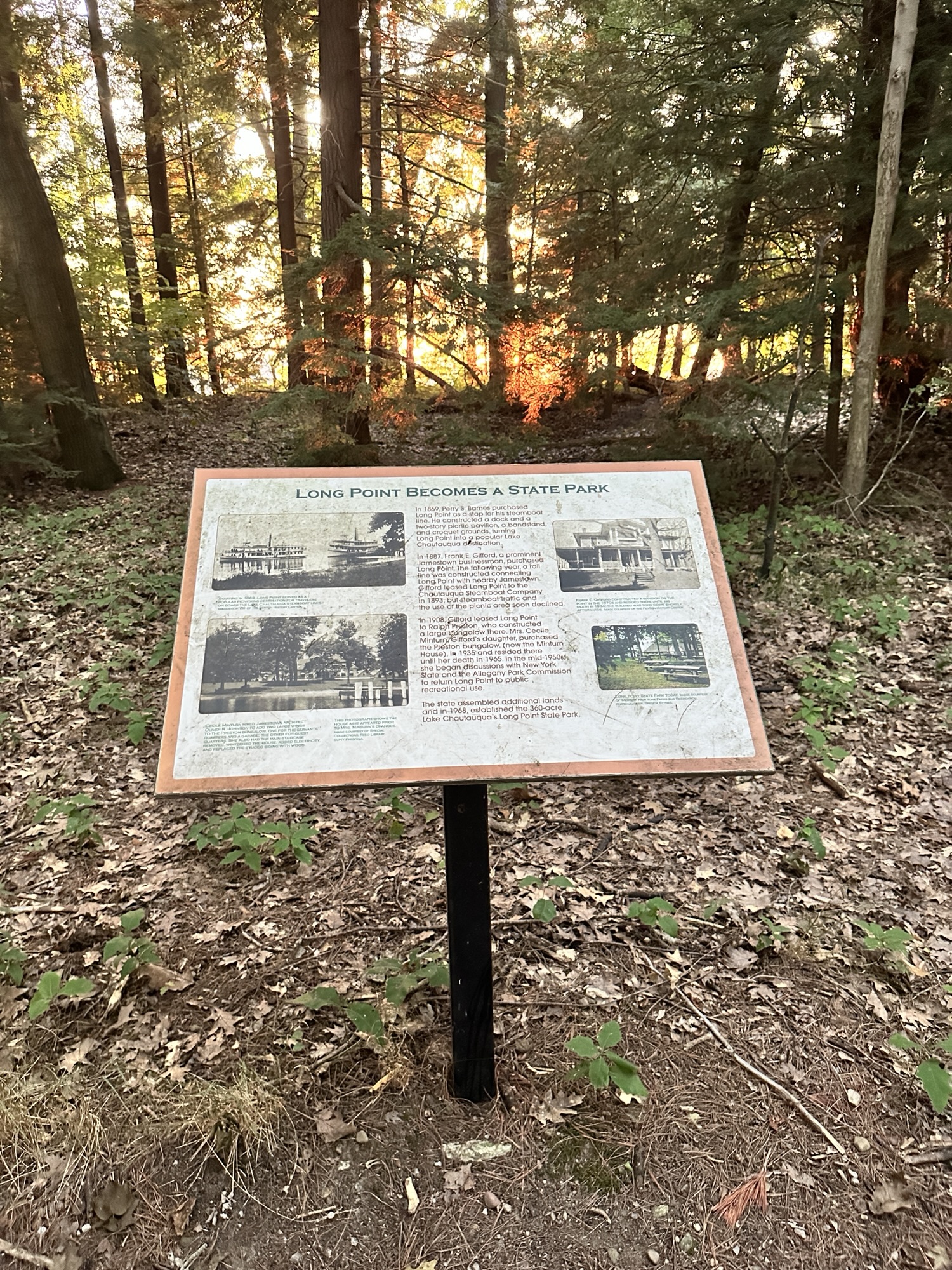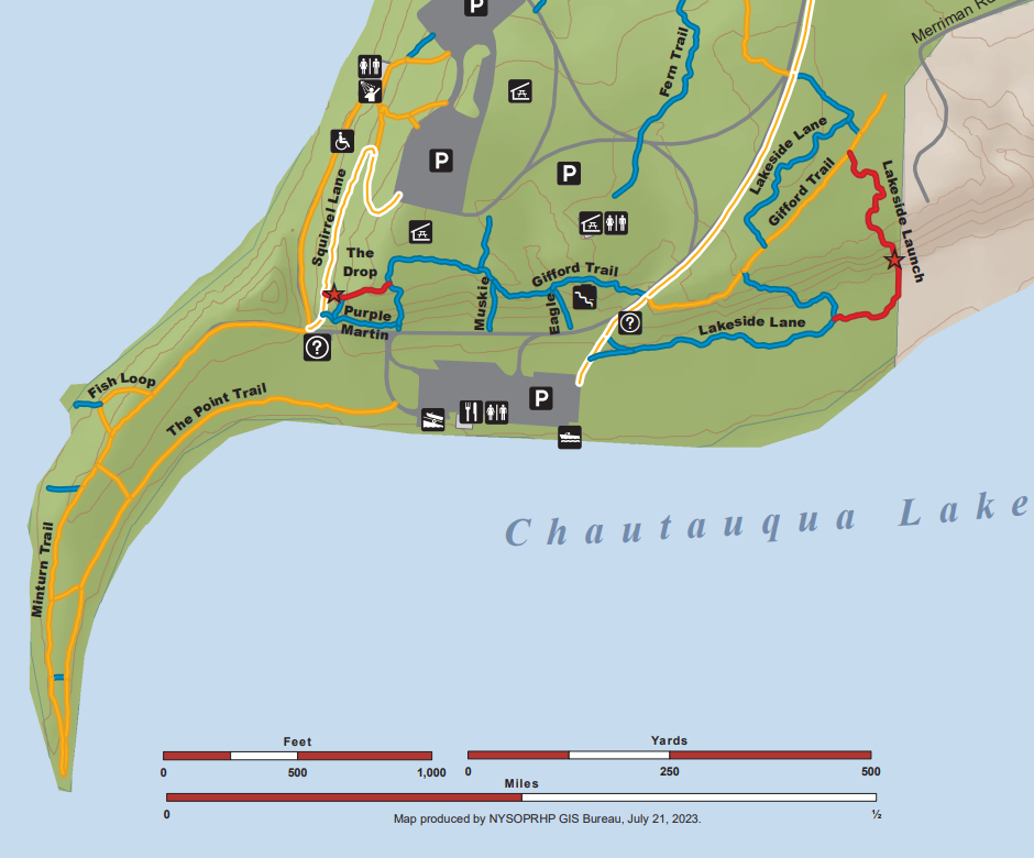 This park is located in Chautauqua County – 2.5 hours southwest of Rochester, NY and 1.5 hours south of Buffalo. Long Point, which juts into Lake Chautauqua, is one of the moraines left by a retreating glacier long ago. A highlight of the park is the Point Trail or Minturn Trail, which both go through the woods to the tip of the peninsula, where you can view the lake on all sides. You can make a short ~1 mile loop with these two trails, where you will find picnic tables and benches at scenic spots along the trail as well as informational signs. The trail is flat and stone dust, and is probably stroller friendly. It’s a beautiful spot to watch a sunset!
