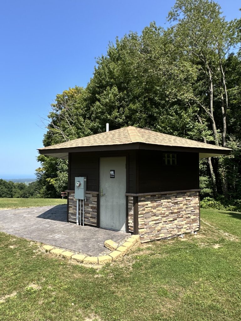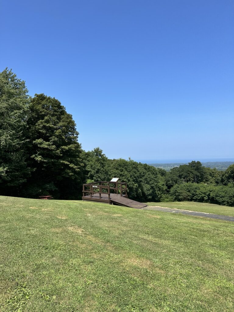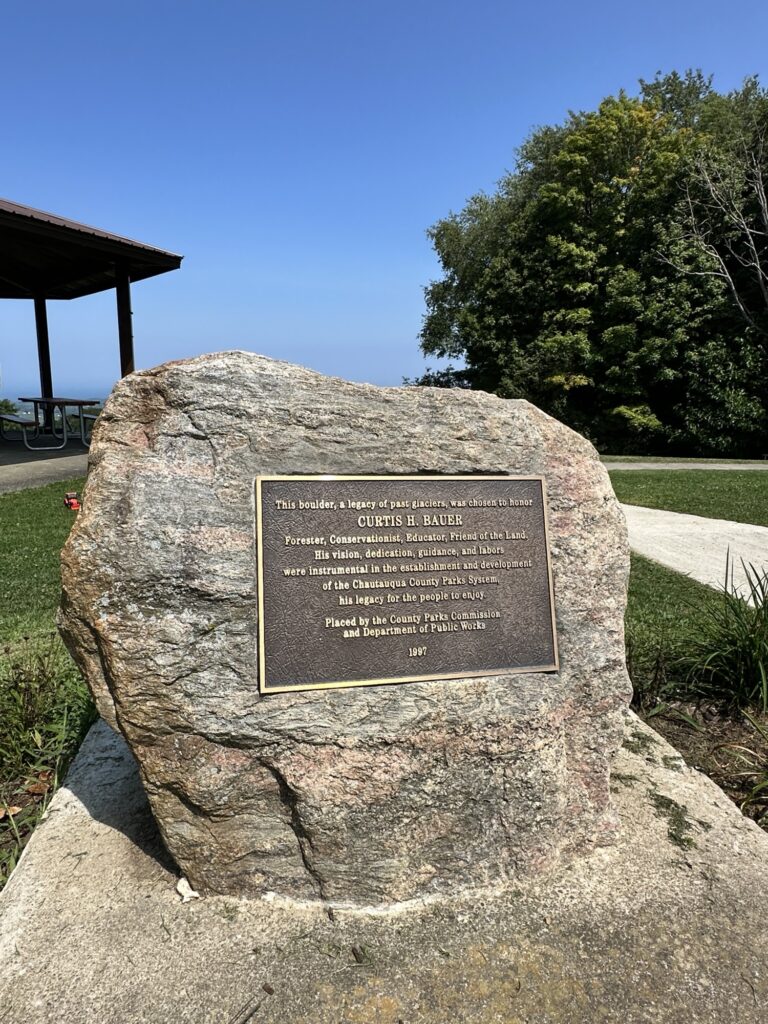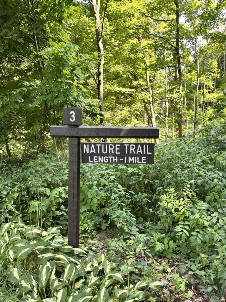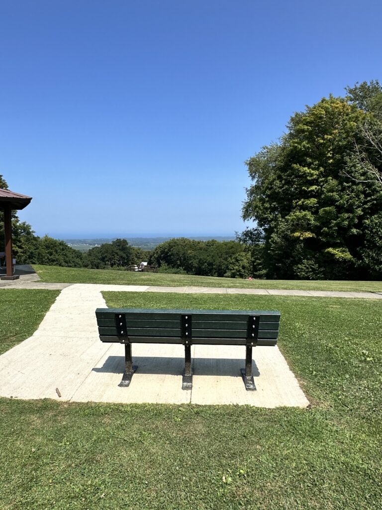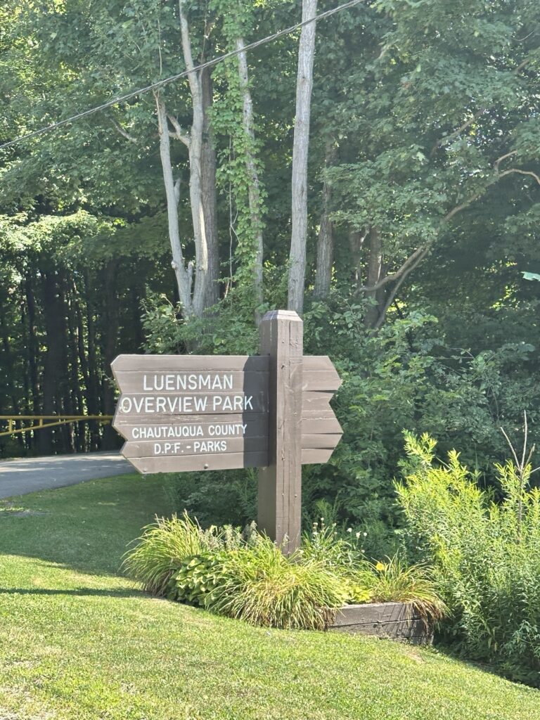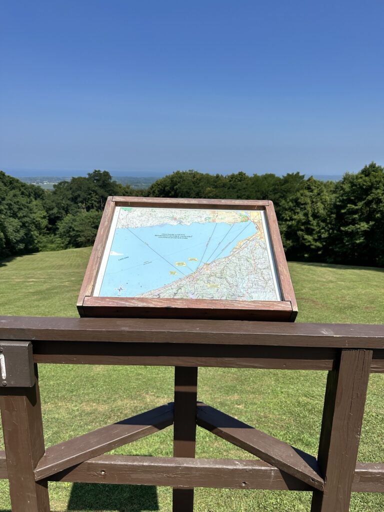 This park is located in Chautauqua County – 2.5 hours southwest of Rochester, NY and 1.5 hours south of Buffalo. Just near the parking lot you can find a pavilion, a large mowed sloped area, and two observation decks with wide views of the surrounding hills and Lake Erie in the distance. There is a beautiful nature trail through the woods. There is a very short loop and a longer loop. The trail signs say that the nature trail is 1 mile long, though my AllTrails app measured about 0.6 miles from the start of the trail at the bottom of the steps to the end of the trail at the road. I then walked up the road back to the parking lot. There are numbered wooden signs throughout the trail that correspond to Natural History Trail Guide. The trail is not stroller friendly, but there is a nice view with a bench from the parking area. There are restrooms, picnic tables, and water fountain at the parking area. Leashed dogs are allowed.