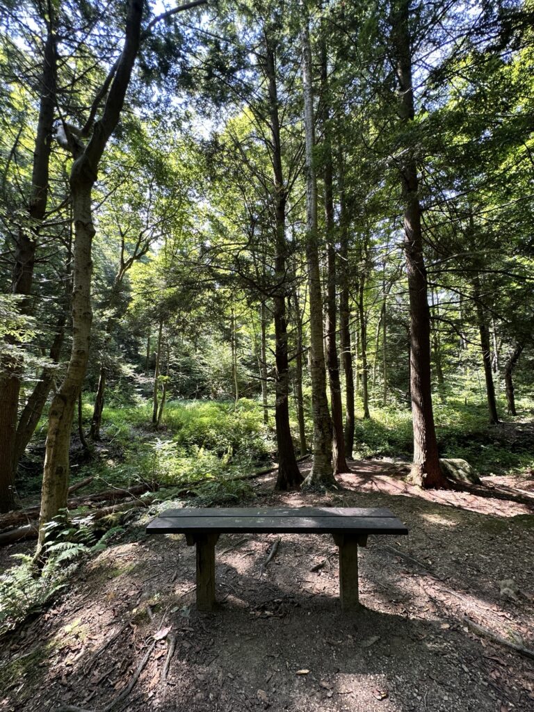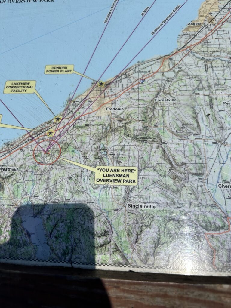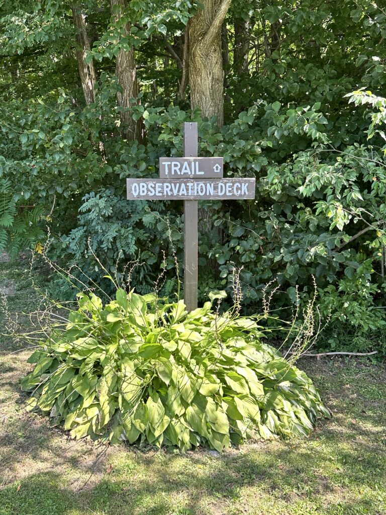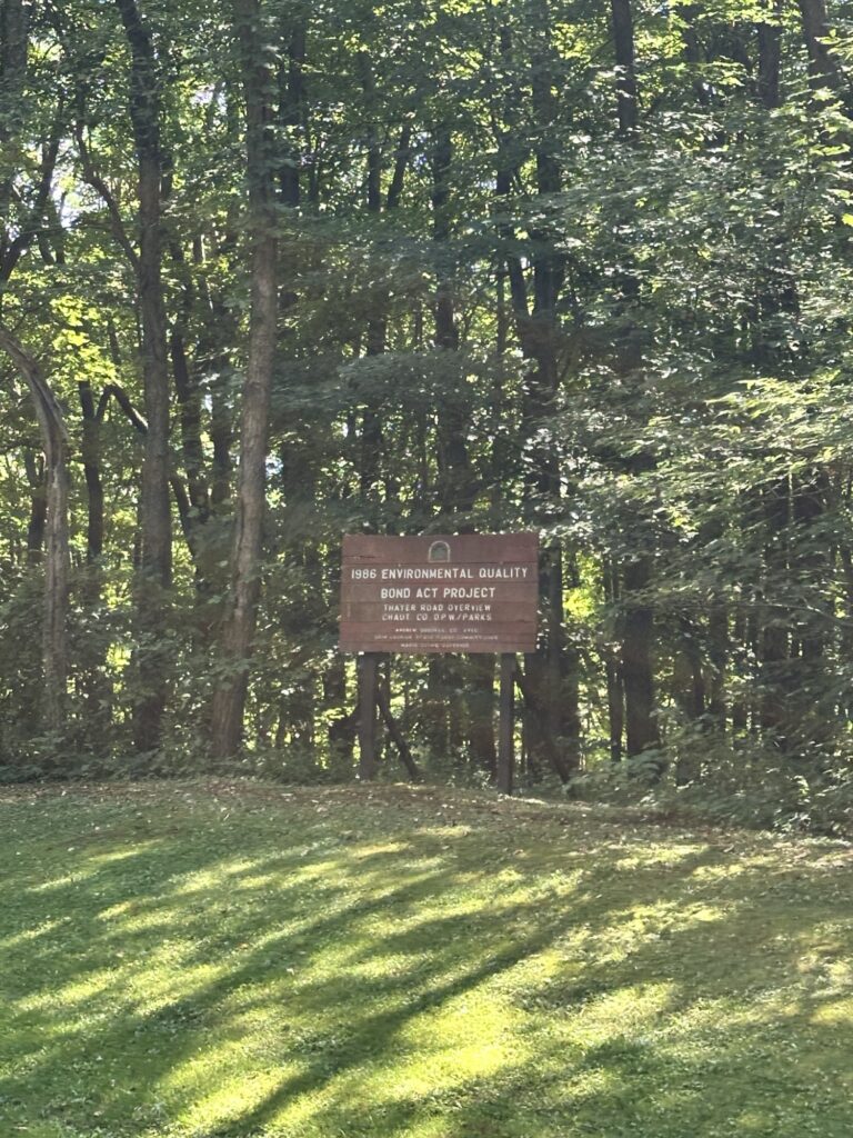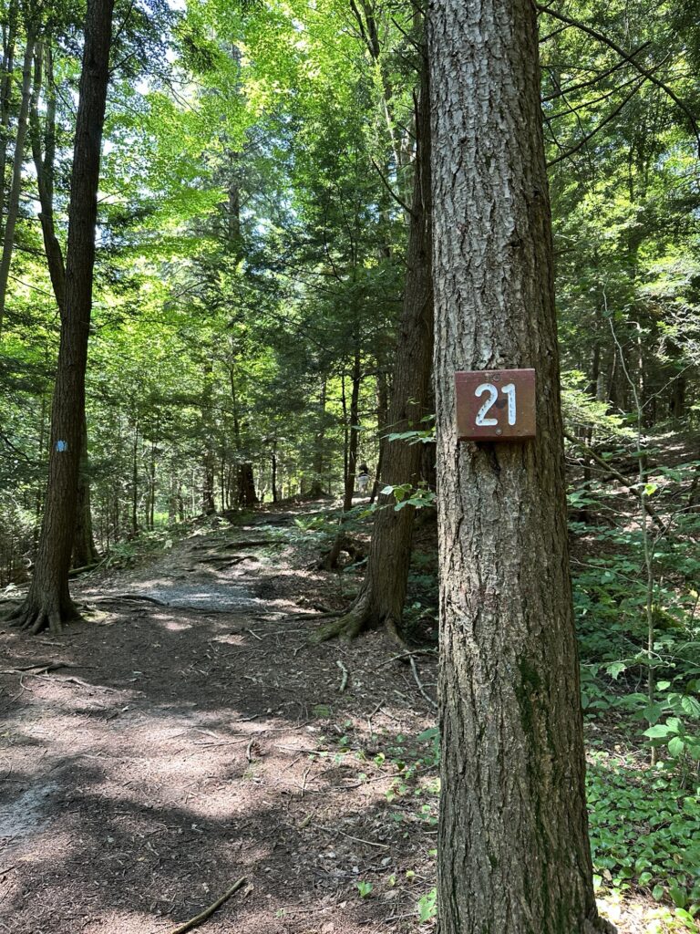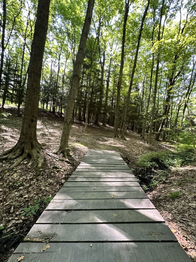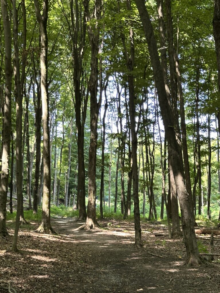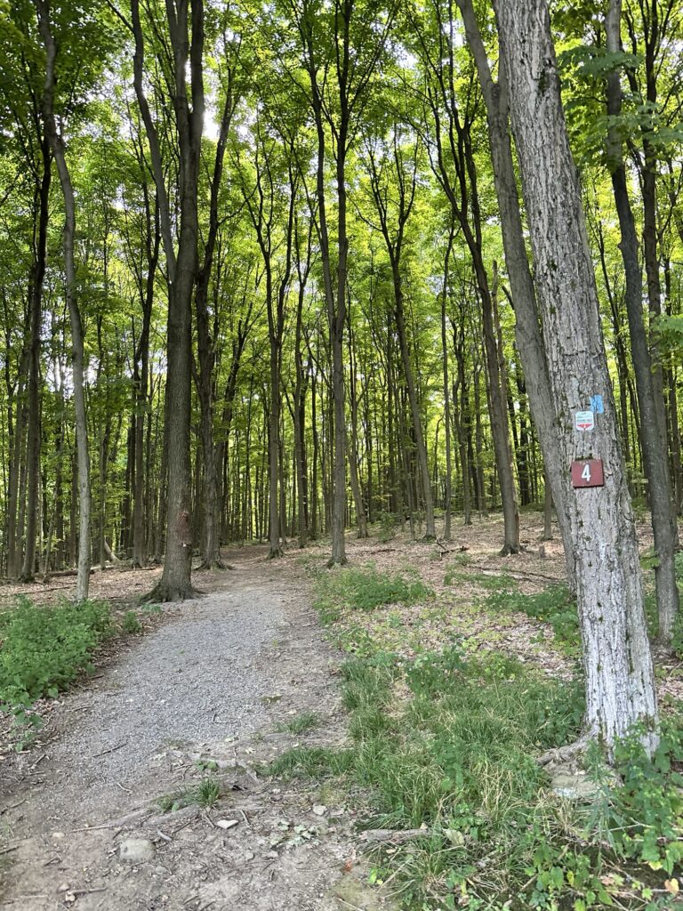 This park is located in Chautauqua County – 2.5 hours southwest of Rochester, NY and 1.5 hours south of Buffalo. Just near the parking lot you can find a pavilion, a large mowed sloped area, and two observation decks with wide views of the surrounding hills and Lake Erie in the distance. There is a beautiful nature trail through the woods. There is a very short loop and a longer loop. The trail signs say that the nature trail is 1 mile long, though my AllTrails app measured about 0.6 miles from the start of the trail at the bottom of the steps to the end of the trail at the road. I then walked up the road back to the parking lot. There are numbered wooden signs throughout the trail that correspond to Natural History Trail Guide. The trail is not stroller friendly, but there is a nice view with a bench from the parking area. There are restrooms, picnic tables, and water fountain at the parking area. Leashed dogs are allowed.