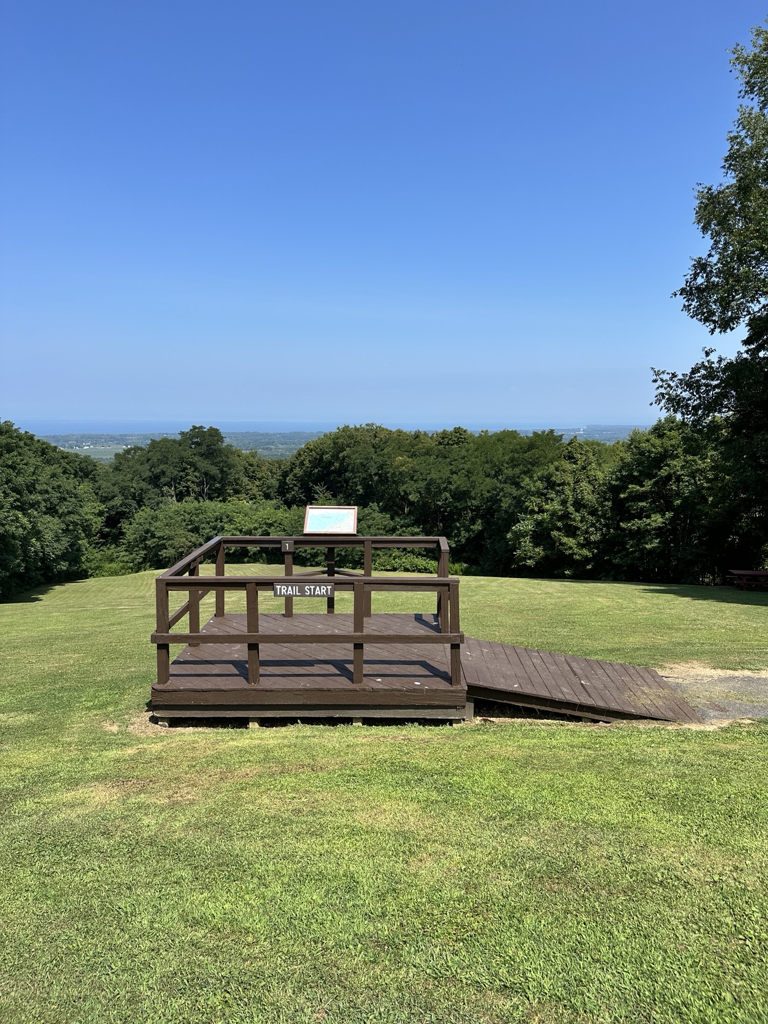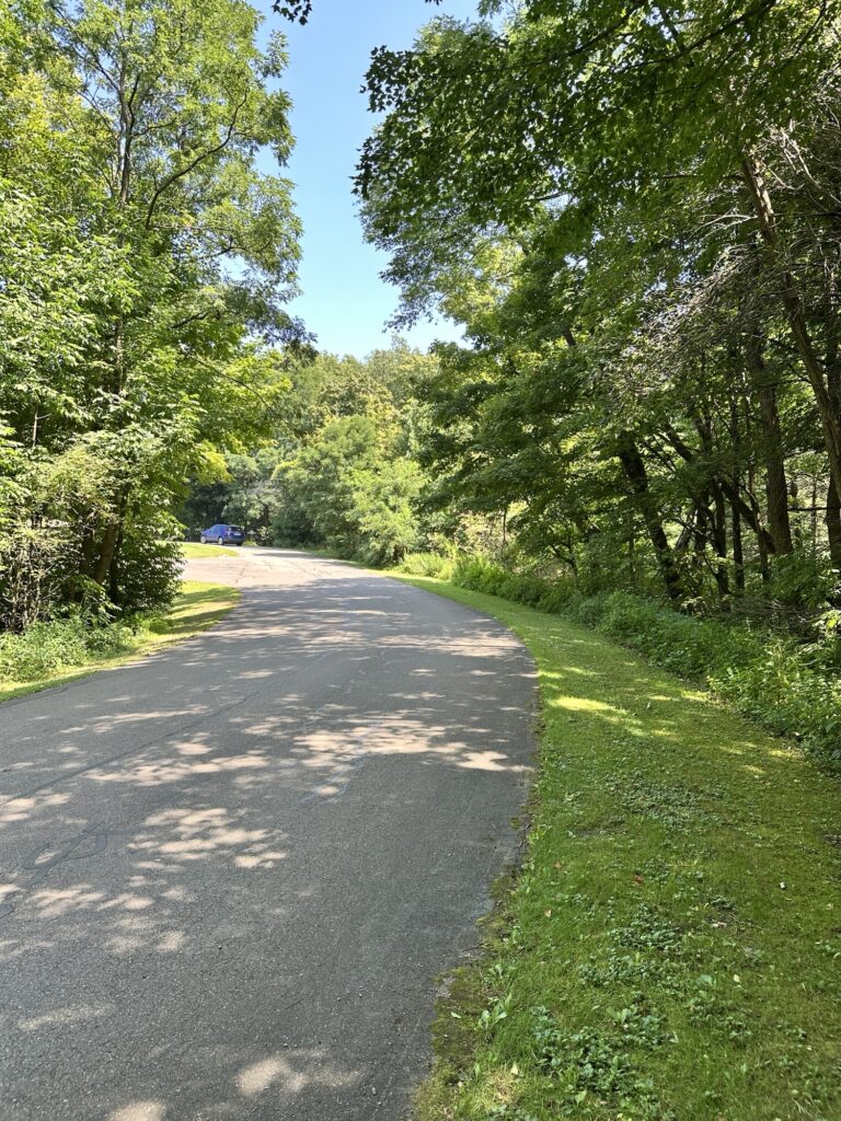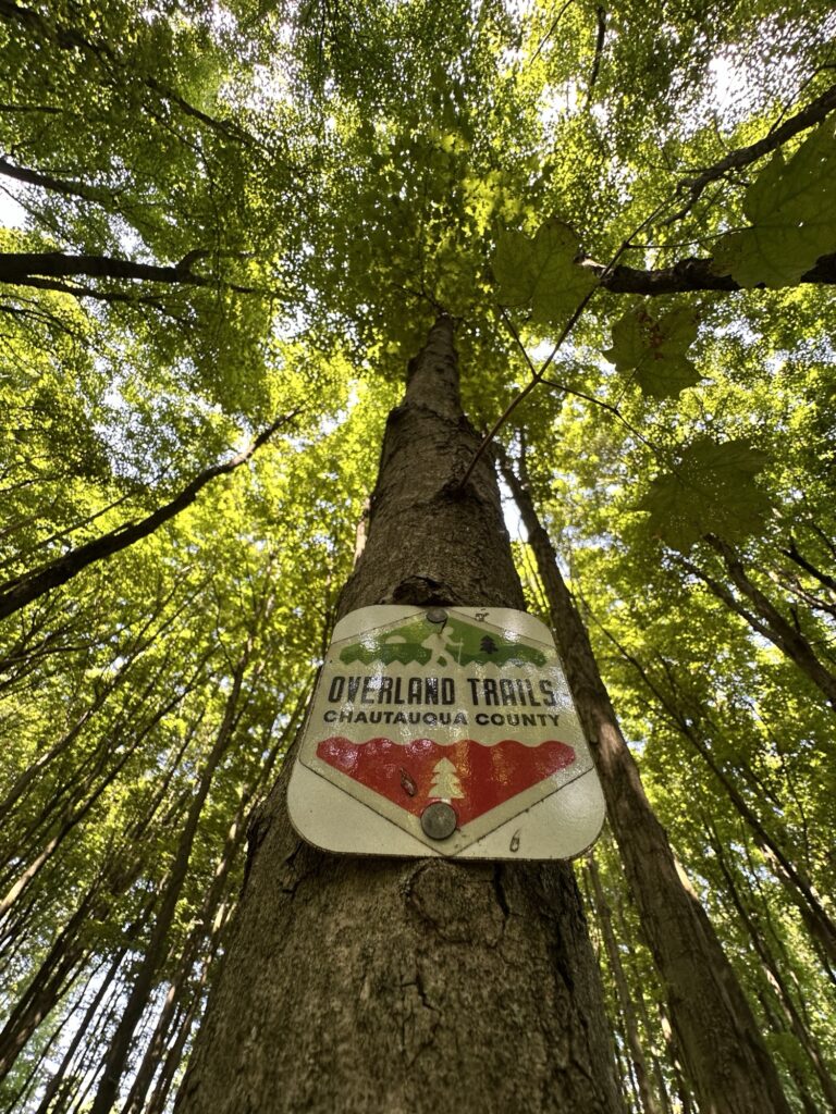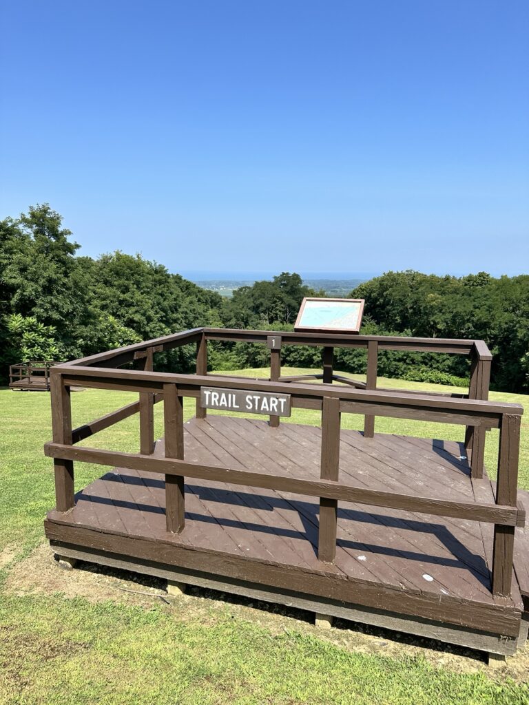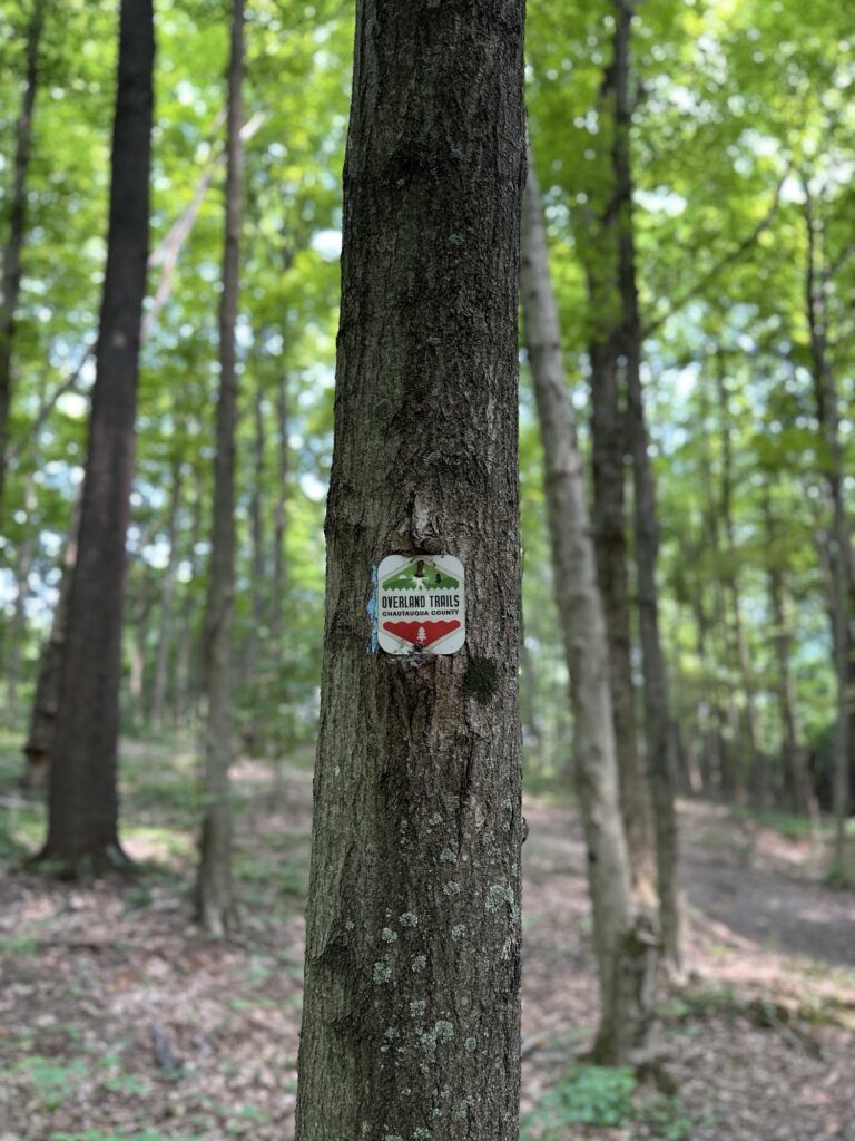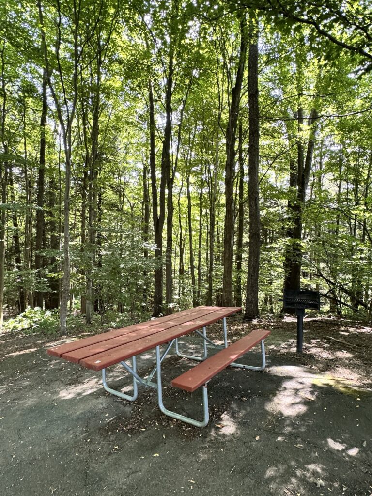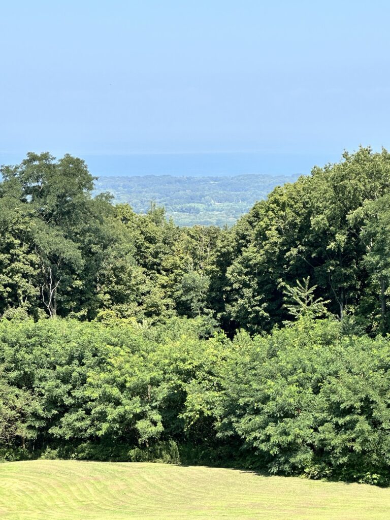 This park is located in Chautauqua County – 2.5 hours southwest of Rochester, NY and 1.5 hours south of Buffalo. Just near the parking lot you can find a pavilion, a large mowed sloped area, and two observation decks with wide views of the surrounding hills and Lake Erie in the distance. There is a beautiful nature trail through the woods. There is a very short loop and a longer loop. The trail signs say that the nature trail is 1 mile long, though my AllTrails app measured about 0.6 miles from the start of the trail at the bottom of the steps to the end of the trail at the road. I then walked up the road back to the parking lot. There are numbered wooden signs throughout the trail that correspond to Natural History Trail Guide. The trail is not stroller friendly, but there is a nice view with a bench from the parking area. There are restrooms, picnic tables, and water fountain at the parking area. Leashed dogs are allowed.