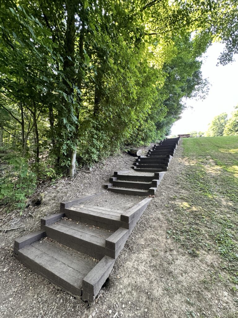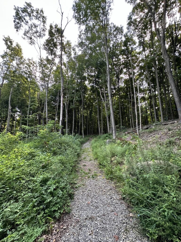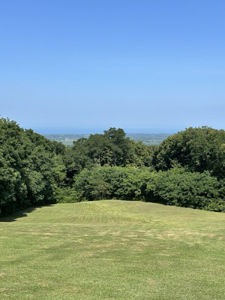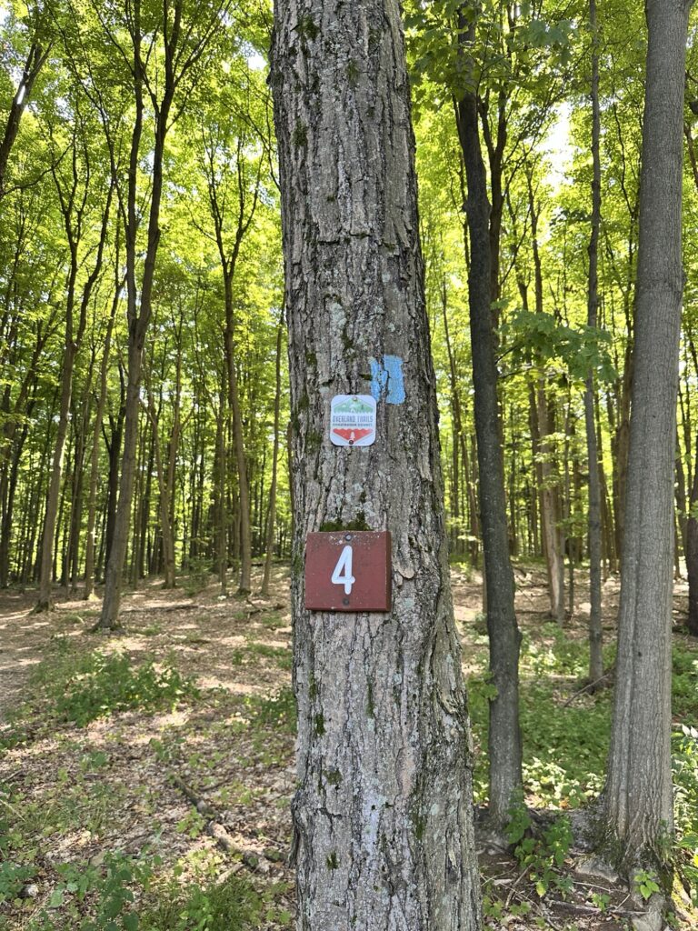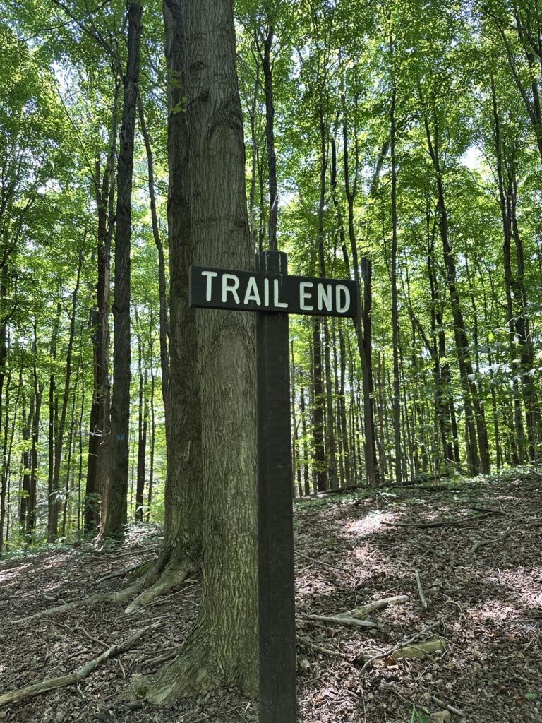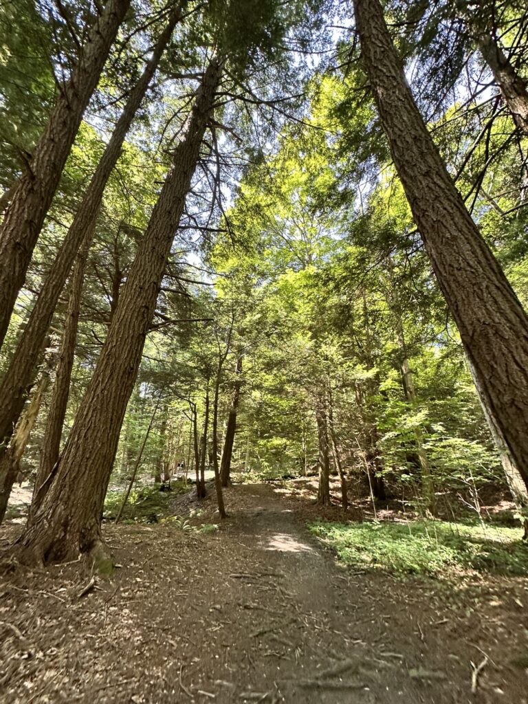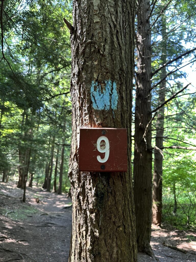 This park is located in Chautauqua County – 2.5 hours southwest of Rochester, NY and 1.5 hours south of Buffalo. Just near the parking lot you can find a pavilion, a large mowed sloped area, and two observation decks with wide views of the surrounding hills and Lake Erie in the distance. There is a beautiful nature trail through the woods. There is a very short loop and a longer loop. The trail signs say that the nature trail is 1 mile long, though my AllTrails app measured about 0.6 miles from the start of the trail at the bottom of the steps to the end of the trail at the road. I then walked up the road back to the parking lot. There are numbered wooden signs throughout the trail that correspond to Natural History Trail Guide. The trail is not stroller friendly, but there is a nice view with a bench from the parking area. There are restrooms, picnic tables, and water fountain at the parking area. Leashed dogs are allowed.