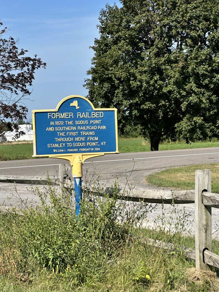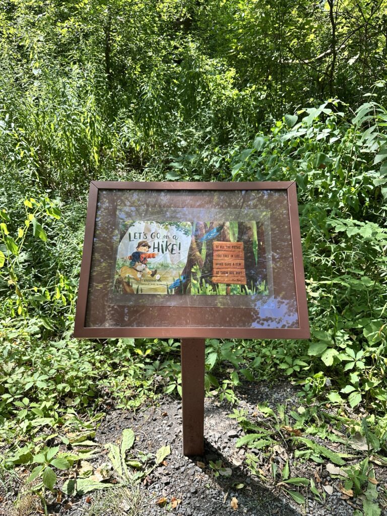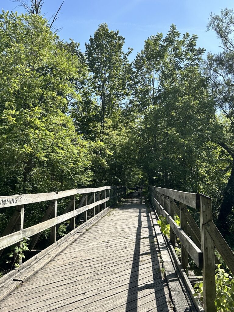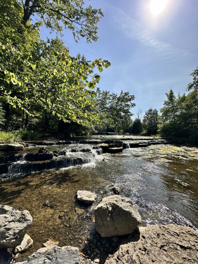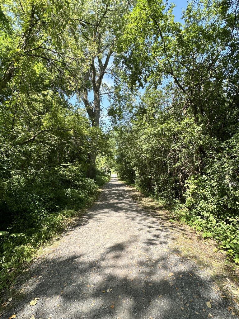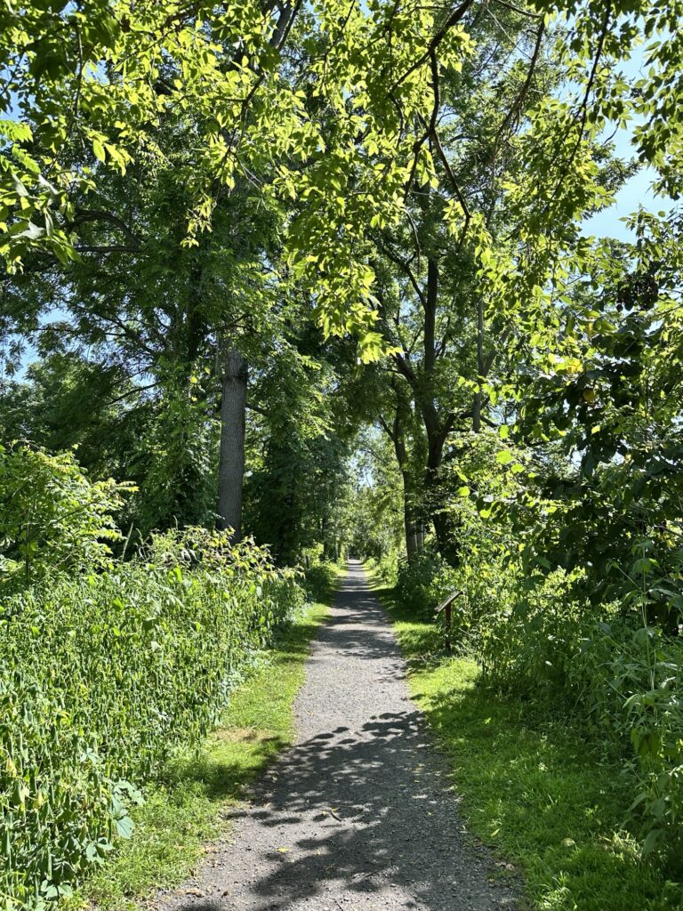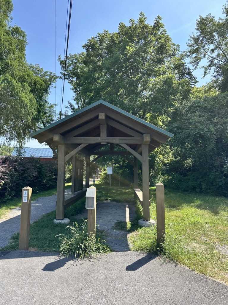 This trailhead of the 25-mile Ontario Pathways rail trail is located 35 minutes east of Rochester, NY. We only hiked a short section of the trail. There was a wooden bridge. After the bridge we saw an unmarked side trail that leads to Double Drop Falls – a lovely waterfall. There was also a StoryWalk on the trail when we visited in August 2025, I am not sure if it is a permanent installation or not. There were also some meadows next to the trail and we saw plenty of butterflies and other wildlife. The path is flat and stroller friendly. Leashed dogs are allowed.