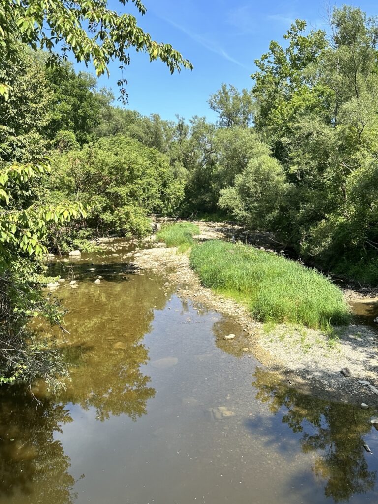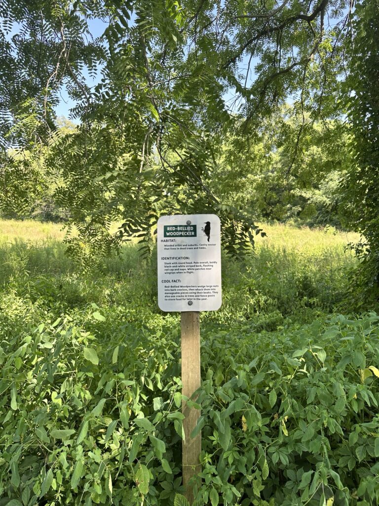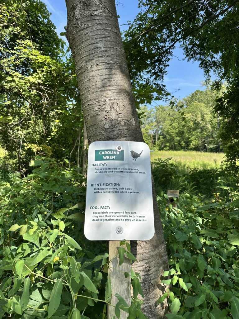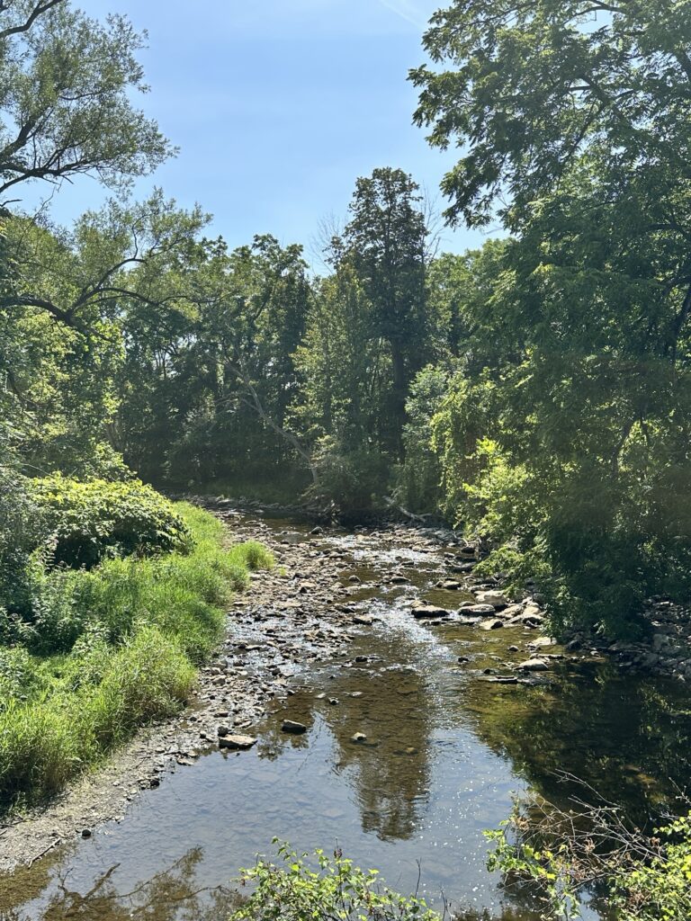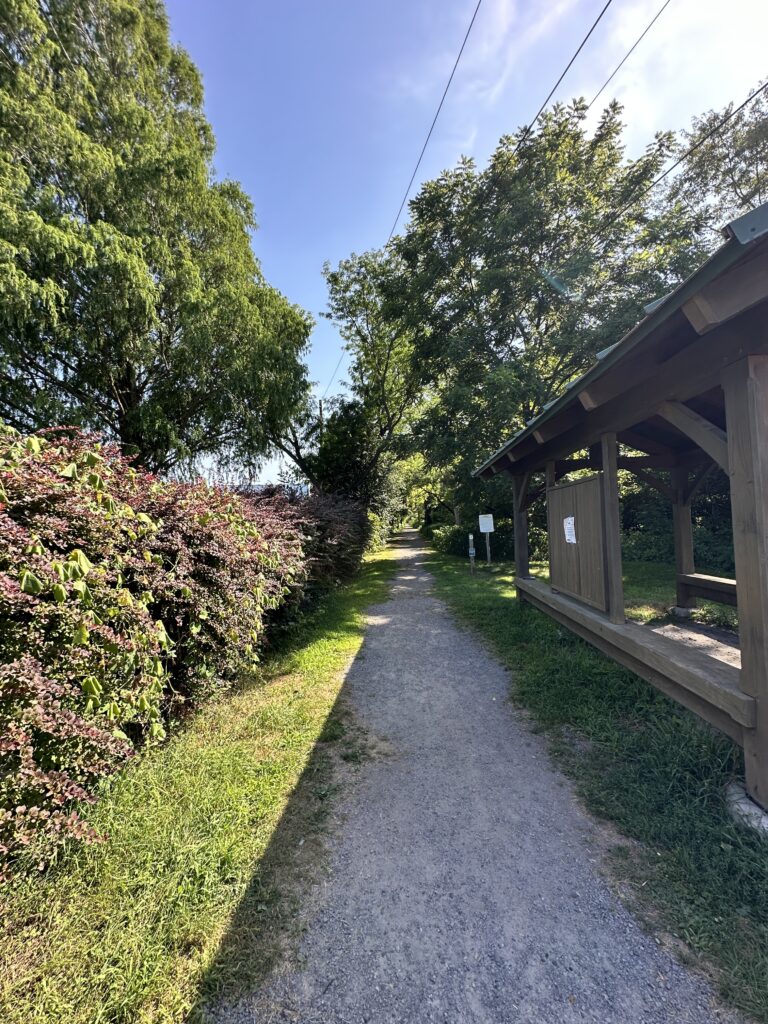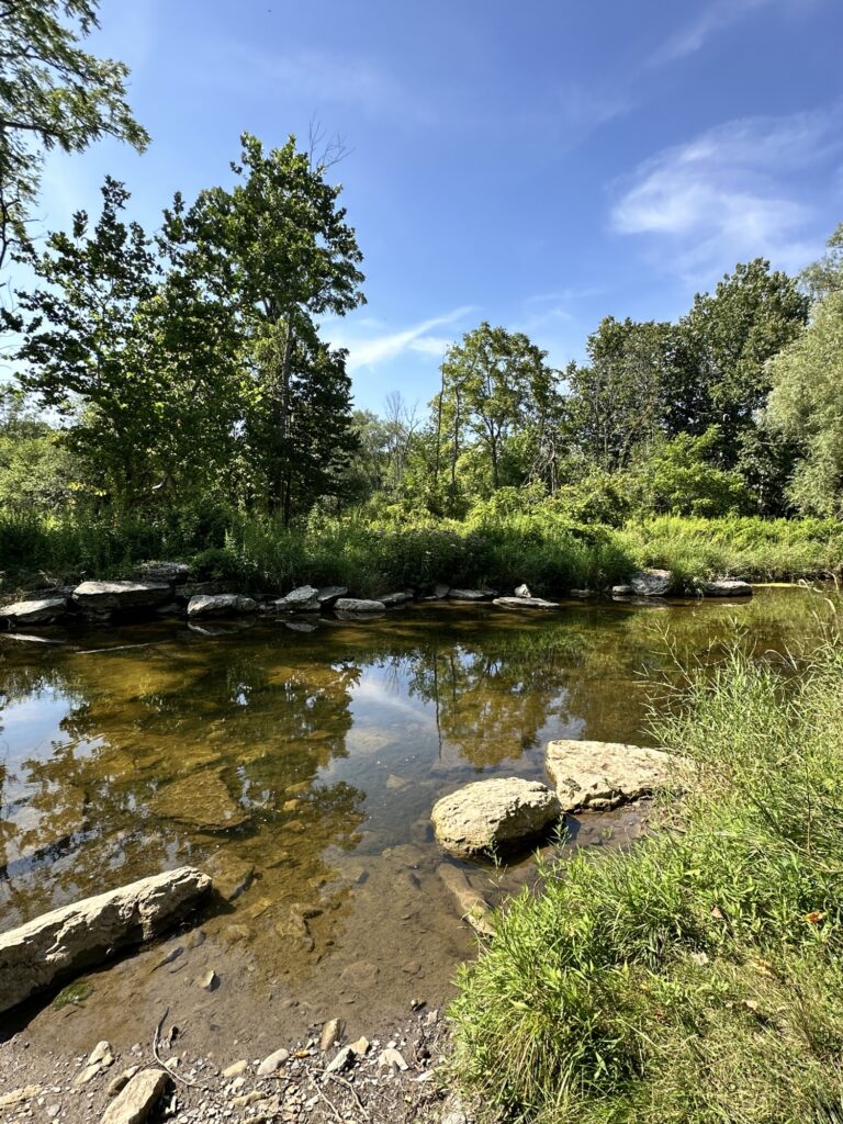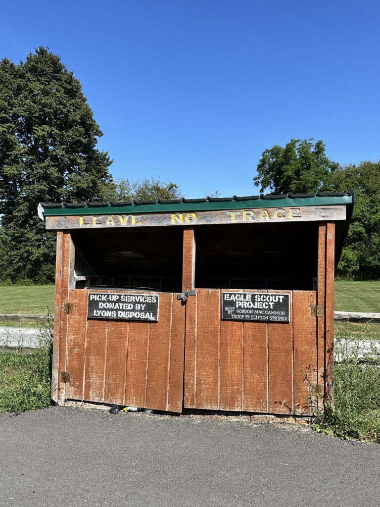This trailhead of the 25-mile Ontario Pathways rail trail is located 35 minutes east of Rochester, NY. We only hiked a short section of the trail. There was a wooden bridge. After the bridge we saw an unmarked side trail that leads to Double Drop Falls – a lovely waterfall. There was also a StoryWalk on the trail when we visited in August 2025, I am not sure if it is a permanent installation or not. There were also some meadows next to the trail and we saw plenty of butterflies and other wildlife. The path is flat and stroller friendly. Leashed dogs are allowed.