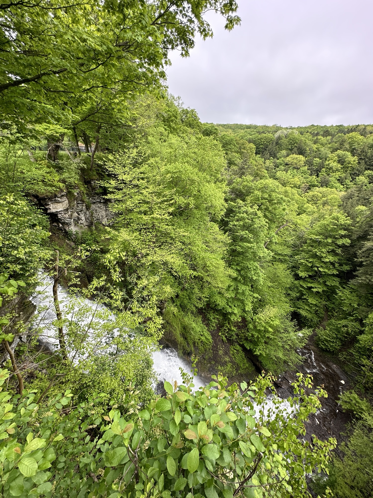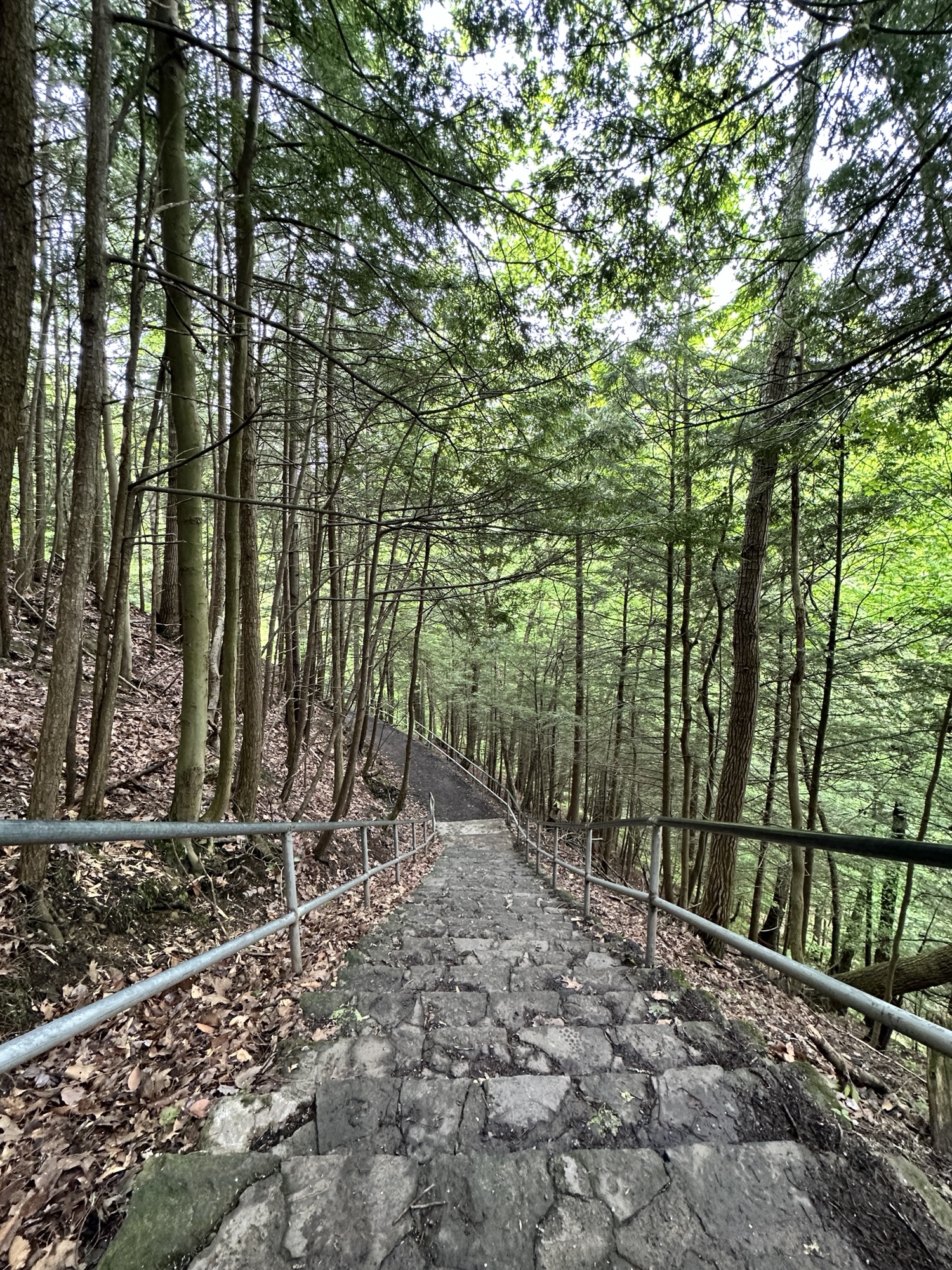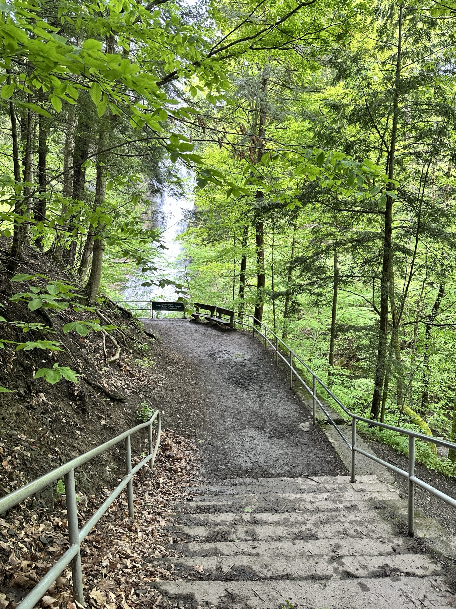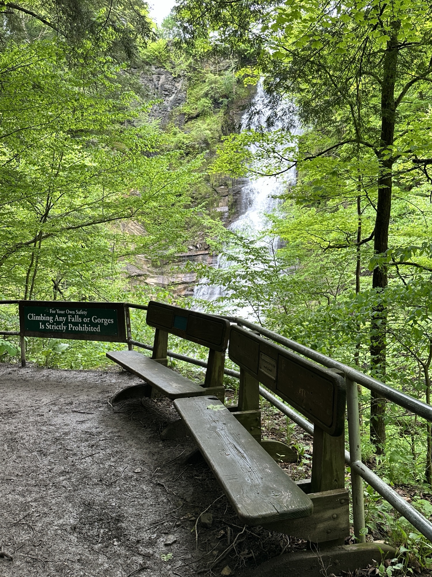 This beautiful park features a waterfall and pond and is located near Syracuse, roughly 2 hours east of Rochester, NY. This park features a 137 foot waterfall and is the site of Onondaga County’s first mill operation in 1796. We wandered around the beautiful ponds, checked out the accessible viewpoint over the falls and informational signs, and then hiked the 0.6 mile trail down to the viewpoint below the falls (which included stairs with railings). The waterfall was impressive and so peaceful! Be sure not to climb the gorges or waterfalls in this park and follow all posted signs for your own safety. The trail down to the waterfall is not stroller friendly. Near the main parking area are restrooms, a few pieces of play equipment, fields, as well as a picnic area underneath some evergreen trees.