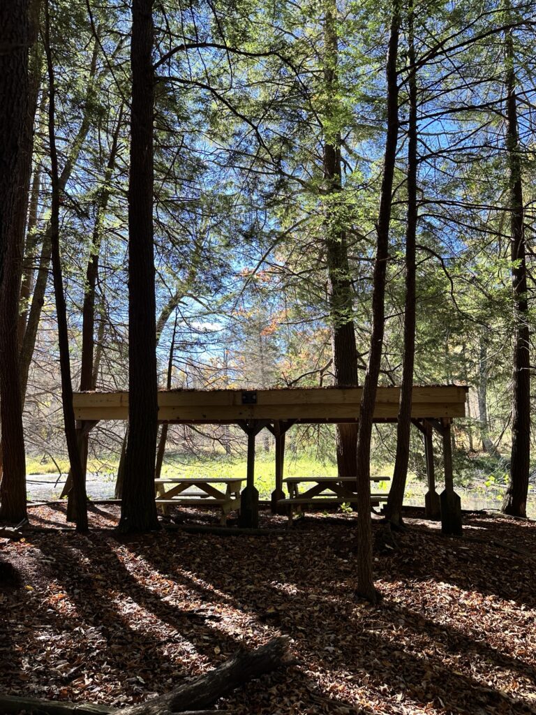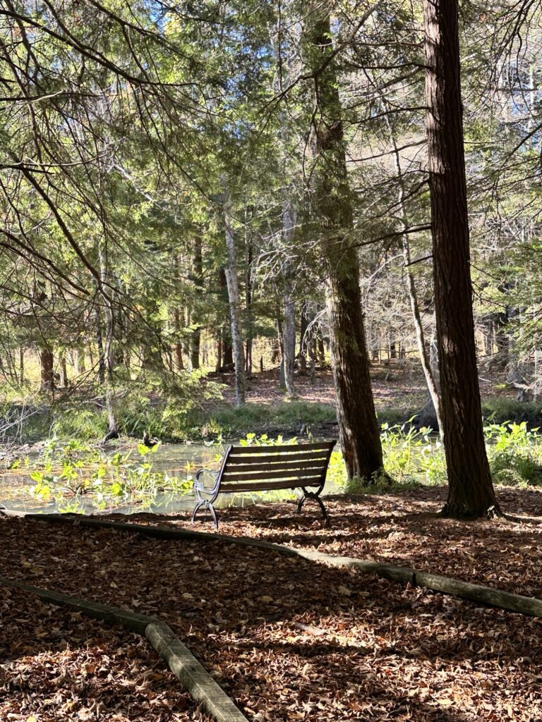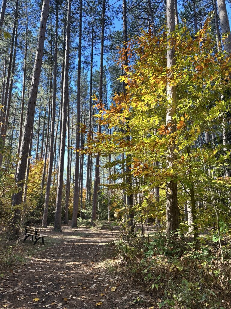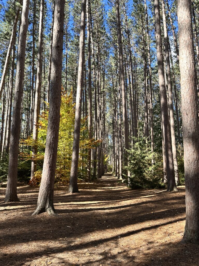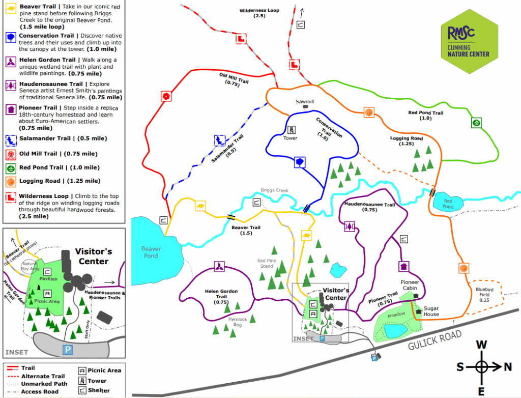 RMSC Cumming Nature Center is located an hour south of Rochester, NY. The Beaver Trail is a 1.5 mile loop trail starts with a walk through the picturesque red pine stand. The trail follows a creek and passes through marsh and meadow habitats and leads to a 35-acre beaver pond. The path through the red pine stand is stroller friendly, but beyond that there are roots and uneven surfaces that would make it less stroller friendly.