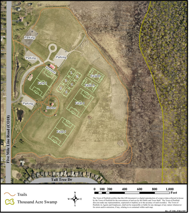 This park is located 15 minutes east of Rochester, NY. There is a ~1 mile flat, stroller-friendly gravel walking path around the perimeter of the park and a QR Fit Trail. There is an inclusive playground (with recycled rubber safety surfacing that is wheelchair accessible) as well as a dinosaur theme “JACK’S Pace Playground.” There are sports fields, seasonal public restrooms, and picnic pavilions. Across the street is Irene Gossin Nature Preserve.