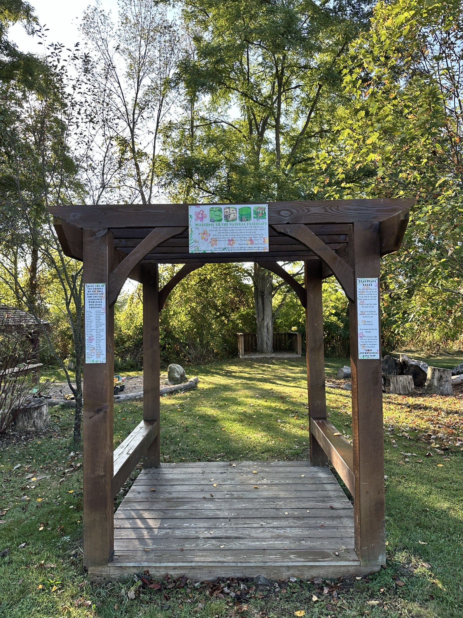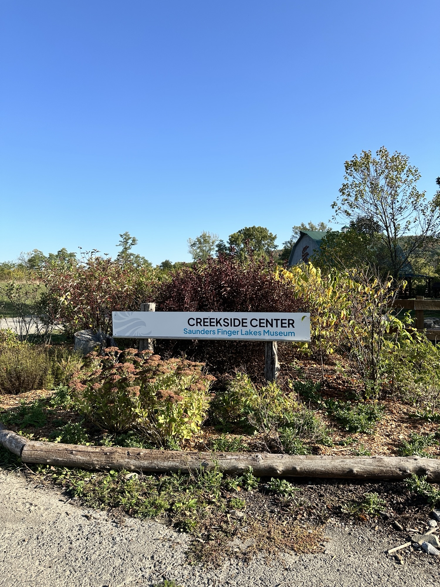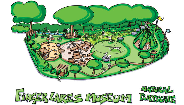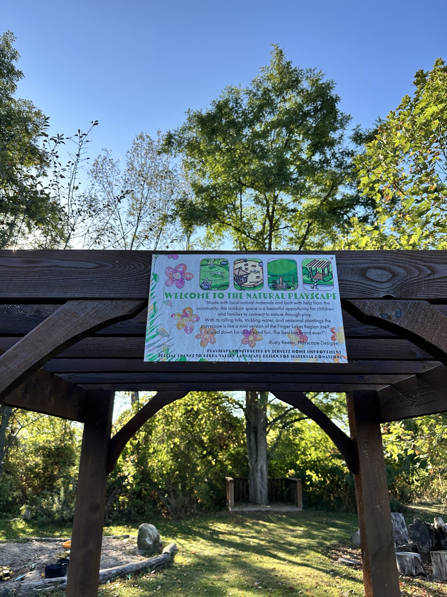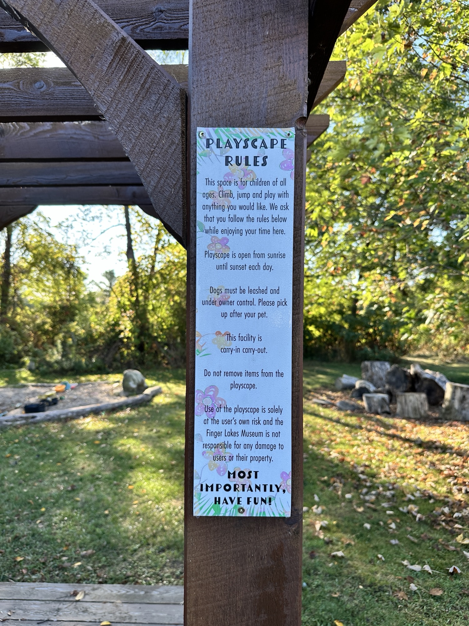 The Saunders Finger Lakes Museum is located 1 hour southeast of Rochester, NY. There are nature trails, a kayak launch, story walk, and a natural playscape. Other exhibits are currently under construction. The natural playscape is a fun spot for children to play with natural elements. There is a sand box, an area with logs to balance and hop on, a small hill, and a small structure to go inside. The playscape is right near the StoryWalk.