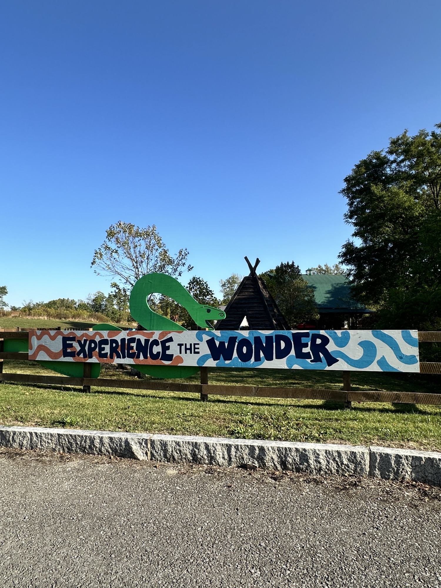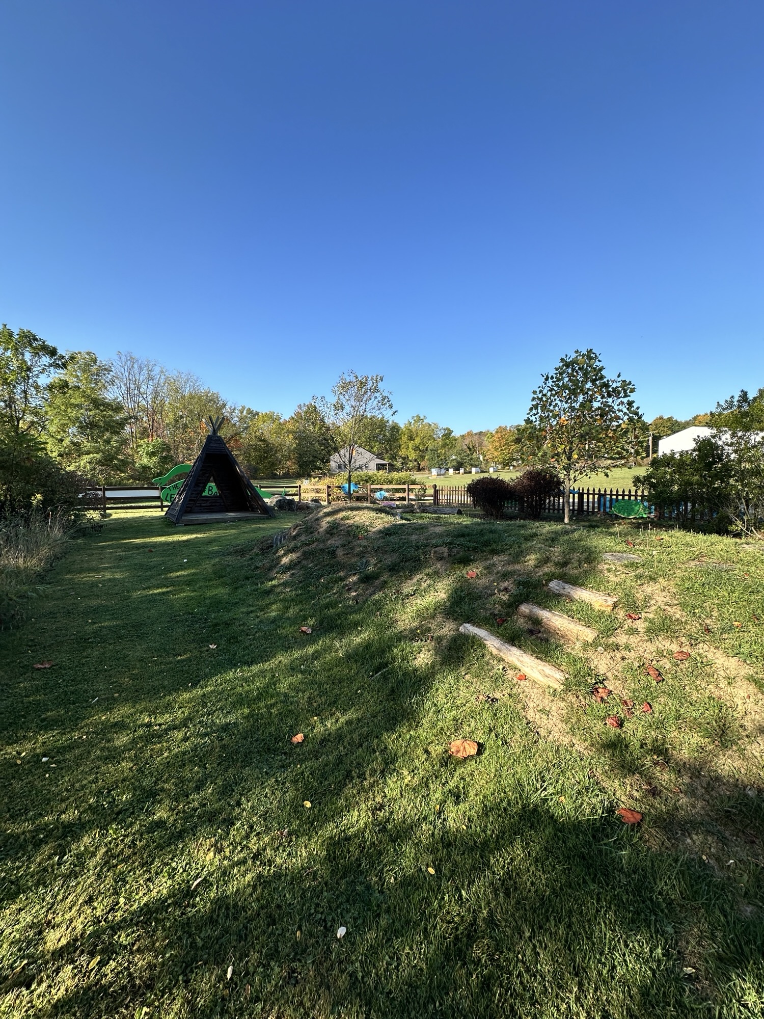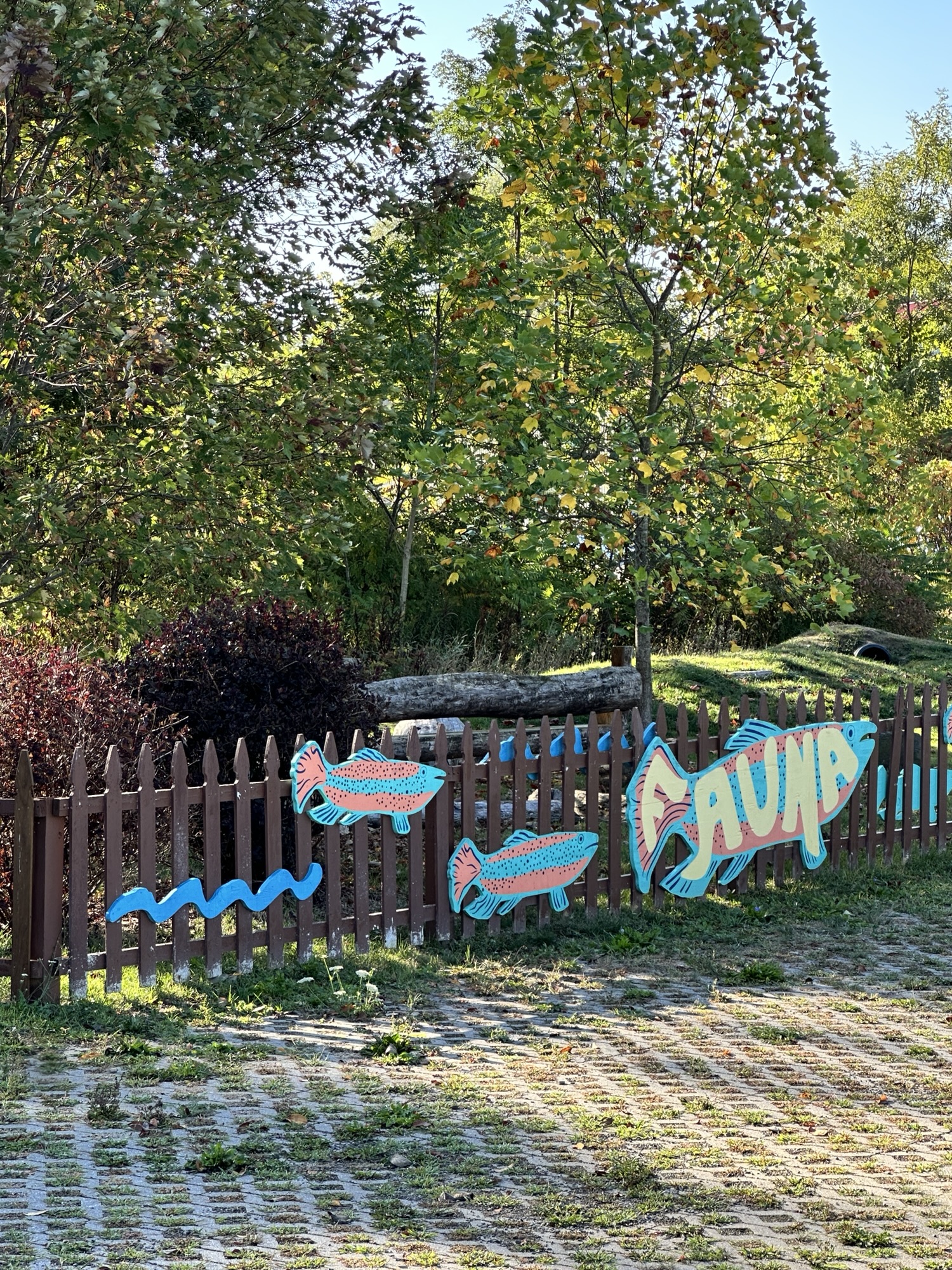 The Saunders Finger Lakes Museum is located 1 hour southeast of Rochester, NY. There are nature trails, a kayak launch, story walk, and a natural playscape. Other exhibits are currently under construction. The natural playscape is a fun spot for children to play with natural elements. There is a sand box, an area with logs to balance and hop on, a small hill, and a small structure to go inside. The playscape is right near the StoryWalk.