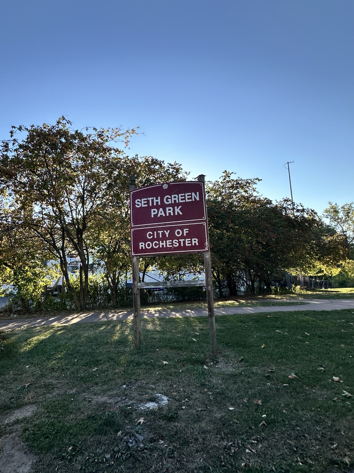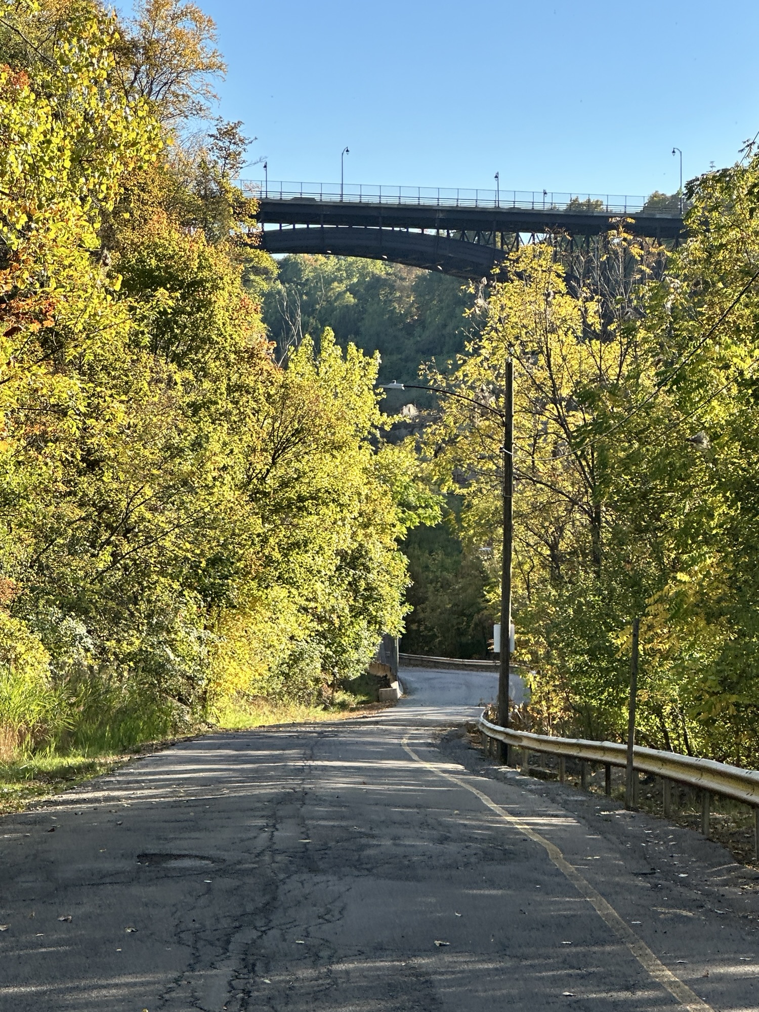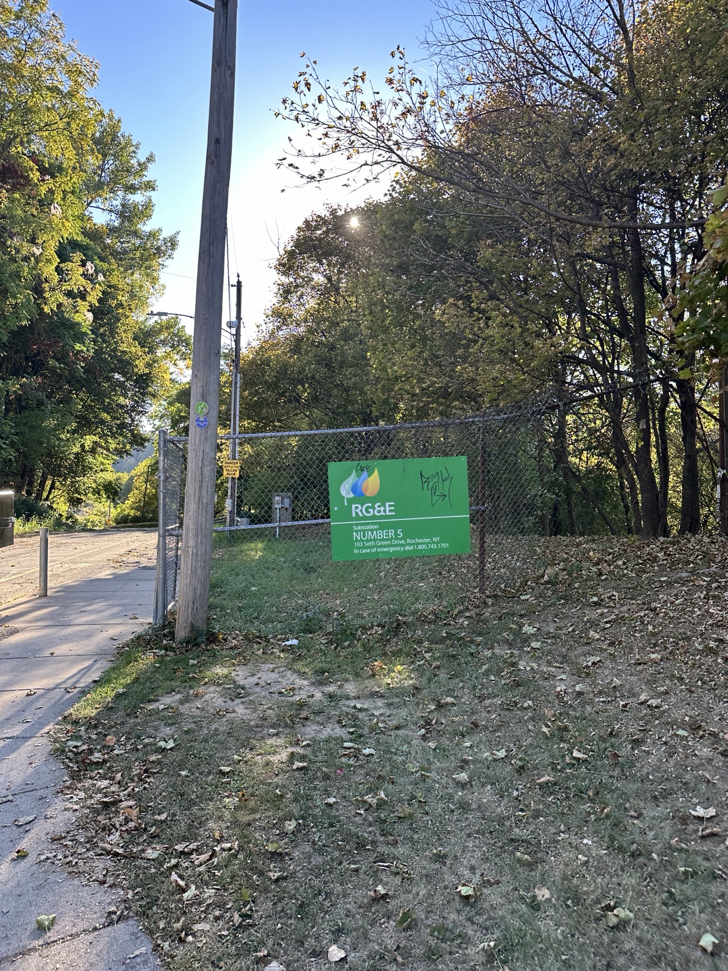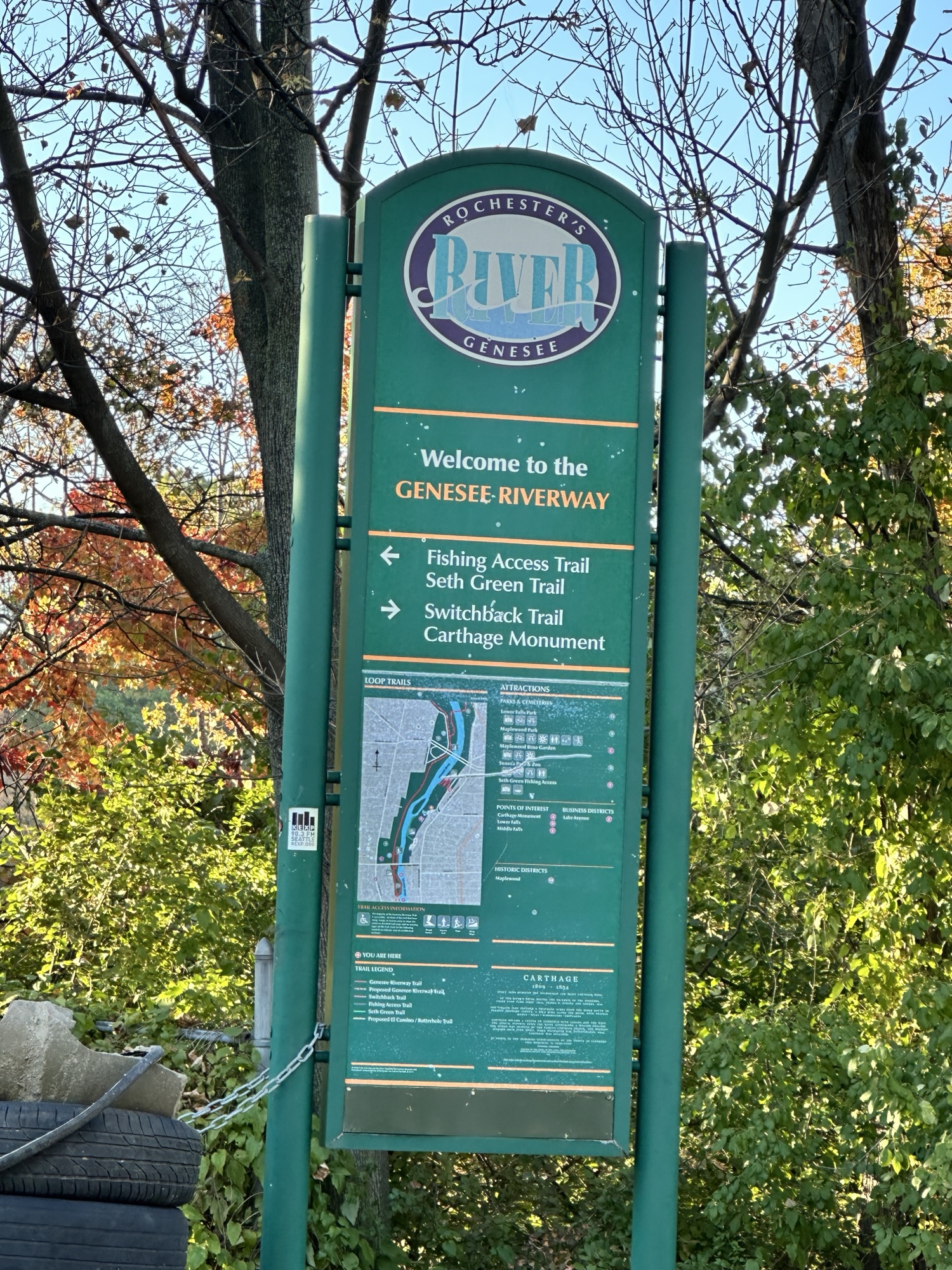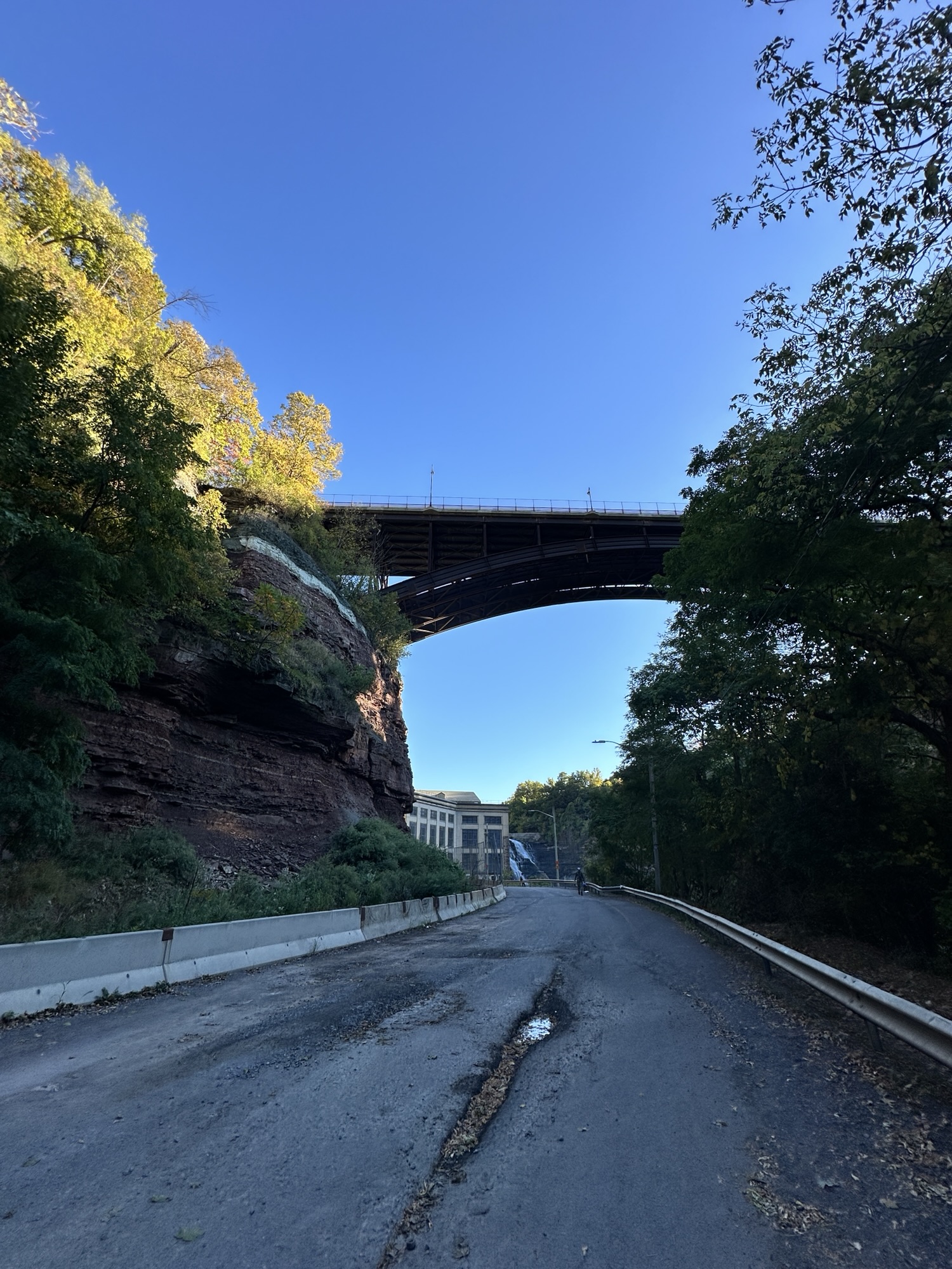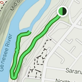 This trail is located in the City of Rochester. There is a parking lot located at Seth Green Park. There is a gate that closes the road from public traffic from here, so you need to walk down the road (watch for vehicles and for falling rocks). After about 0.3 miles, there is a trail that turns right into the woods. This trail leads to a beautiful view of the Genesee River with great reflections, especially in the fall. If you go back tot he road and continue down hill, you will see Driving Park Bridge above you and some very old layers of sedimentary rocks. Continue to the power plant for views of Lower Falls. The path along the road is stroller friendly but the dirt trail is not.