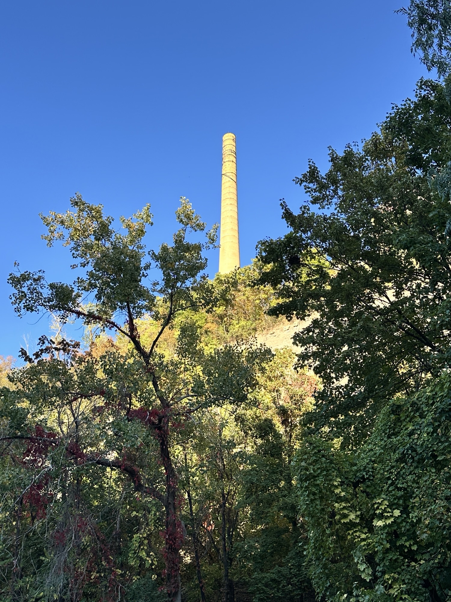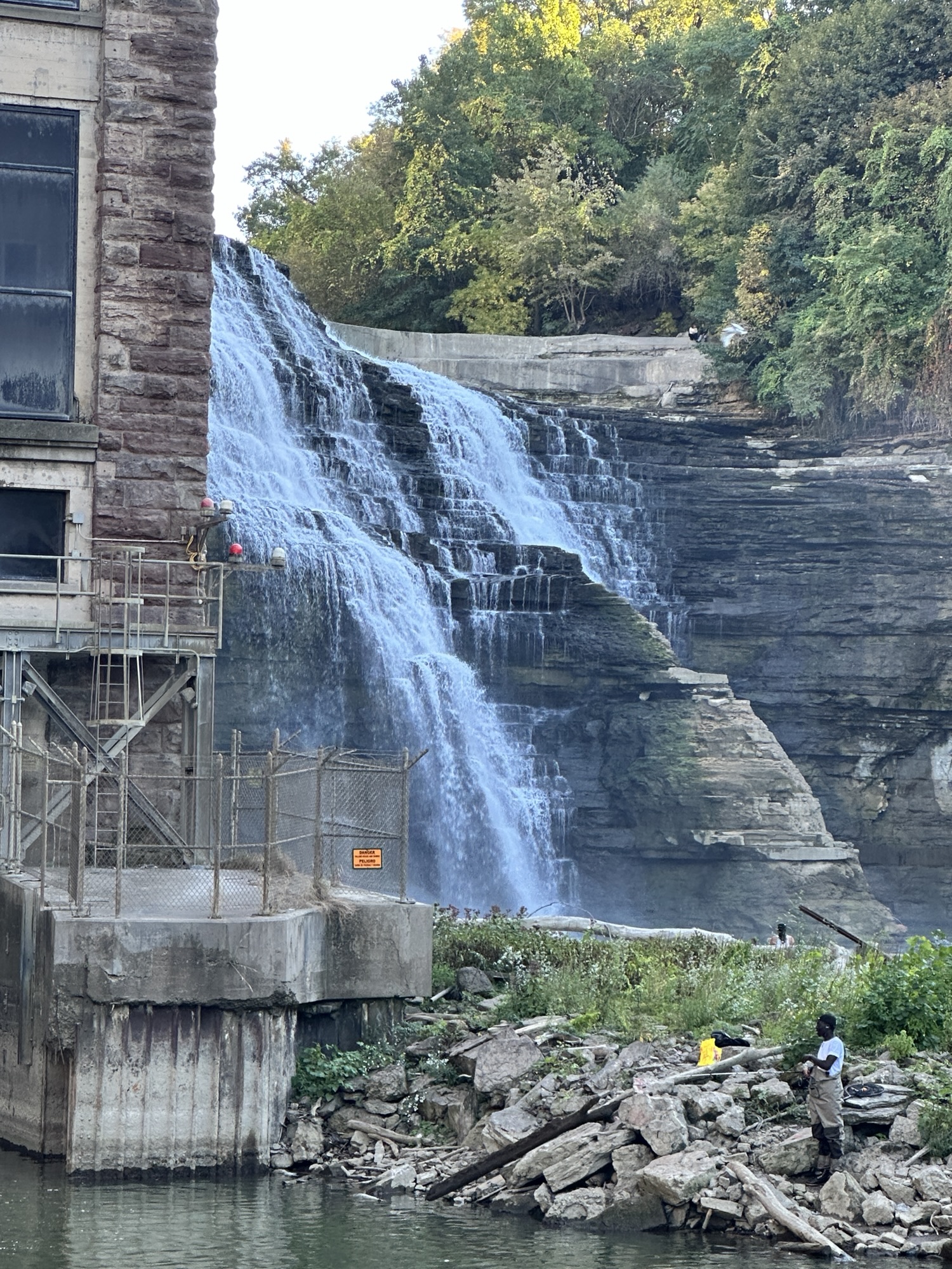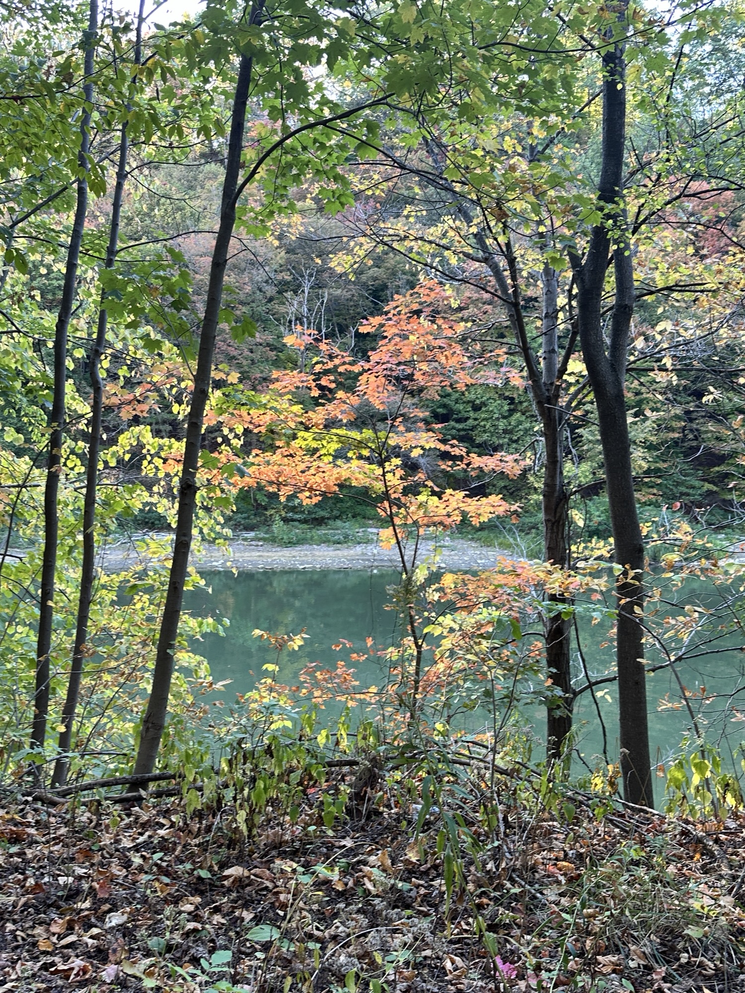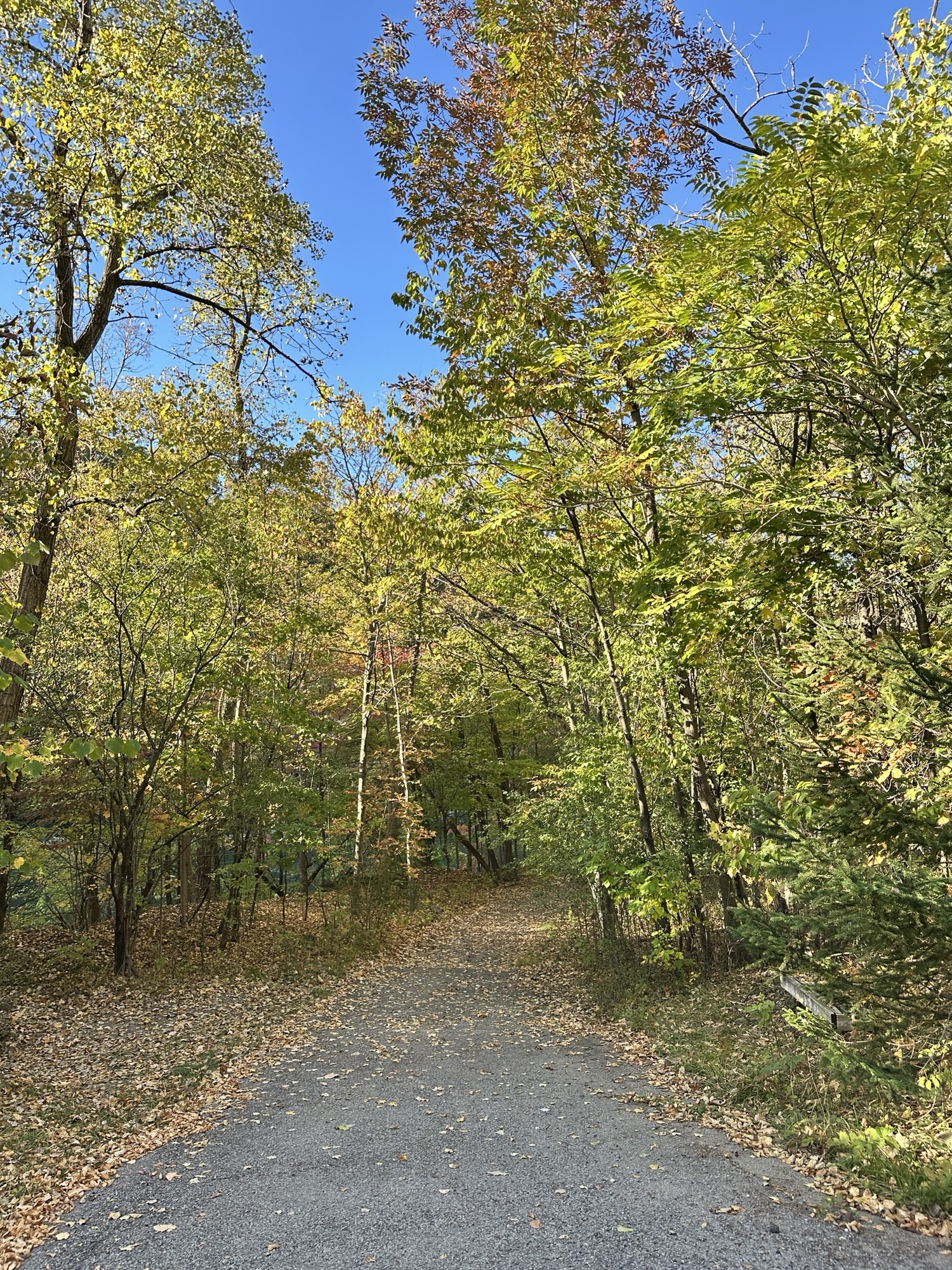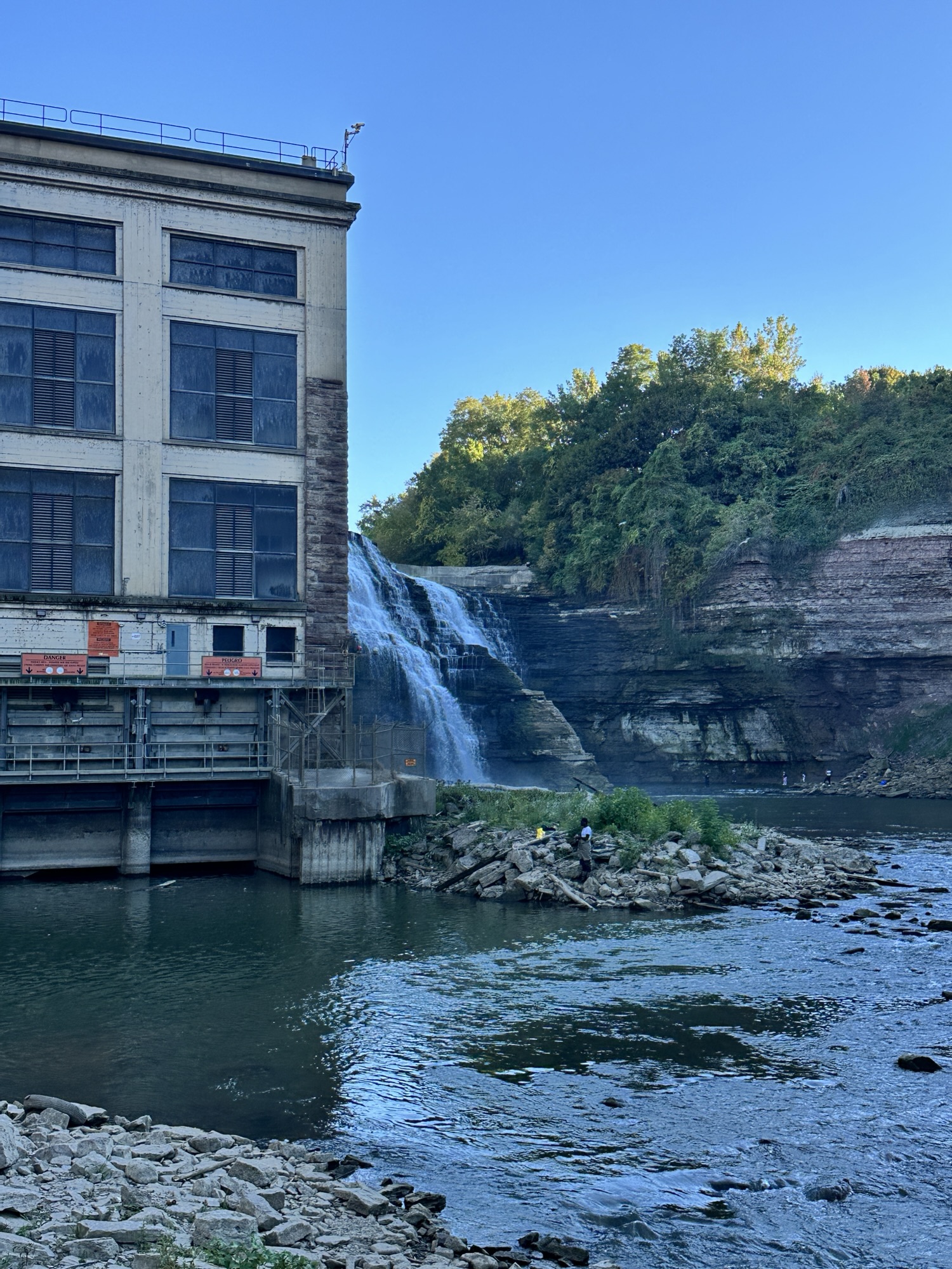This trail is located in the City of Rochester. There is a parking lot located at Seth Green Park. There is a gate that closes the road from public traffic from here, so you need to walk down the road (watch for vehicles and for falling rocks). After about 0.3 miles, there is a trail that turns right into the woods. This trail leads to a beautiful view of the Genesee River with great reflections, especially in the fall. If you go back tot he road and continue down hill, you will see Driving Park Bridge above you and some very old layers of sedimentary rocks. Continue to the power plant for views of Lower Falls. The path along the road is stroller friendly but the dirt trail is not.