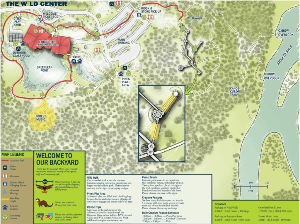 The Wild Center also features a Wild Walk in the treetops, Forest Music Trail, Greenleaf Pond, pollinator gardens, indoor exhibits, live animals, and more! Dogs are NOT allowed at the Wild Center except for service animals.