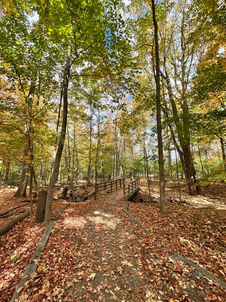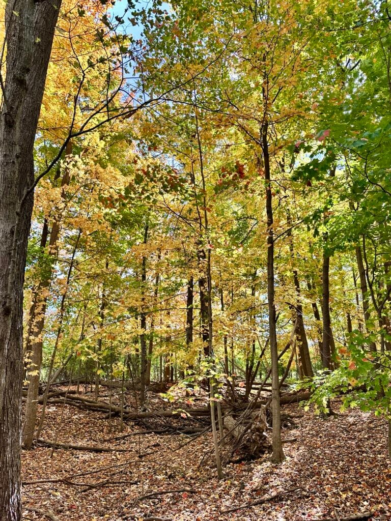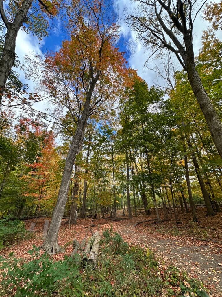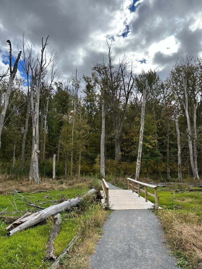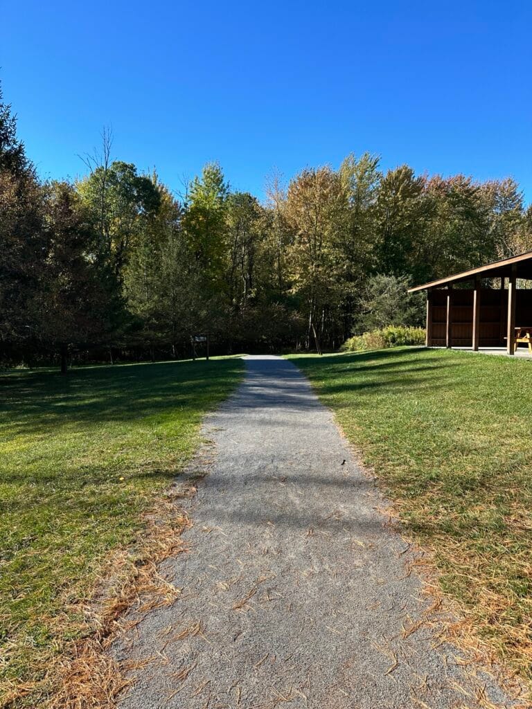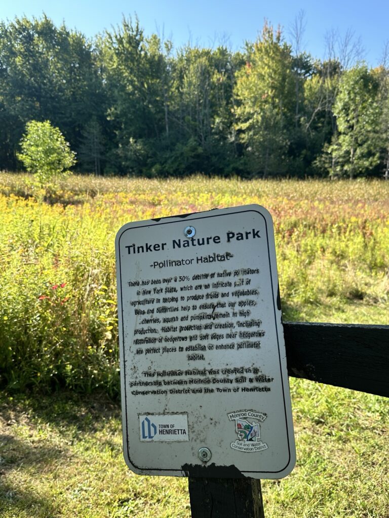 This is a beautiful park located 15 minutes south of Rochester, NY. The woodland trail is the outer loop, shown in the map below. The loop is 1.2 miles via the exercise path or 0.78 miles long if you take the cut through path along the boardwalk next to the pond. The trail goes through a beautiful wooded area as well as wetlands, a pond with a gazebo, a wildlife viewing blind, a wildflower meadow, a nature center, restrooms, a playground, and more! You can park at the main parking lot near the restrooms and visitor center or near the Tyler Pavilion and playground. Dogs are NOT allowed at Tinker Nature Park.